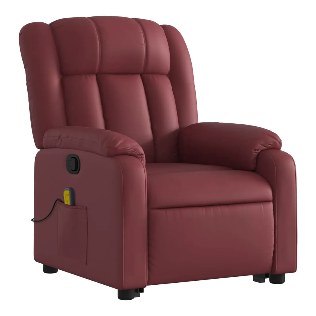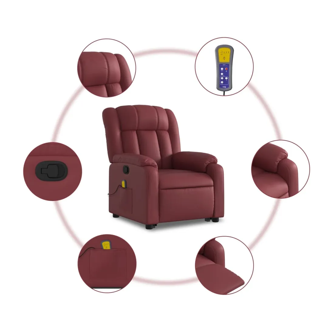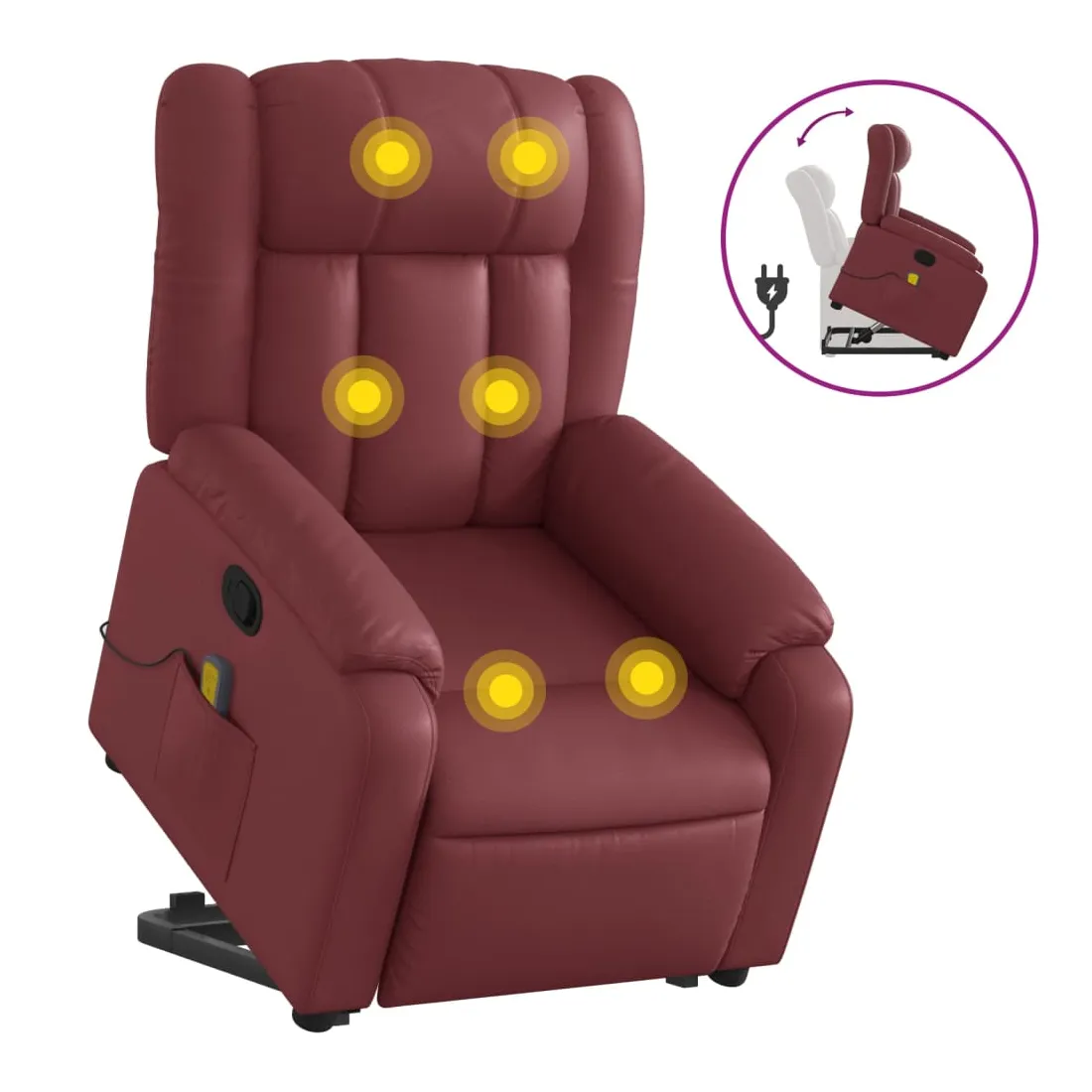 Asseyez-vous et détendez-vous dans ce fauteuil inclinable de massage très confortable ! Fonction de levage électrique : ce fauteuil inclinable pour personnes âgées est équipé d'un moteur électrique pour la fonction de levage. Grâce à la fonction qui pousse toute la chaise vers le haut, vous pouvez facilement vous tenir debout sans stresser votre dos et vos genoux en appuyant simplement sur le bouton.Fonction d'inclinaison manuelle : ce fauteuil inclinable est doté d'une poignée du côté droit. Vous pouvez régler manuellement le repose-pieds et le dossier dans n'importe quelle position selon votre confort en tirant simplement sur la poignée. Cette fonction permet une inclinaison maximale de 135 degrés. De plus, le dossier peut revenir rapidement à sa position d'origine en tirant simplement sur la poignée.Fonction de vibration : les 6 points de massage vous permettent de faire l'expérience d'un massage mieux ciblé. De plus, la télécommande incluse vous permet de choisir différents programmes de massage. La fonction de massage est alimentée par le connecteur USB qui nécessite une source d'alimentation USB certifiée de 5 V (non fournie).Expérience de siège confortable : le siège, le dossier et les larges accoudoirs rembourrés épais recouverts de similicuir procurent une sensation confortable et chaleureuse, vous faisant vous sentir enlacé lorsque vous êtes assis. Le simili cuir est un matériau très résistant. Il est résistant aux taches, ce qui le rend facile à nettoyer avec un chiffon humide. La surface lisse donne également un aspect luxueux et la beauté du cuir véritable.Poche latérale pratique : ce fauteuil est doté d'une poche latérale pour ranger votre télécommande ou garder vos objets essentiels à portée de main.Cadre solide et stable : le cadre en bois et en métal offre une structure solide et une grande stabilité. Ce fauteuil inclinable est confortable et durable.