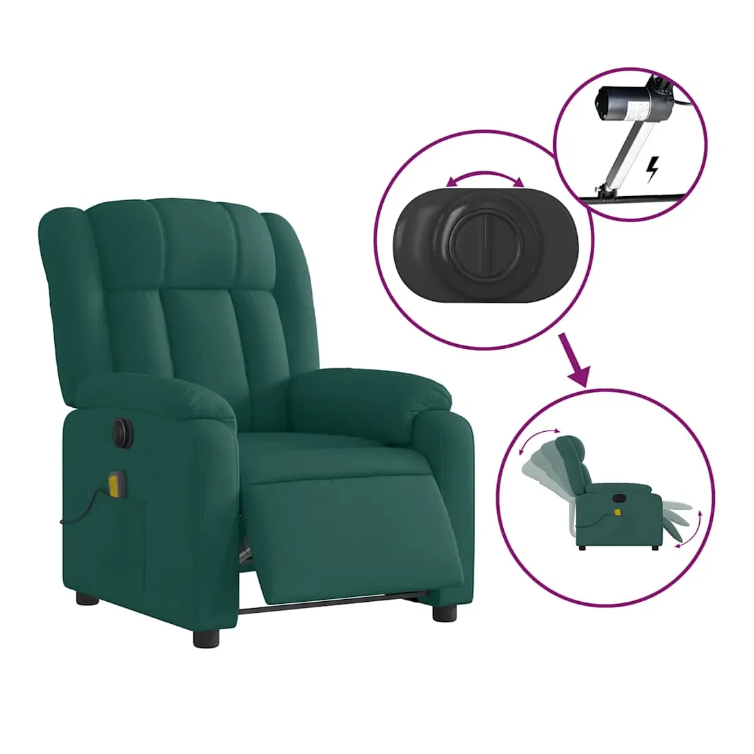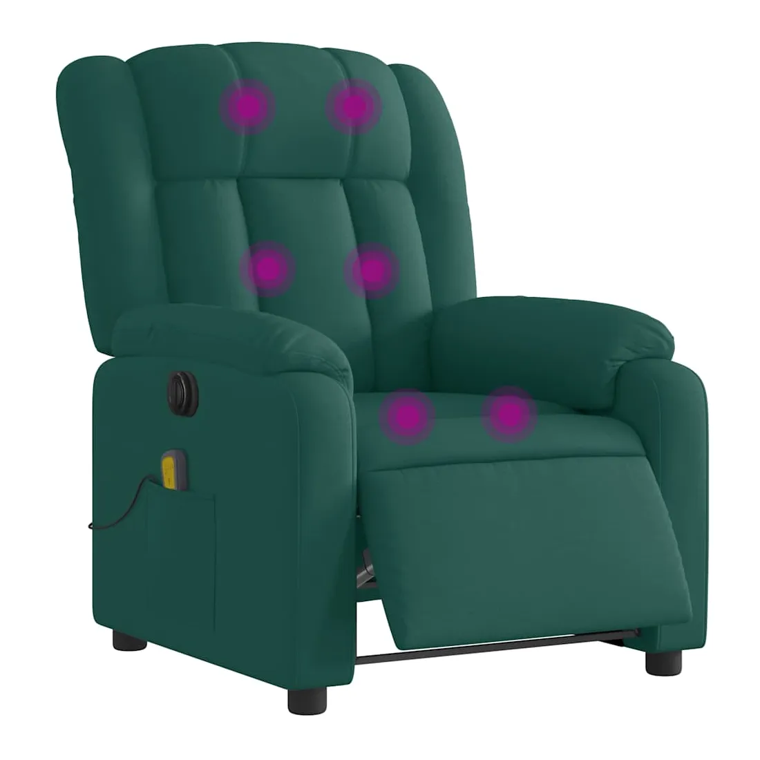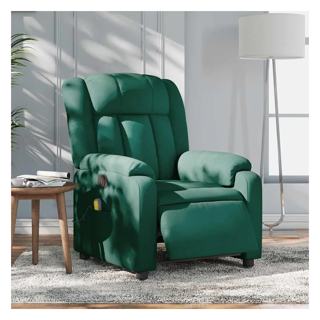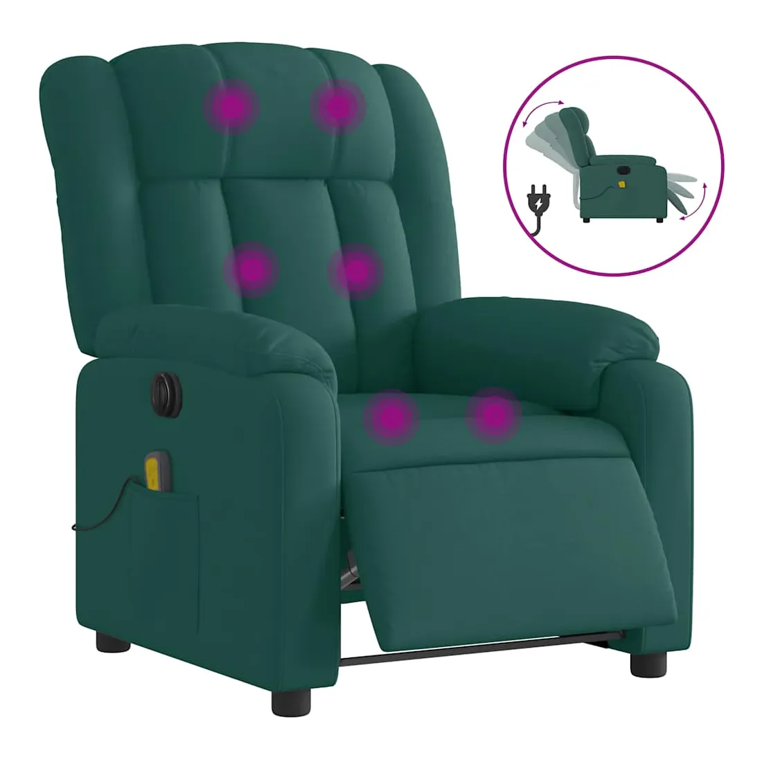 Asseyez-vous et détendez-vous dans ce fauteuil inclinable de massage électrique très confortable ! Fonction d'inclinaison électrique : ce fauteuil inclinable est équipé d'un moteur électrique qui permet de régler automatiquement le repose-pied et le dossier dans n'importe quelle position, selon votre confort, en appuyant simplement sur le bouton situé sur le côté du fauteuil. Cette fonction permet une inclinaison maximale de 135 degrés. En outre, le dossier peut revenir automatiquement à sa position d'origine par une simple pression sur le bouton. Fonction de vibration : les 6 points de massage vous permettent de faire l'expérience d'un massage mieux ciblé. De plus, la télécommande incluse vous permet de choisir différents programmes de massage. La fonction de massage est alimentée par le connecteur USB qui nécessite une source d'alimentation USB certifiée de 5 V (non fournie). Expérience d'assise confortable : le siège, le dossier et les larges accoudoirs bien rembourrés recouverts de tissu procurent une sensation confortable et chaleureuse, vous permettant de vous sentir enveloppé lorsque vous êtes assis. Le tissu présente un aspect simple et épuré et est respirant et durable. Poche latérale pratique : ce fauteuil est doté d'une poche latérale pour ranger votre télécommande ou garder vos objets essentiels à portée de main. Cadre solide et stable : le cadre en bois et en métal offre une structure solide et une grande stabilité. Ce fauteuil inclinable est confortable et durable.