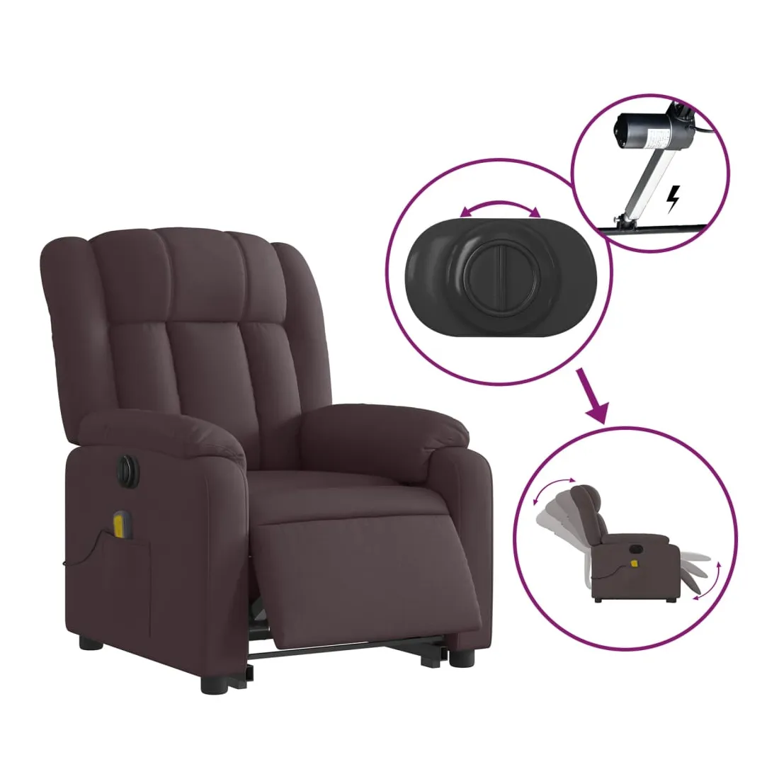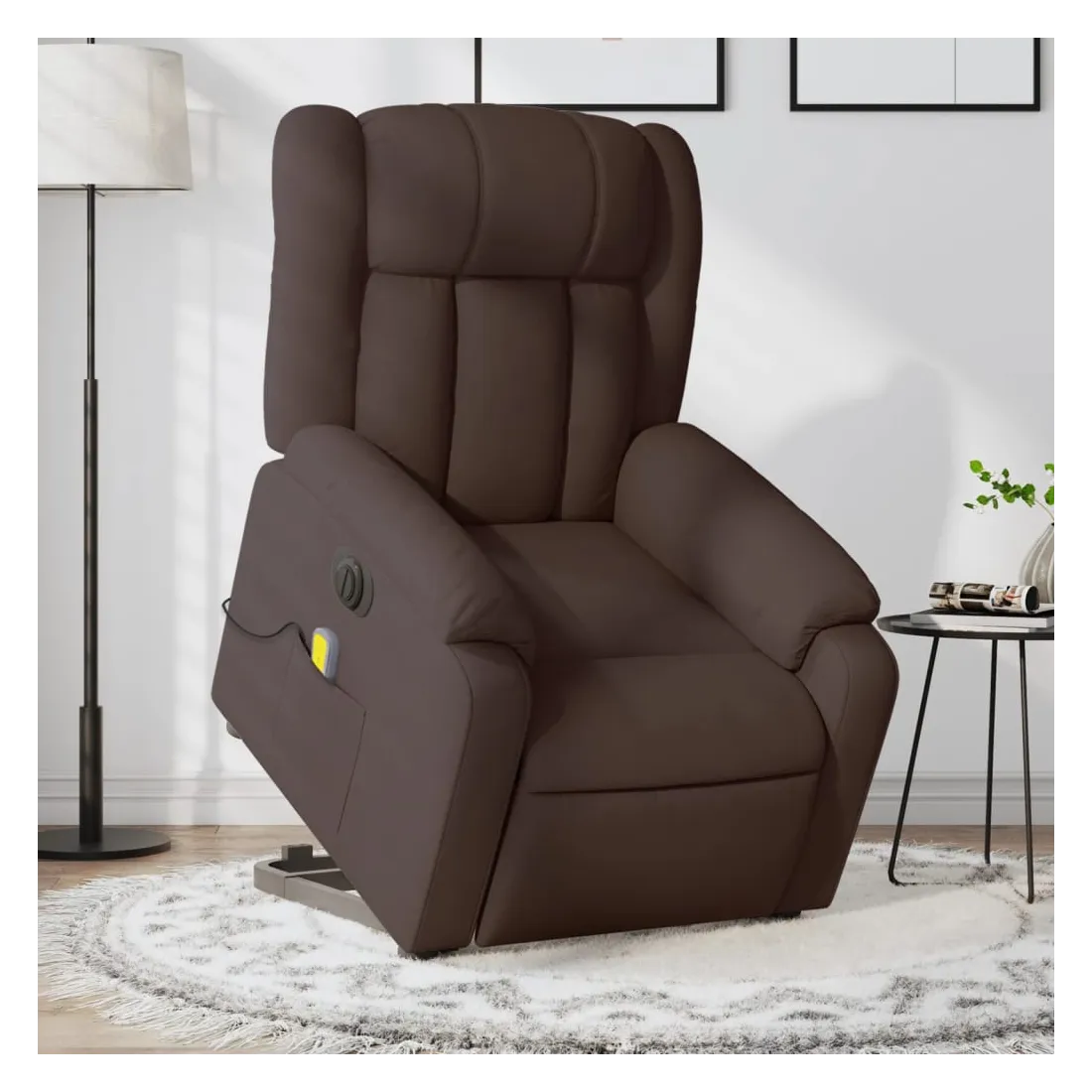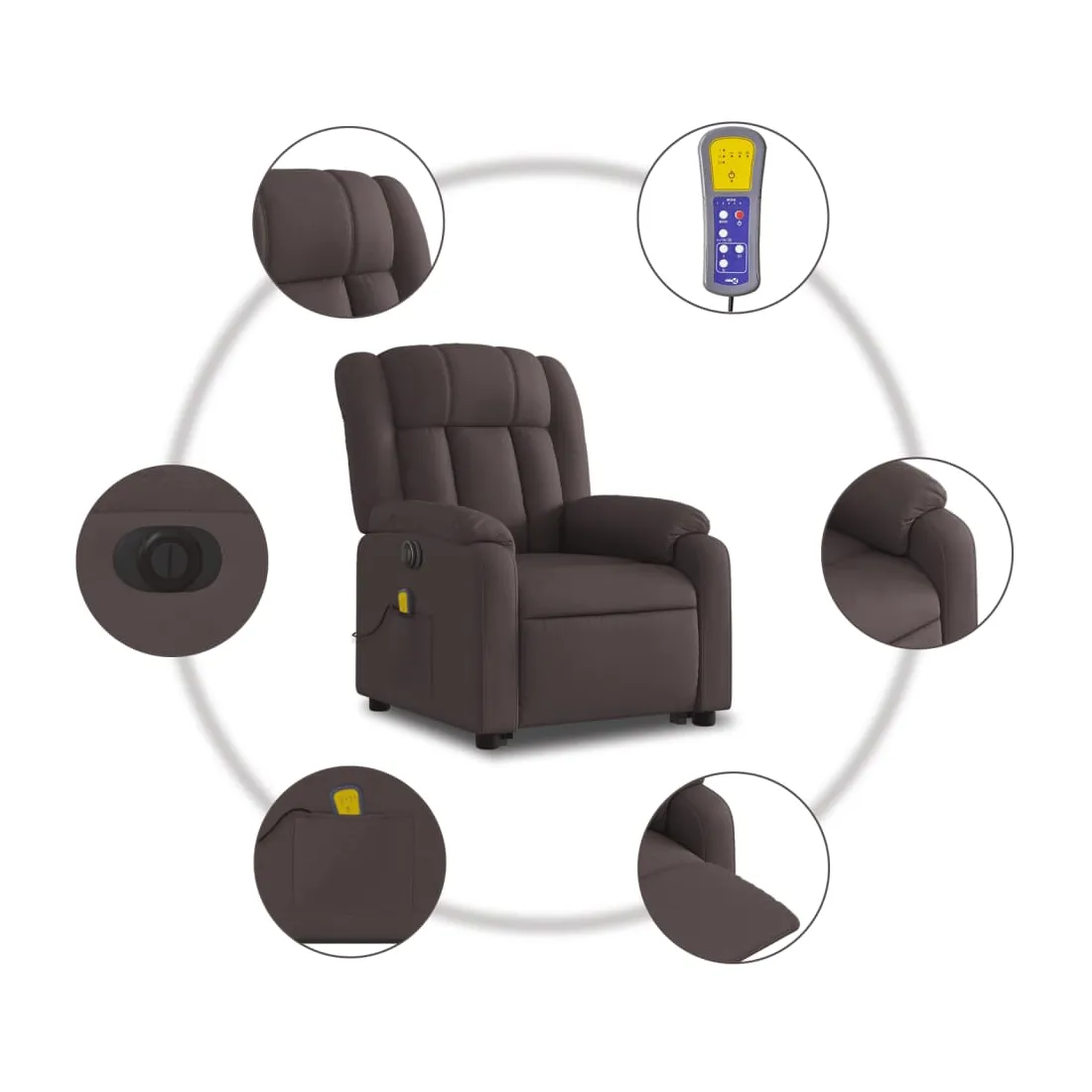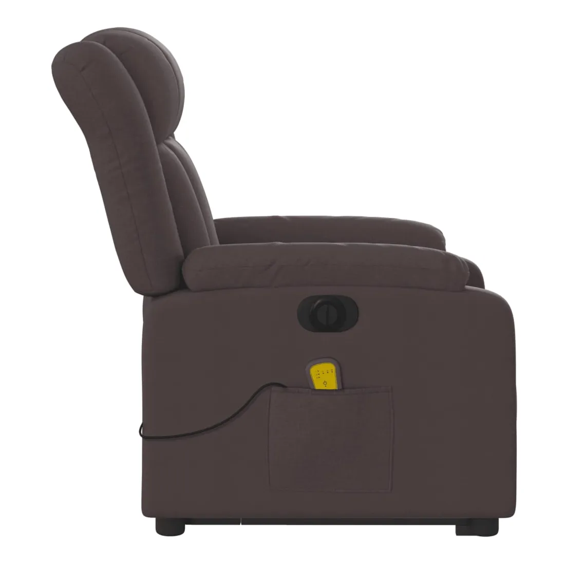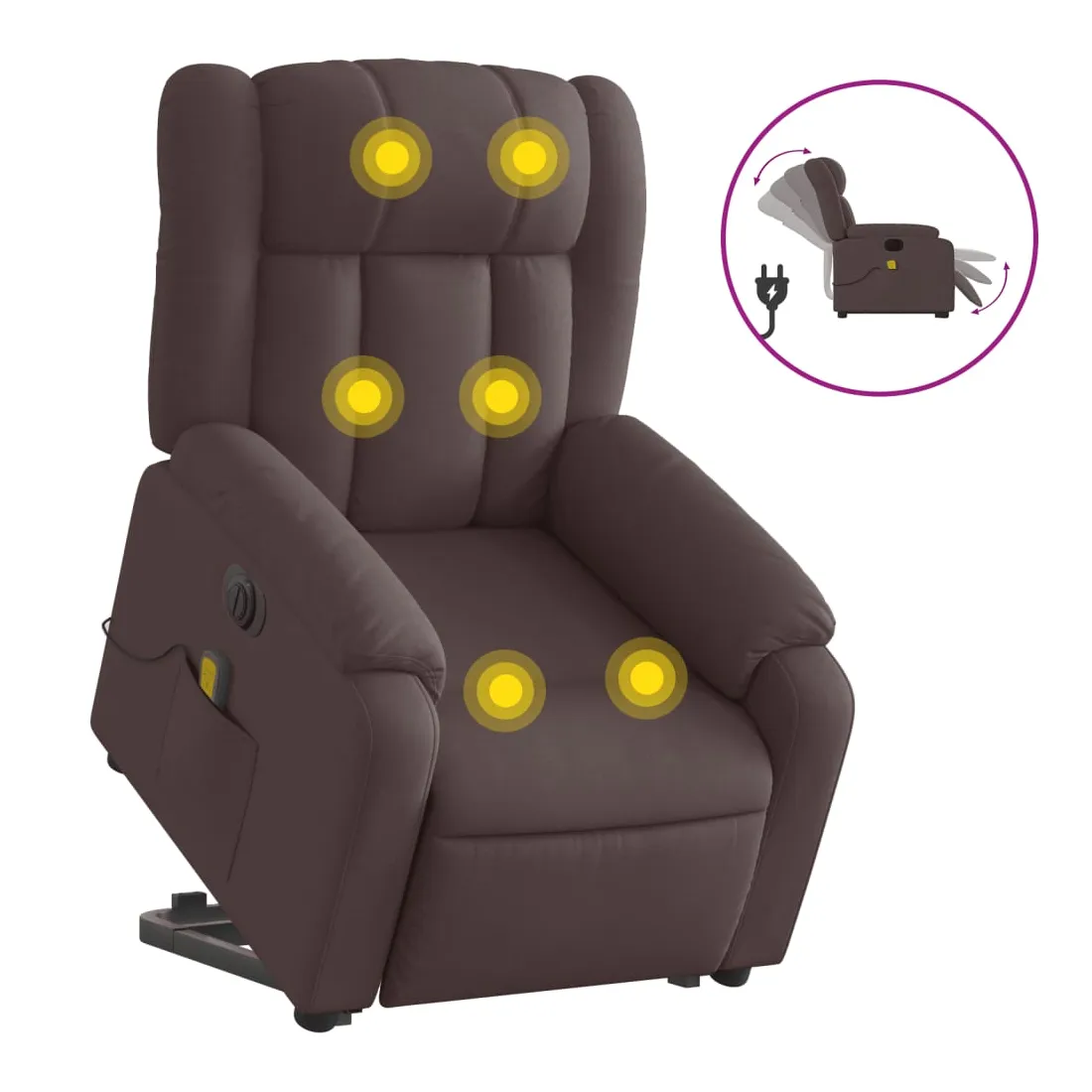 Asseyez-vous et détendez-vous dans ce fauteuil inclinable de massage électrique très confortable ! Fonction de levage électrique : ce fauteuil inclinable pour personnes âgées est équipé d'un moteur électrique pour la fonction de levage. Grâce à la fonction qui pousse toute la chaise vers le haut, vous pouvez facilement vous tenir debout sans stresser votre dos et vos genoux en appuyant simplement sur le bouton. Fonction d'inclinaison électrique : ce fauteuil inclinable est également équipé d'un moteur électrique qui permet de régler automatiquement le repose-pied et le dossier dans n'importe quelle position, selon votre confort, en appuyant simplement sur le bouton situé sur le côté du fauteuil. Cette fonction permet une inclinaison maximale de 135 degrés. En outre, le dossier peut revenir automatiquement à sa position d'origine par une simple pression sur le bouton. Fonction de vibration : les 6 points de massage vous permettent de faire l'expérience d'un massage mieux ciblé. De plus, la télécommande incluse vous permet de choisir différents programmes de massage. La fonction de massage est alimentée par le connecteur USB qui nécessite une source d'alimentation USB certifiée de 5 V (non fournie). Expérience d'assise confortable : le siège, le dossier et les larges accoudoirs bien rembourrés recouverts de tissu procurent une sensation confortable et chaleureuse, vous permettant de vous sentir enveloppé lorsque vous êtes assis. Le tissu présente un aspect simple et épuré et est respirant et durable. Poche latérale pratique : ce fauteuil est doté d'une poche latérale pour ranger votre télécommande ou garder vos objets essentiels à portée de main. Cadre solide et stable : le cadre en bois et en métal offre une structure solide et une grande stabilité. Ce fauteuil inclinable est confortable et durable.