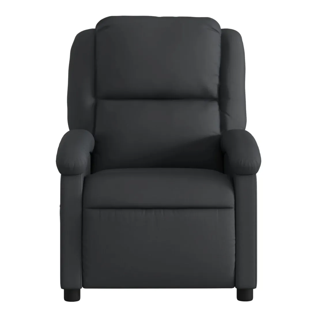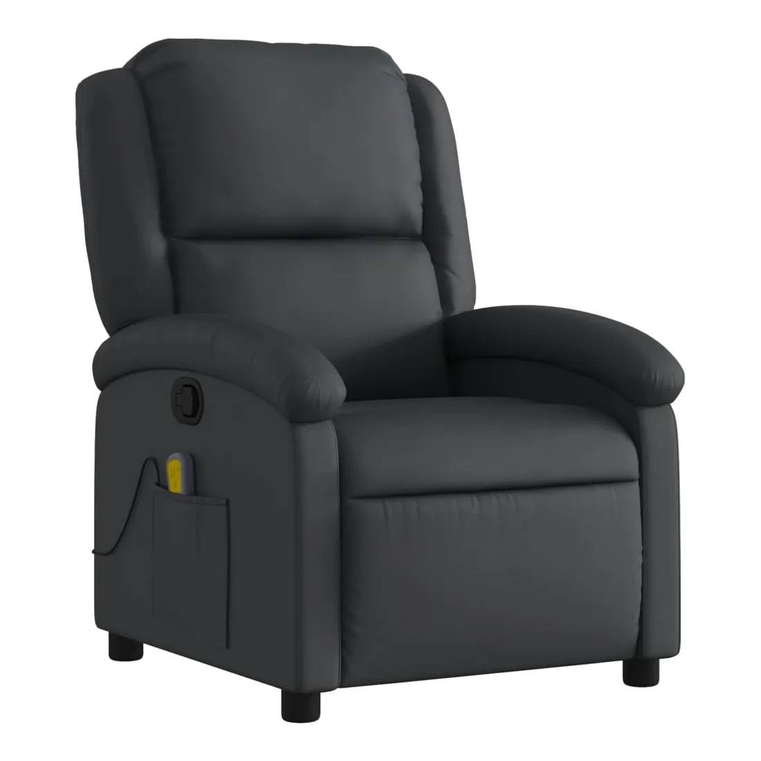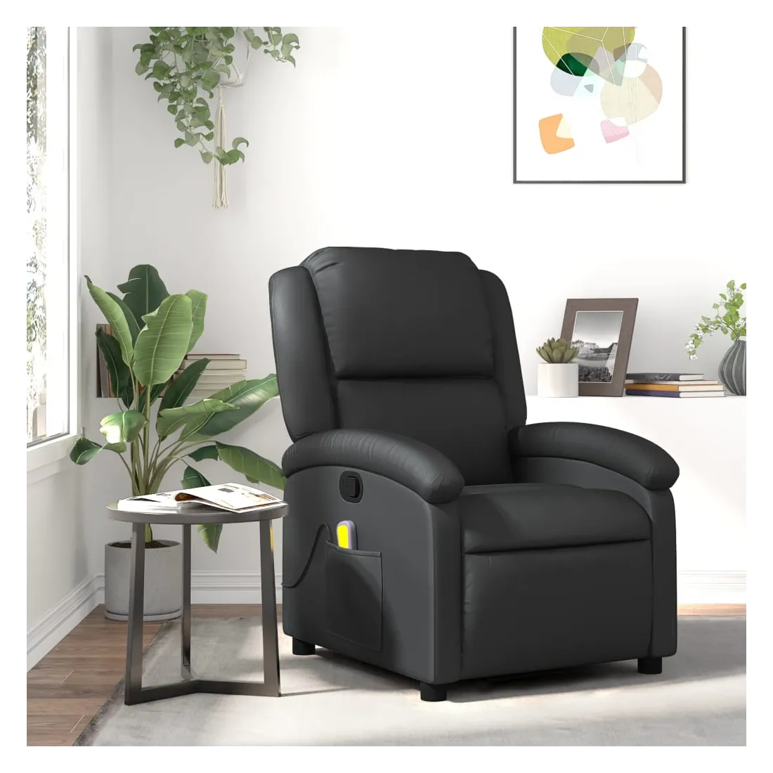 Asseyez-vous et détendez-vous dans ce fauteuil inclinable de massage très confortable ! Fonction d'inclinaison manuelle : ce fauteuil inclinable est doté d'un bouton du côté droit. Vous pouvez régler manuellement le repose-pieds et le dossier dans n'importe quelle position selon votre confort en tirant simplement sur la poignée. Cette fonction permet une inclinaison maximale de 135 degrés. De plus, le dossier peut revenir rapidement à sa position d'origine en tirant simplement sur la poignée.Fonction de vibration : les 6 points de massage vous permettent de faire l'expérience d'un massage mieux ciblé. De plus, la télécommande incluse vous permet de choisir différents programmes de massage. La fonction de massage est alimentée par le connecteur USB, mais la source d'alimentation USB 5V certifiée n'est pas incluse.Expérience de siège confortable : le siège, le dossier et les larges accoudoirs rembourrés épais recouverts de cuir véritable procurent une sensation confortable, vous faisant vous sentir enlacé lorsque vous êtes assis. Le cuir véritable est un matériau naturellement intemporel. Il peut durer toute une vie avec des soins et un entretien appropriés. La surface lisse lui donne également un aspect élégant tout en garantissant un confort optimal.Poche latérale pratique : ce fauteuil est doté d'une poche latérale pour ranger votre télécommande ou garder vos objets essentiels à portée de main.Cadre solide et stable : le cadre en bois et en métal offre une structure solide et une grande stabilité. Ce fauteuil inclinable est confortable et durable.