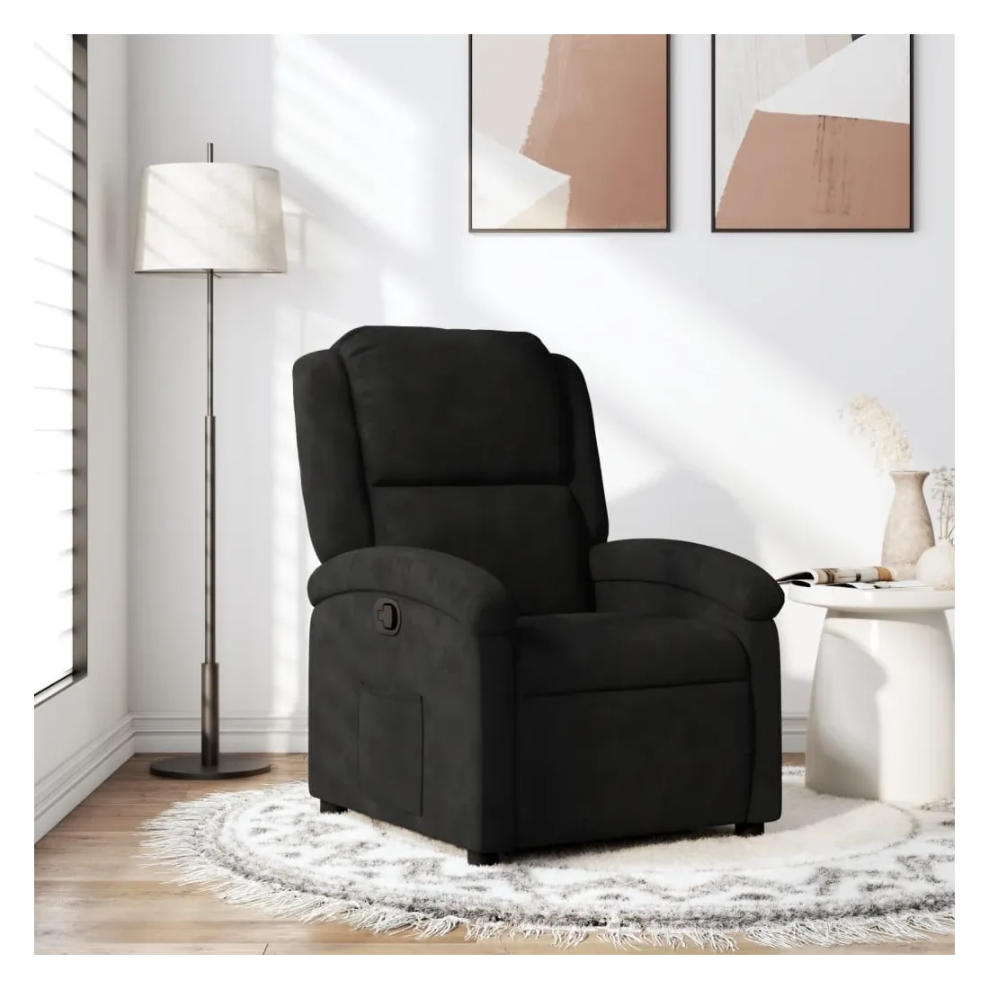 Asseyez-vous et laissez-vous aller dans ce fauteuil inclinable très confortable ! Fonction d'inclinaison manuelle : Ce fauteuil inclinable est doté d'un bouton sur le côté droit. Vous pouvez régler manuellement le repose-pieds et le dossier à votre convenance en tirant simplement sur la poignée. Cette fonction permet une inclinaison maximale de 135 degrés. De plus, le dossier peut revenir rapidement à sa position initiale en tirant simplement sur la poignée.Assise confortable : L'assise, le dossier et les larges accoudoirs rembourrés de velours offrent une sensation de confort et de chaleur, vous permettant de vous sentir bien en place. Le velours est un tissu doux et confortable, agréable au toucher.Poche latérale pratique : Ce fauteuil est doté d'une poche latérale pour garder vos objets essentiels à portée de main.Cadre solide et stable : Le cadre en bois et en métal offre une structure solide et stable. Ce fauteuil inclinable est confortable et durable.