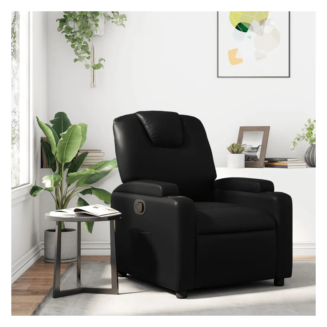 Asseyez-vous et détendez-vous dans ce fauteuil inclinable très confortable ! Fonction d'inclinaison manuelle : ce fauteuil inclinable est doté d'un bouton du côté droit. Vous pouvez régler manuellement le repose-pieds et le dossier dans n'importe quelle position selon votre confort en tirant simplement sur la poignée. Cette fonction permet une inclinaison maximale de 135 degrés. De plus, le dossier peut revenir rapidement à sa position d'origine en tirant simplement sur la poignée.Expérience de siège confortable : le siège, le dossier et les larges accoudoirs rembourrés épais recouverts de similicuir procurent une sensation confortable, vous faisant vous sentir enlacé lorsque vous êtes assis. Le similicuir est un matériau très résistant. Il est résistant aux taches, ce qui le rend facile à nettoyer avec un chiffon humide. La surface lisse donne également un aspect luxueux et la beauté du cuir véritable.Porte-gobelets et poche latérale pratiques : ce fauteuil dispose de deux porte-gobelets pratiques pour vos boissons et d'une poche latérale pour garder vos objets essentiels à portée de main.Cadre solide et stable : le cadre en bois et en métal offre une structure solide et une grande stabilité. Ce fauteuil inclinable est confortable et durable.