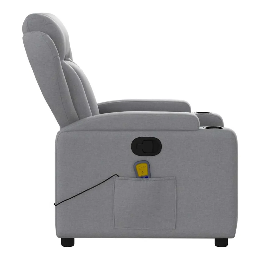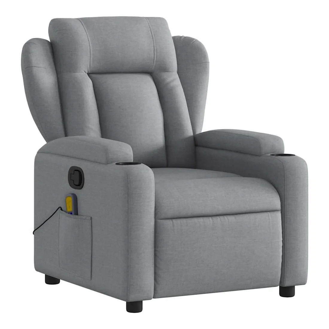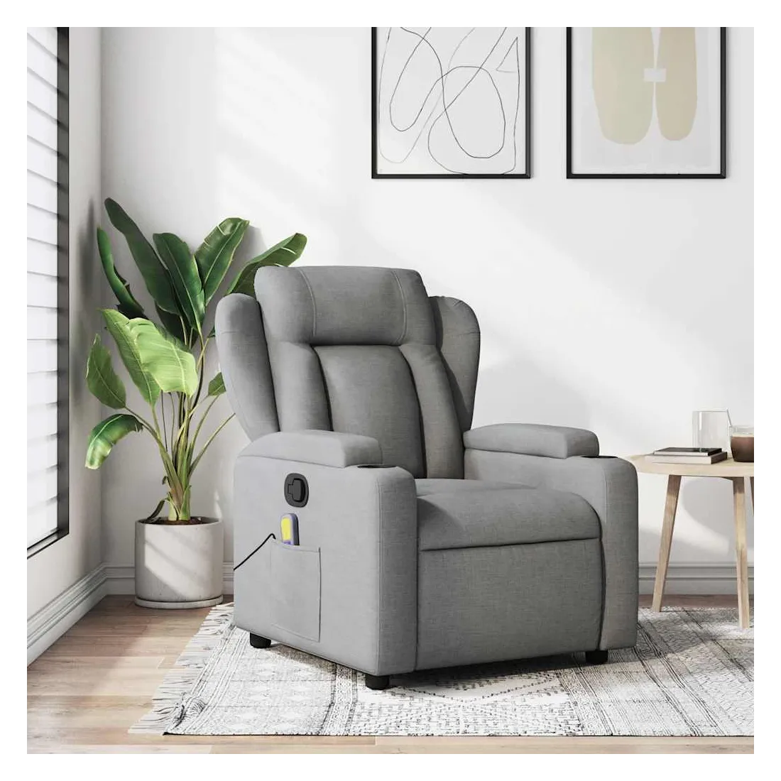 Asseyez-vous et détendez-vous dans ce fauteuil inclinable de massage très confortable ! Fonction d'inclinaison manuelle : ce fauteuil inclinable est doté d'un bouton du côté droit. Vous pouvez régler manuellement le repose-pieds et le dossier dans n'importe quelle position selon votre confort en tirant simplement sur la poignée. Cette fonction permet une inclinaison maximale de 135 degrés. De plus, le dossier peut revenir rapidement à sa position d'origine en tirant simplement sur la poignée.Fonction de vibration : les 6 points de massage vous permettent de faire l'expérience d'un massage mieux ciblé. De plus, la télécommande incluse vous permet de choisir différents programmes de massage. La fonction de massage est alimentée par le connecteur USB, mais la source d'alimentation USB 5V certifiée n'est pas incluse.Expérience d'assise confortable : le siège, le dossier et les larges accoudoirs bien rembourrés recouverts de tissu procurent une sensation confortable et chaleureuse, vous permettant de vous sentir enveloppé lorsque vous êtes assis. Le tissu présente un aspect simple et épuré et est respirant et durable.Porte-gobelets et poche latérale pratiques : ce fauteuil dispose de deux porte-gobelets pratiques pour vos boissons et d'une poche latérale pour votre télécommande ou pour garder vos objets essentiels à portée de main.Cadre solide et stable : le cadre en bois et en métal offre une structure solide et une grande stabilité. Ce fauteuil inclinable est confortable et durable.