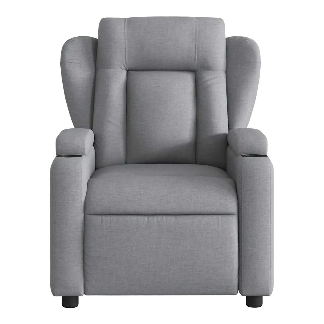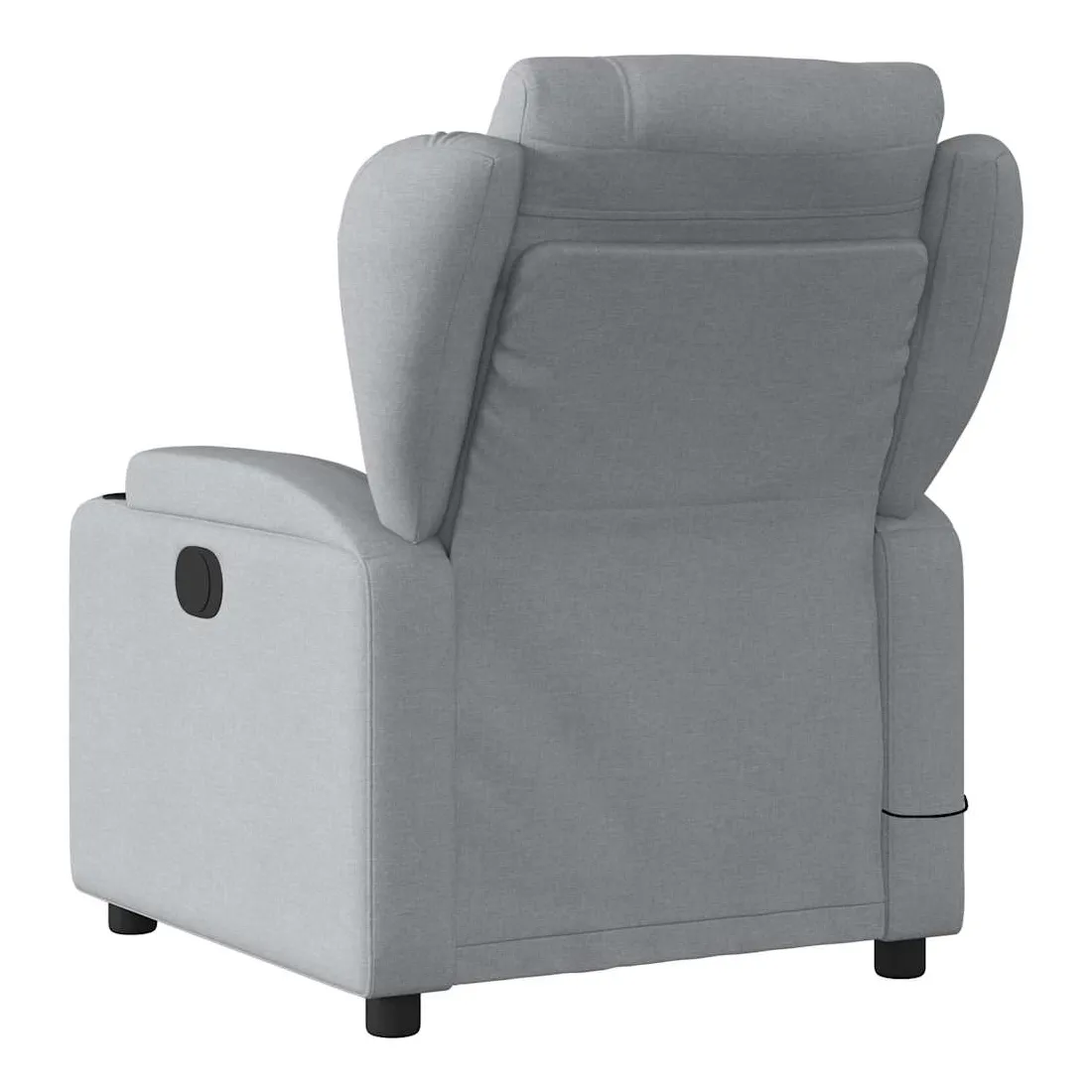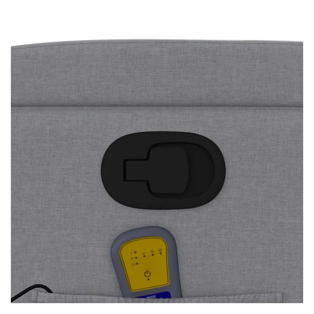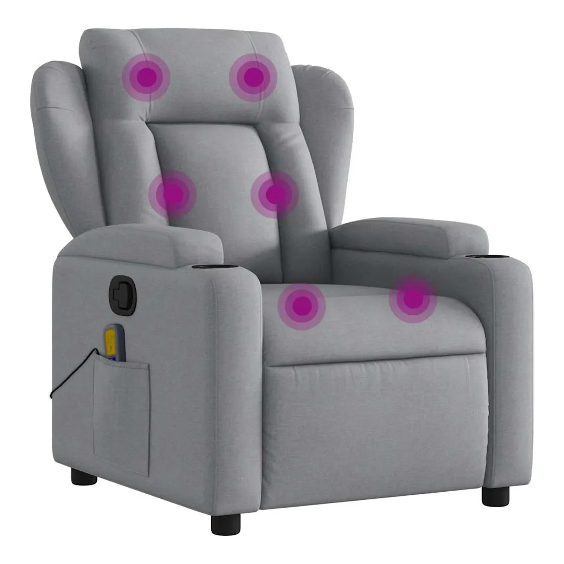 Asseyez-vous et détendez-vous dans ce fauteuil inclinable de massage très confortable ! Fonction d'inclinaison manuelle : ce fauteuil inclinable est doté d'un bouton du côté droit. Vous pouvez régler manuellement le repose-pieds et le dossier dans n'importe quelle position selon votre confort en tirant simplement sur la poignée. Cette fonction permet une inclinaison maximale de 135 degrés. De plus, le dossier peut revenir rapidement à sa position d'origine en tirant simplement sur la poignée.Fonction de vibration : les 6 points de massage vous permettent de faire l'expérience d'un massage mieux ciblé. De plus, la télécommande incluse vous permet de choisir différents programmes de massage. La fonction de massage est alimentée par le connecteur USB, mais la source d'alimentation USB 5V certifiée n'est pas incluse.Expérience d'assise confortable : le siège, le dossier et les larges accoudoirs bien rembourrés recouverts de tissu procurent une sensation confortable et chaleureuse, vous permettant de vous sentir enveloppé lorsque vous êtes assis. Le tissu présente un aspect simple et épuré et est respirant et durable.Porte-gobelets et poche latérale pratiques : ce fauteuil dispose de deux porte-gobelets pratiques pour vos boissons et d'une poche latérale pour votre télécommande ou pour garder vos objets essentiels à portée de main.Cadre solide et stable : le cadre en bois et en métal offre une structure solide et une grande stabilité. Ce fauteuil inclinable est confortable et durable.