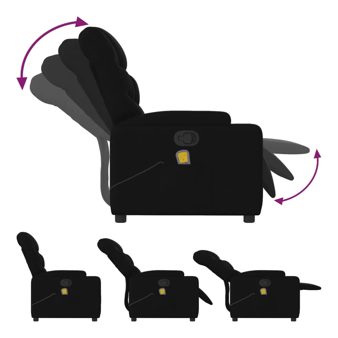 Asseyez-vous et détendez-vous dans ce fauteuil inclinable de massage très confortable ! Fonction d'inclinaison manuelle : ce fauteuil inclinable est doté d'une poignée du côté droit. Vous pouvez régler manuellement le repose-pieds et le dossier dans n'importe quelle position selon votre confort en tirant simplement sur la poignée. Cette fonction permet une inclinaison maximale de 135 degrés. De plus, le dossier peut revenir rapidement à sa position d'origine en tirant simplement sur la poignée.Fonction de vibration : les 6 points de massage vous permettent de faire l'expérience d'un massage mieux ciblé. De plus, la télécommande incluse vous permet de choisir différents programmes de massage. La fonction de massage est alimentée par le connecteur USB, mais la source d'alimentation USB 5V certifiée n'est pas incluse.Expérience d'assise confortable : le siège, le dossier et les larges accoudoirs bien rembourrés recouverts de tissu procurent une sensation confortable et chaleureuse, vous permettant de vous sentir enveloppé lorsque vous êtes assis. Le tissu présente un aspect simple et épuré et est respirant et durable.Porte-gobelets et poche latérale pratiques : ce fauteuil dispose de deux porte-gobelets pratiques pour vos boissons et d'une poche latérale pour votre télécommande ou pour garder vos objets essentiels à portée de main.Cadre solide et stable : le cadre en bois et en métal offre une structure solide et une grande stabilité. Ce fauteuil inclinable est confortable et durable.