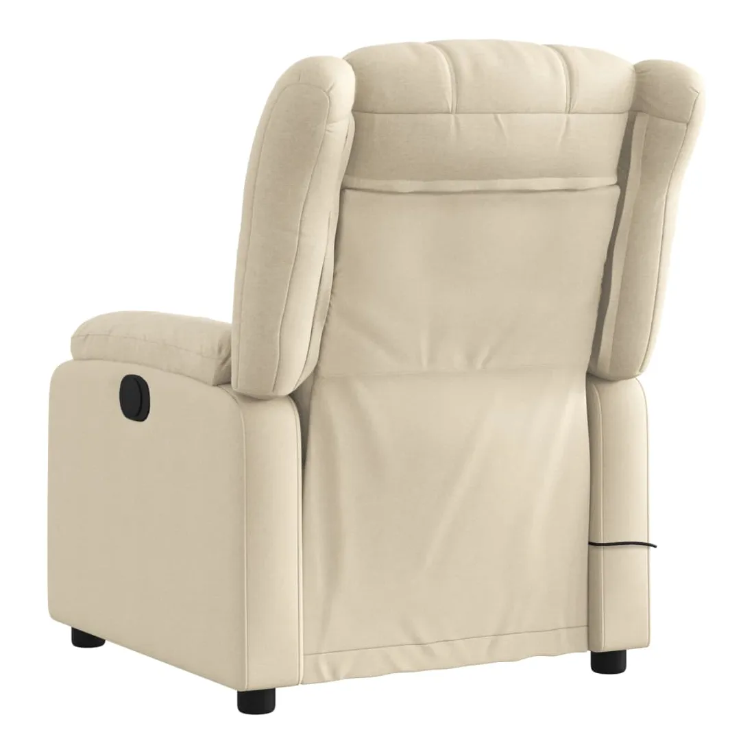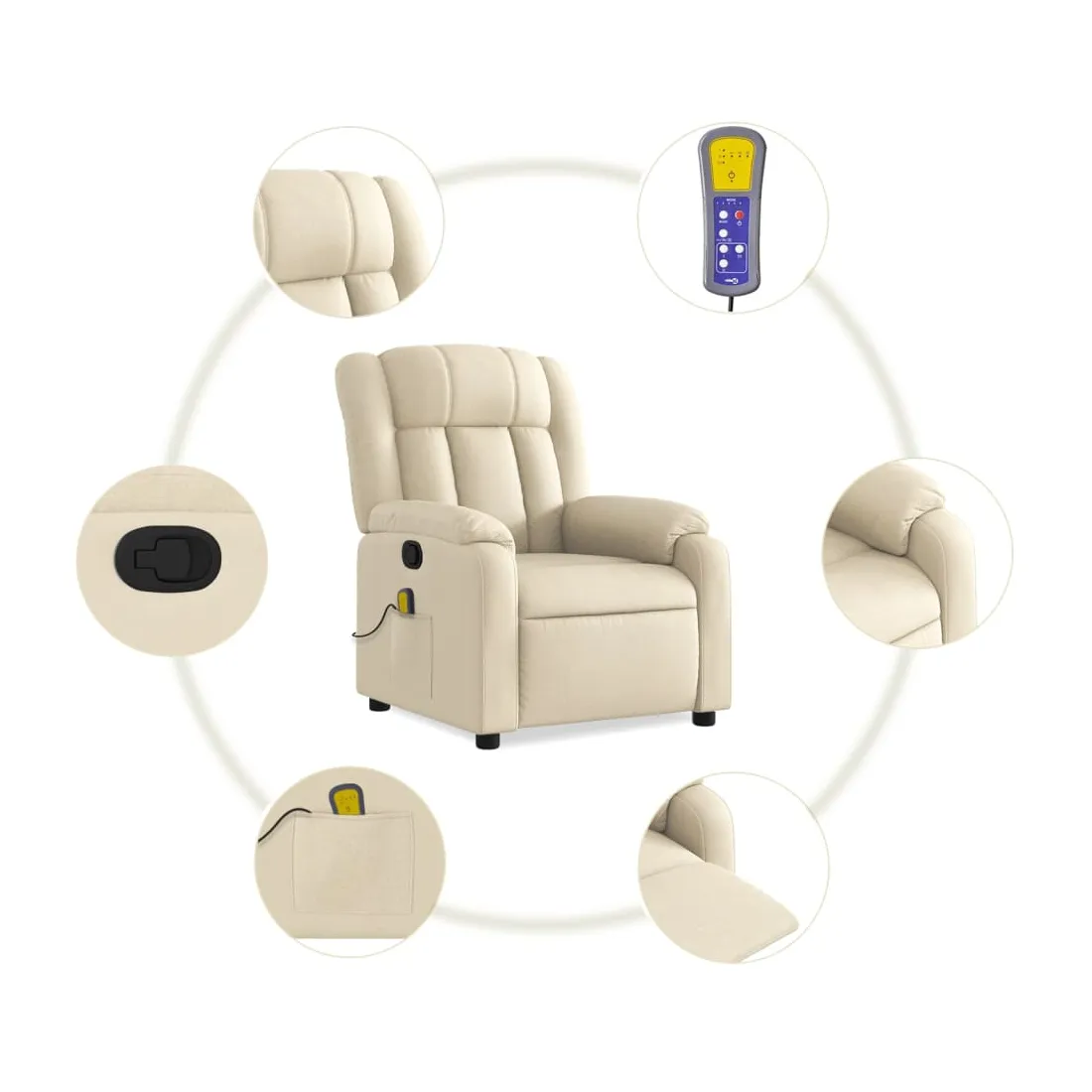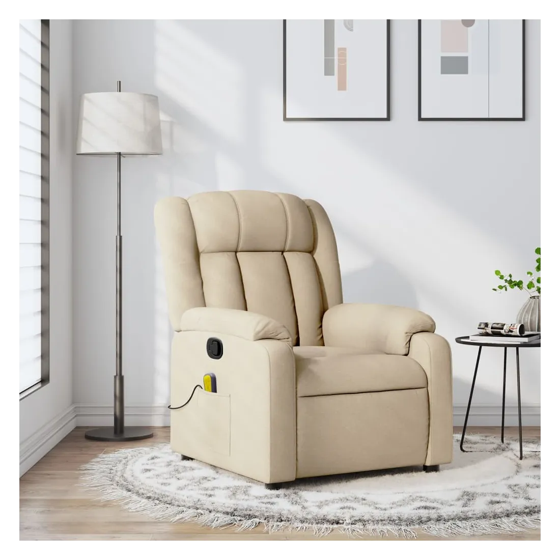 Asseyez-vous et détendez-vous dans ce fauteuil inclinable de massage très confortable ! Fonction d'inclinaison manuelle : ce fauteuil inclinable est doté d'une poignée du côté droit. Vous pouvez régler manuellement le repose-pieds et le dossier dans n'importe quelle position selon votre confort en tirant simplement sur la poignée. Cette fonction permet une inclinaison maximale de 135 degrés. De plus, le dossier peut revenir rapidement à sa position d'origine en tirant simplement sur la poignée.Fonction de vibration : les 6 points de massage vous permettent de faire l'expérience d'un massage mieux ciblé. De plus, la télécommande incluse vous permet de choisir différents programmes de massage. La fonction de massage est alimentée par le connecteur USB, mais la source d'alimentation USB 5V certifiée n'est pas incluse.Expérience d'assise confortable : le siège, le dossier et les larges accoudoirs bien rembourrés recouverts de tissu procurent une sensation confortable et chaleureuse, vous permettant de vous sentir enveloppé lorsque vous êtes assis. Le tissu présente un aspect simple et épuré et est respirant et durable.Poche latérale pratique : ce fauteuil est doté d'une poche latérale pour ranger votre télécommande ou garder vos objets essentiels à portée de main.Cadre solide et stable : le cadre en bois et en métal offre une structure solide et une grande stabilité. Ce fauteuil inclinable est confortable et durable.