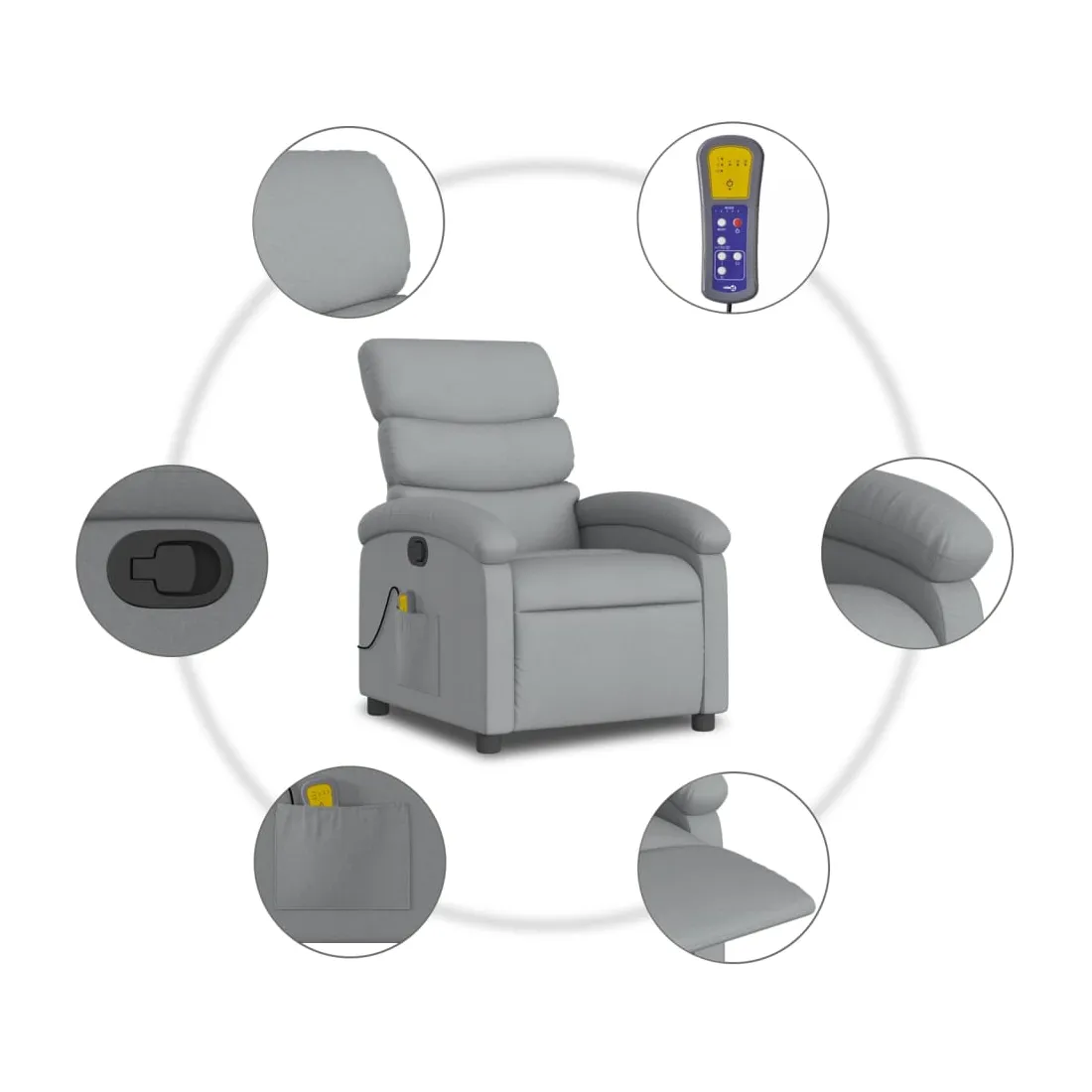 Asseyez-vous et détendez-vous dans ce fauteuil inclinable de massage très confortable ! Fonction d'inclinaison manuelle : ce fauteuil inclinable est doté d'une poignée du côté droit. Vous pouvez régler manuellement le repose-pieds et le dossier dans n'importe quelle position selon votre confort en tirant simplement sur la poignée. Cette fonction permet une inclinaison maximale de 135 degrés. De plus, le dossier peut revenir rapidement à sa position d'origine en tirant simplement sur la poignée.Fonction de vibration : les 6 points de massage vous permettent de faire l'expérience d'un massage mieux ciblé. De plus, la télécommande incluse vous permet de choisir différents programmes de massage. La fonction de massage est alimentée par le connecteur USB, mais la source d'alimentation USB 5V certifiée n'est pas incluse.Expérience d'assise confortable : le siège, le dossier et les larges accoudoirs bien rembourrés recouverts de tissu procurent une sensation confortable et chaleureuse, vous permettant de vous sentir enveloppé lorsque vous êtes assis. Le tissu présente un aspect simple et épuré et est respirant et durable.Poche latérale pratique : ce fauteuil est doté d'une poche latérale pour ranger votre télécommande ou garder vos objets essentiels à portée de main.Cadre solide et stable : le cadre en bois et en métal offre une structure solide et une grande stabilité. Ce fauteuil inclinable est confortable et durable.