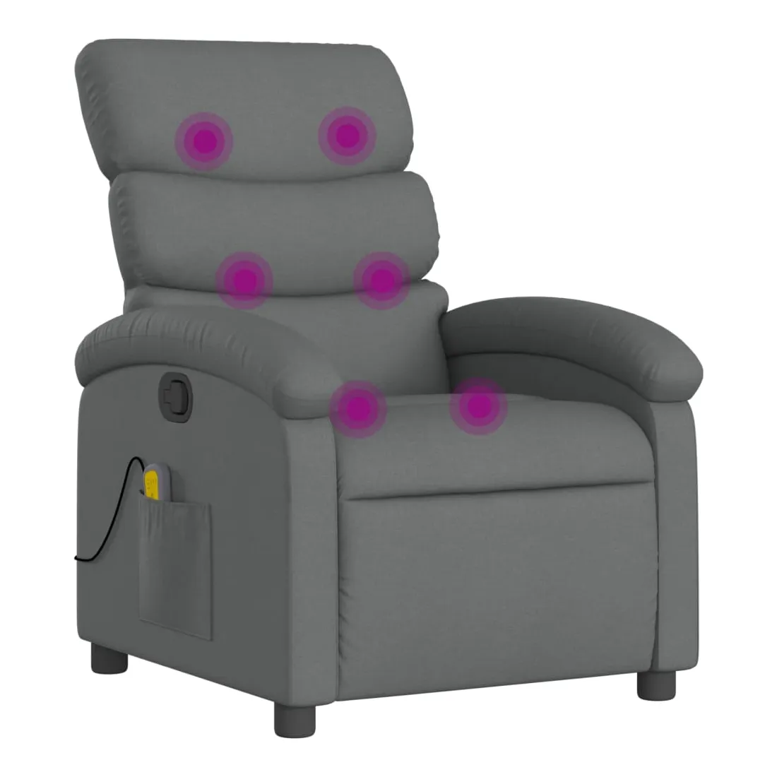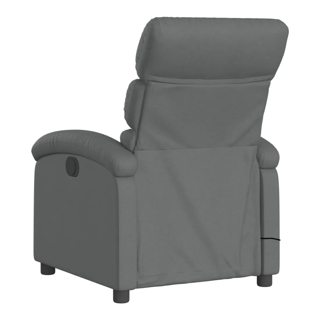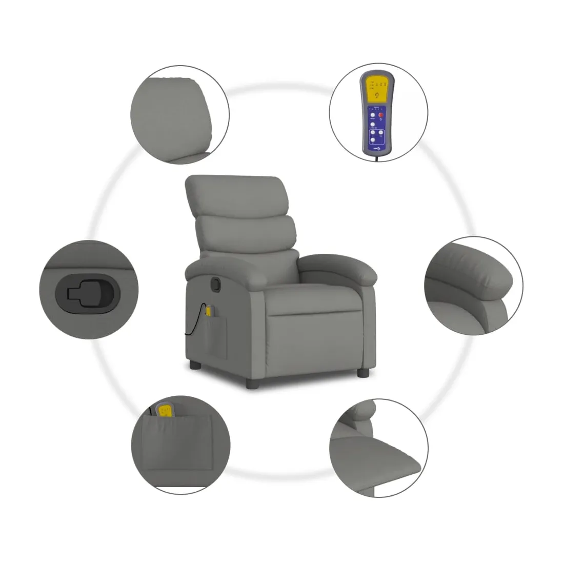 Asseyez-vous et détendez-vous dans ce fauteuil inclinable de massage très confortable ! Fonction d'inclinaison manuelle : ce fauteuil inclinable est doté d'une poignée du côté droit. Vous pouvez régler manuellement le repose-pieds et le dossier dans n'importe quelle position selon votre confort en tirant simplement sur la poignée. Cette fonction permet une inclinaison maximale de 135 degrés. De plus, le dossier peut revenir rapidement à sa position d'origine en tirant simplement sur la poignée.Fonction de vibration : les 6 points de massage vous permettent de faire l'expérience d'un massage mieux ciblé. De plus, la télécommande incluse vous permet de choisir différents programmes de massage. La fonction de massage est alimentée par le connecteur USB, mais la source d'alimentation USB 5V certifiée n'est pas incluse.Expérience d'assise confortable : le siège, le dossier et les larges accoudoirs bien rembourrés recouverts de tissu procurent une sensation confortable et chaleureuse, vous permettant de vous sentir enveloppé lorsque vous êtes assis. Le tissu présente un aspect simple et épuré et est respirant et durable.Poche latérale pratique : ce fauteuil est doté d'une poche latérale pour ranger votre télécommande ou garder vos objets essentiels à portée de main.Cadre solide et stable : le cadre en bois et en métal offre une structure solide et une grande stabilité. Ce fauteuil inclinable est confortable et durable.
