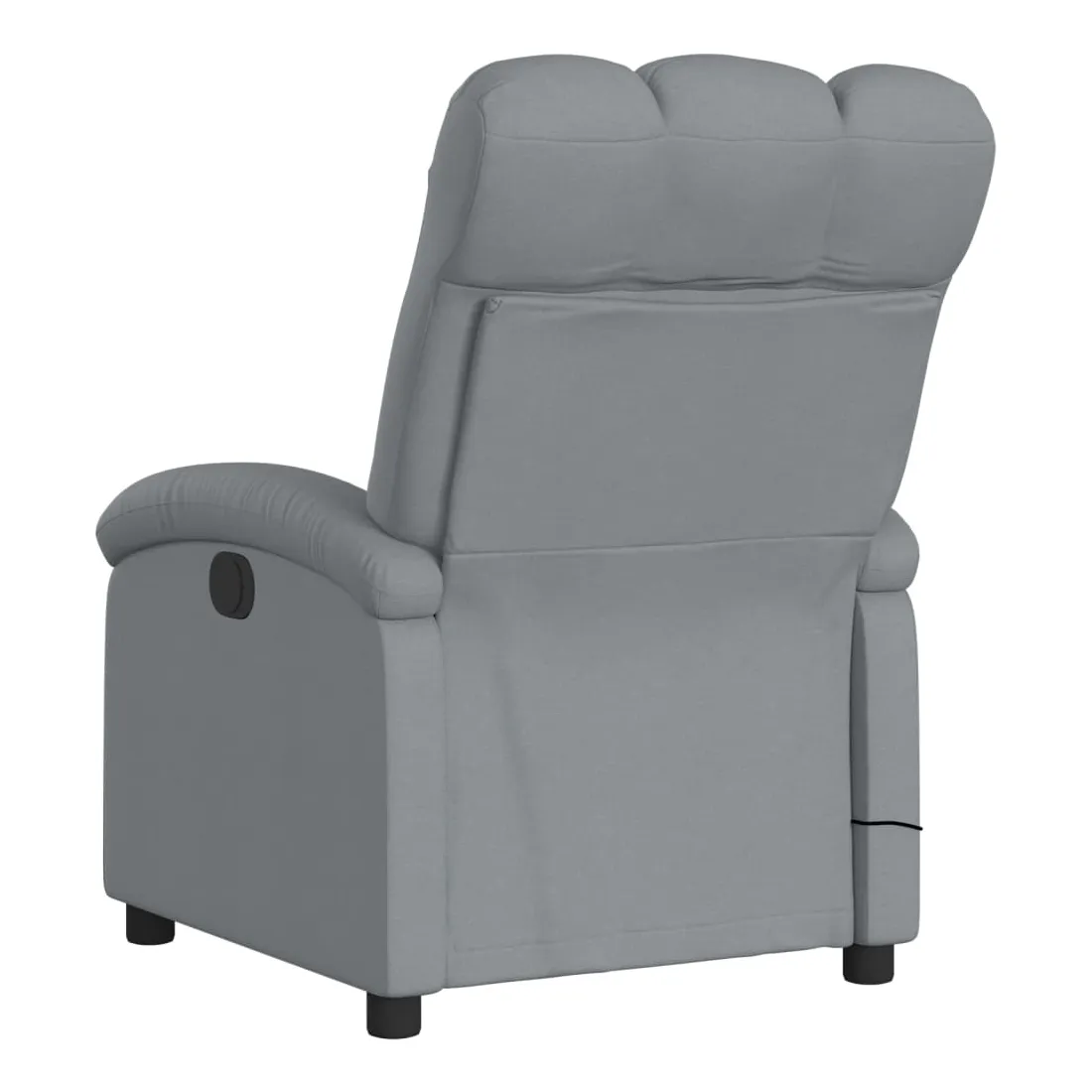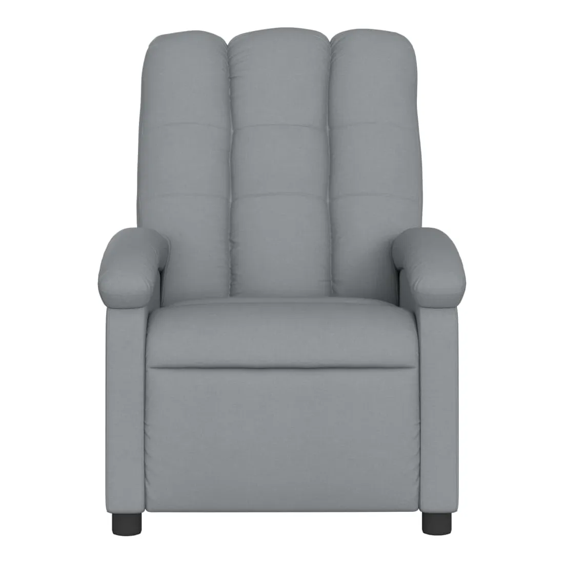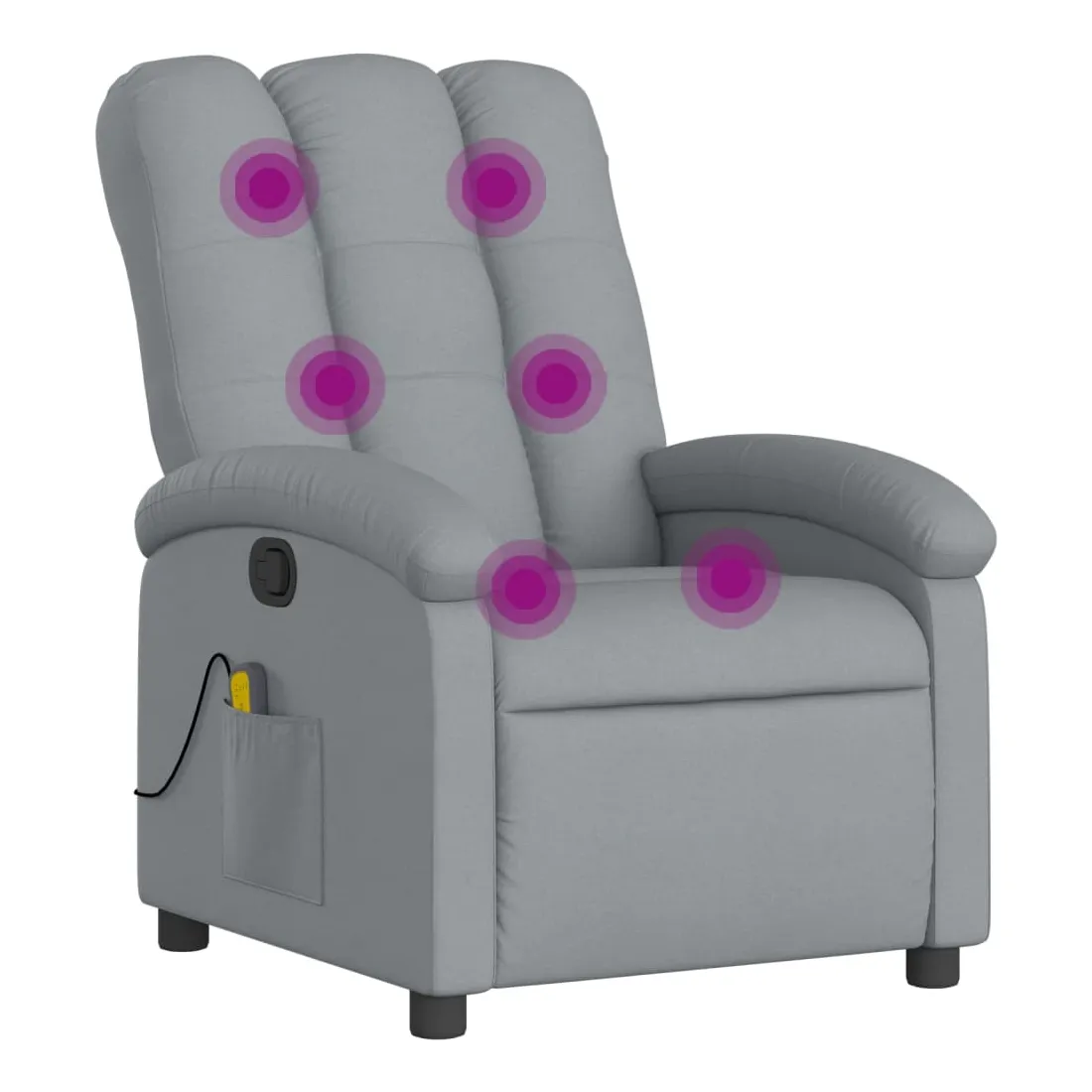Asseyez-vous et détendez-vous dans ce fauteuil inclinable de massage très confortable ! Fonction d'inclinaison manuelle : ce fauteuil inclinable est doté d'une poignée du côté droit. Vous pouvez régler manuellement le repose-pieds et le dossier dans n'importe quelle position selon votre confort en tirant simplement sur la poignée. Cette fonction permet une inclinaison maximale de 135 degrés. De plus, le dossier peut revenir rapidement à sa position d'origine en tirant simplement sur la poignée.Fonction de vibration : les 6 points de massage vous permettent de faire l'expérience d'un massage mieux ciblé. De plus, la télécommande incluse vous permet de choisir différents programmes de massage. La fonction de massage est alimentée par le connecteur USB, mais la source d'alimentation USB 5V certifiée n'est pas incluse.Expérience d'assise confortable : le siège, le dossier et les larges accoudoirs bien rembourrés recouverts de tissu procurent une sensation confortable et chaleureuse, vous permettant de vous sentir enveloppé lorsque vous êtes assis. Le tissu présente un aspect simple et épuré et est respirant et durable.Poche latérale pratique : ce fauteuil est doté d'une poche latérale pour ranger votre télécommande ou garder vos objets essentiels à portée de main.Cadre solide et stable : le cadre en bois et en métal offre une structure solide et une grande stabilité. Ce fauteuil inclinable est confortable et durable.