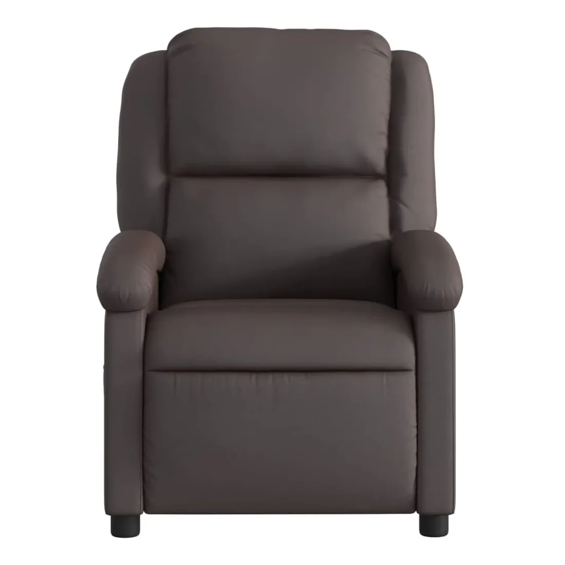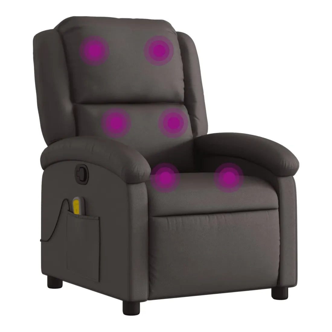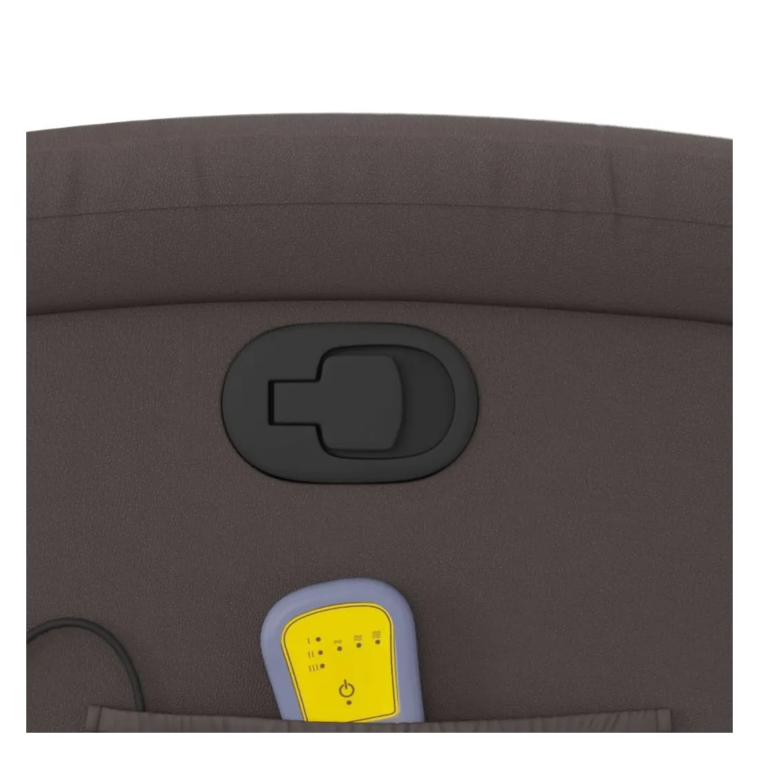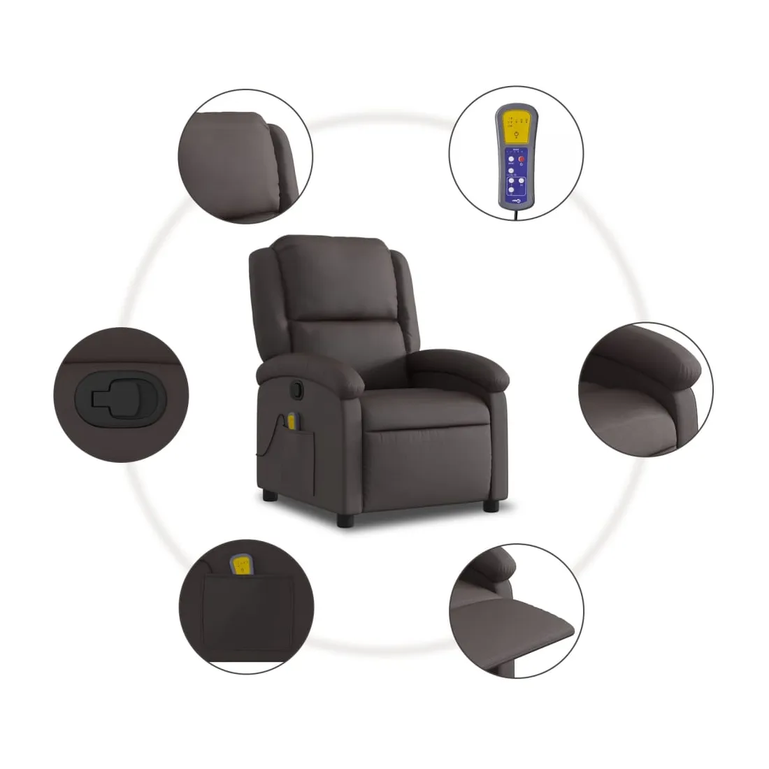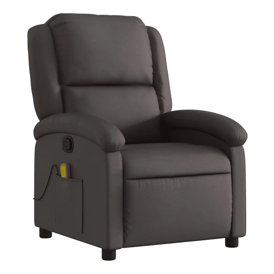 Asseyez-vous et détendez-vous dans ce fauteuil inclinable de massage très confortable ! Fonction d'inclinaison manuelle : ce fauteuil inclinable est doté d'un bouton du côté droit. Vous pouvez régler manuellement le repose-pieds et le dossier dans n'importe quelle position selon votre confort en tirant simplement sur la poignée. Cette fonction permet une inclinaison maximale de 135 degrés. De plus, le dossier peut revenir rapidement à sa position d'origine en tirant simplement sur la poignée.Fonction de vibration : les 6 points de massage vous permettent de faire l'expérience d'un massage mieux ciblé. De plus, la télécommande incluse vous permet de choisir différents programmes de massage. La fonction de massage est alimentée par le connecteur USB, mais la source d'alimentation USB 5V certifiée n'est pas incluse.Expérience de siège confortable : le siège, le dossier et les larges accoudoirs rembourrés épais recouverts de cuir véritable procurent une sensation confortable, vous faisant vous sentir enlacé lorsque vous êtes assis. Le cuir véritable est un matériau naturellement intemporel. Il peut durer toute une vie avec des soins et un entretien appropriés. La surface lisse lui donne également un aspect élégant tout en garantissant un confort optimal.Poche latérale pratique : ce fauteuil est doté d'une poche latérale pour ranger votre télécommande ou garder vos objets essentiels à portée de main.Cadre solide et stable : le cadre en bois et en métal offre une structure solide et une grande stabilité. Ce fauteuil inclinable est confortable et durable.