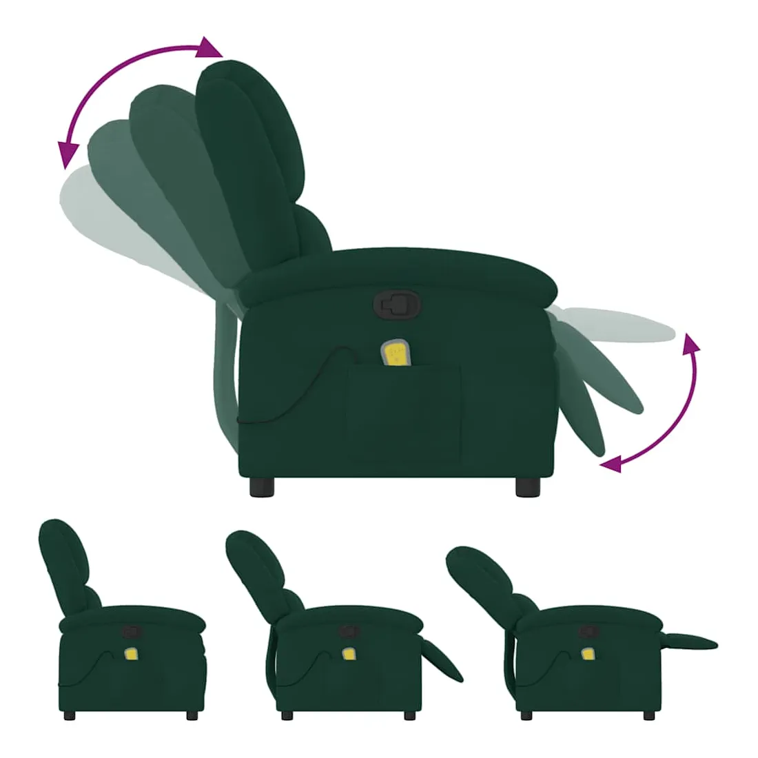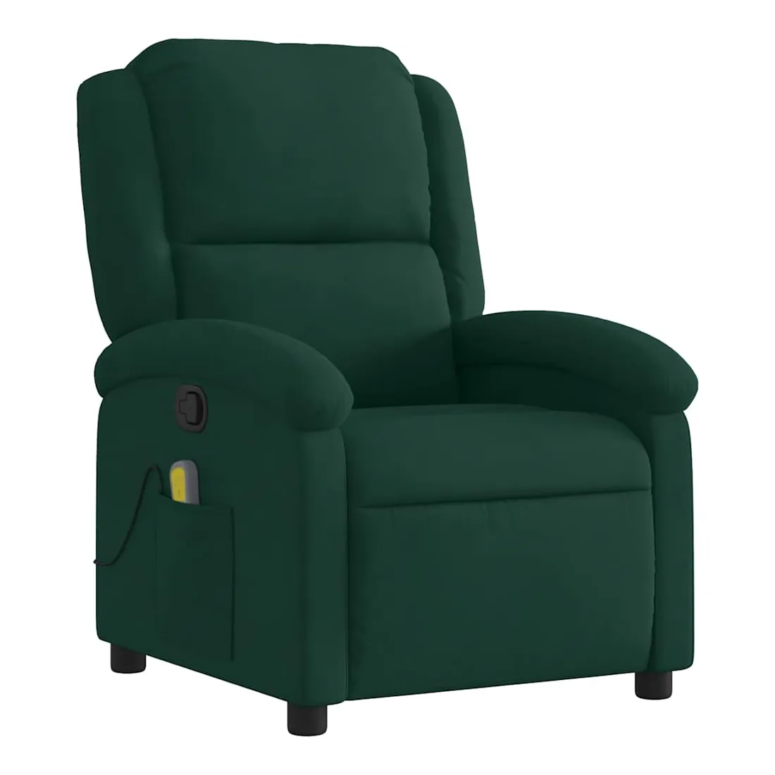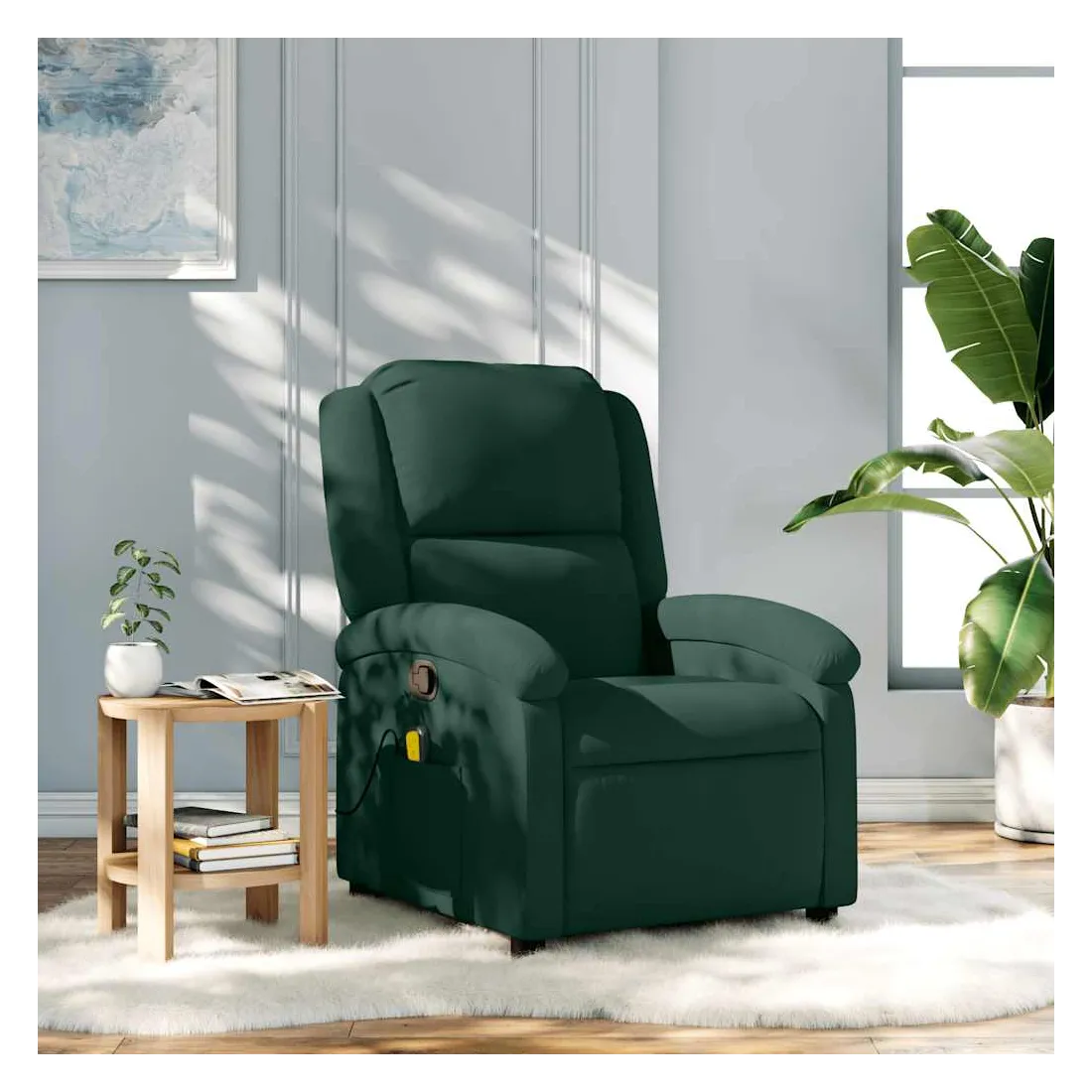 Asseyez-vous et détendez-vous dans ce fauteuil inclinable de massage très confortable ! Fonction d'inclinaison manuelle : ce fauteuil inclinable est doté d'une poignée du côté droit. Vous pouvez régler manuellement le repose-pieds et le dossier dans n'importe quelle position selon votre confort en tirant simplement sur la poignée. Cette fonction permet une inclinaison maximale de 135 degrés. De plus, le dossier peut revenir rapidement à sa position d'origine en tirant simplement sur la poignée.Fonction de vibration : les 6 points de massage vous permettent de faire l'expérience d'un massage mieux ciblé. De plus, la télécommande incluse vous permet de choisir différents programmes de massage. La fonction de massage est alimentée par le connecteur USB, mais la source d'alimentation USB 5V certifiée n'est pas incluse.Expérience d'assise confortable : le siège, le dossier et les larges accoudoirs rembourrés épais recouverts de velours procurent une sensation confortable et chaleureuse, vous faisant vous sentir enlacé lorsque vous êtes assis. Le velours est un tissu doux et confortable qui est agréable sur la peau.Poche latérale pratique : ce fauteuil est doté d'une poche latérale pour ranger votre télécommande ou garder vos objets essentiels à portée de main.Cadre solide et stable : le cadre en bois et en métal offre une structure solide et une grande stabilité. Ce fauteuil inclinable est confortable et durable.
