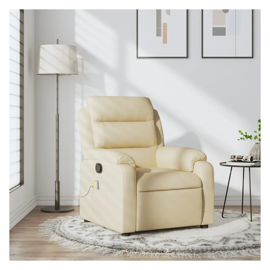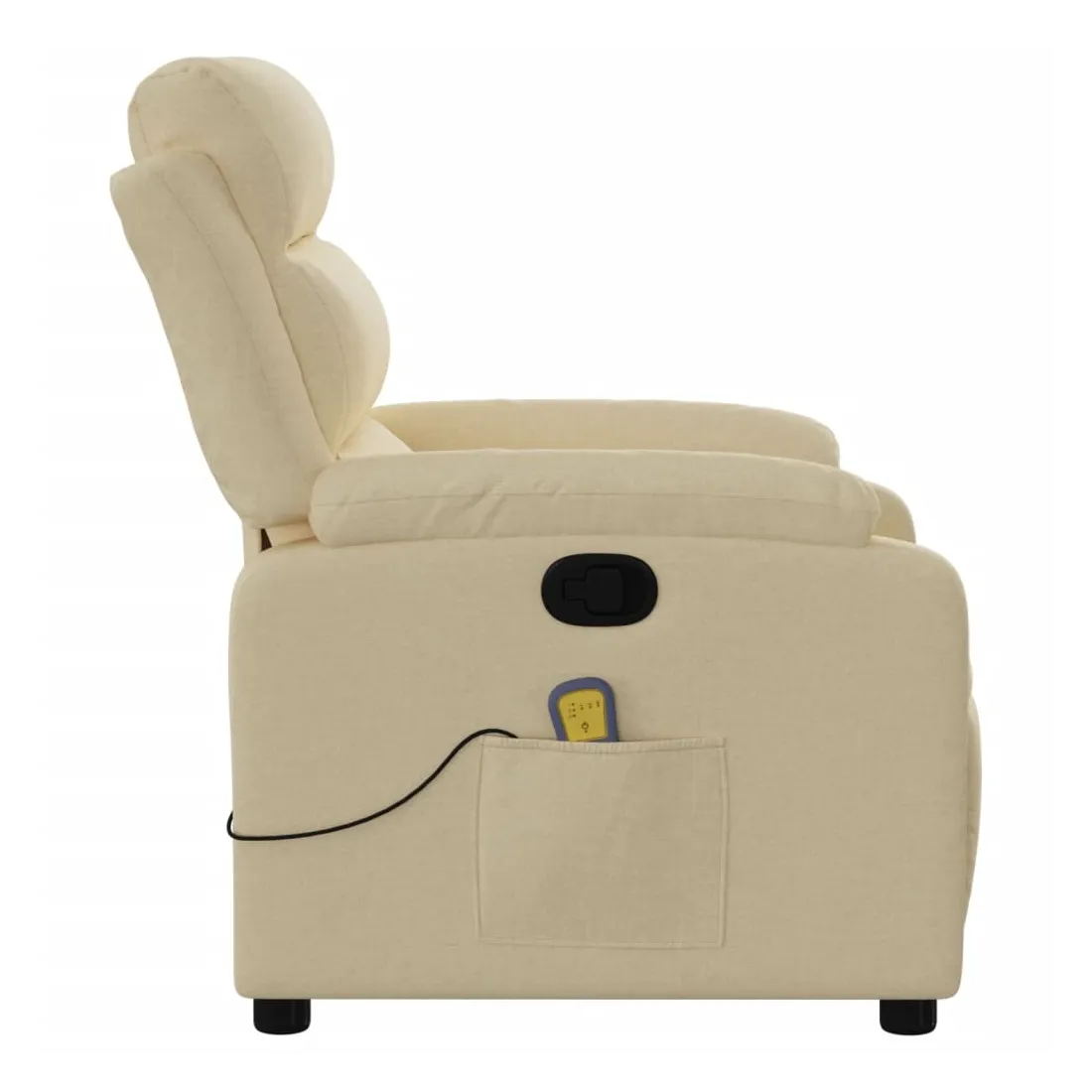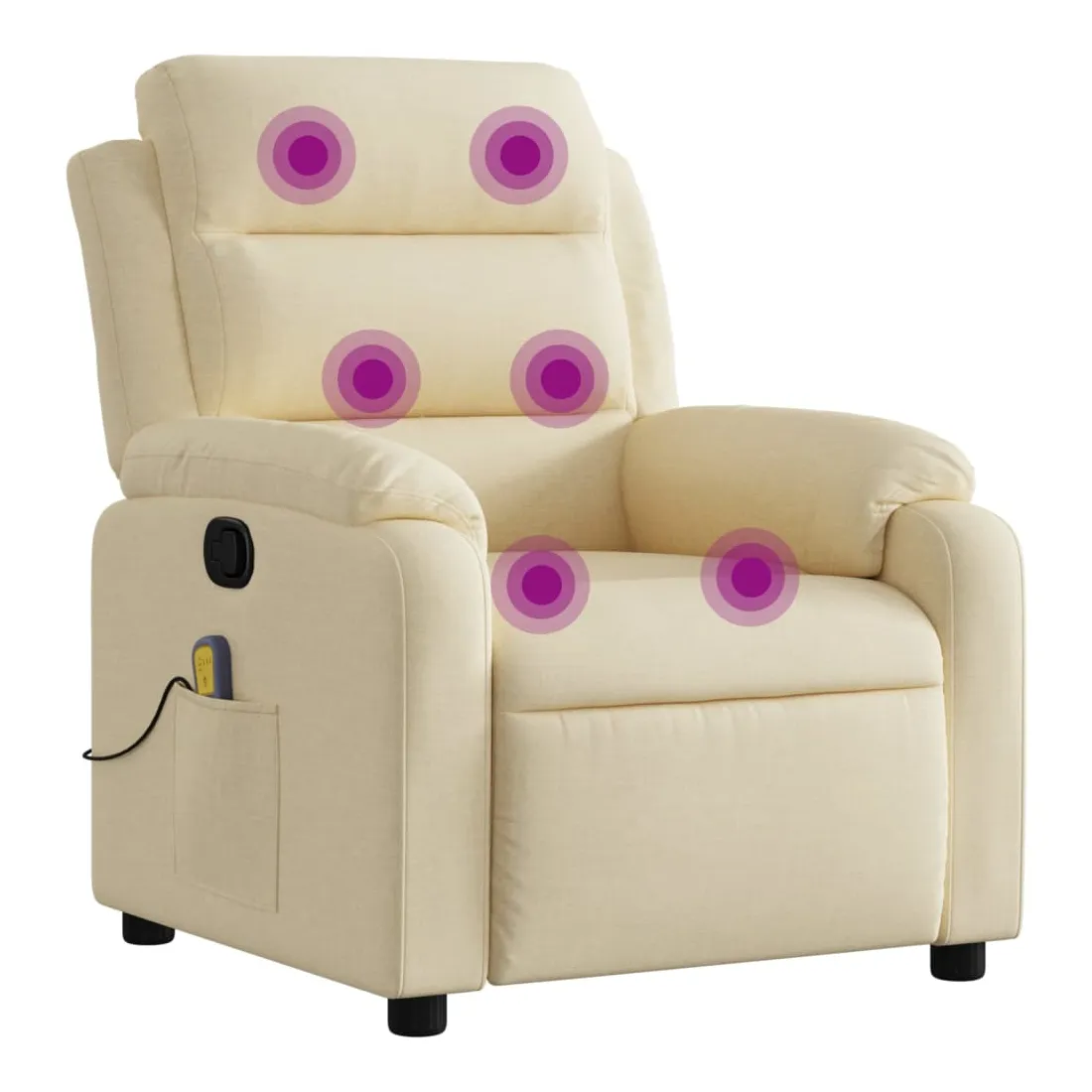 Asseyez-vous et détendez-vous dans ce fauteuil inclinable de massage très confortable ! Fonction d'inclinaison manuelle : ce fauteuil inclinable est doté d'une poignée du côté droit. Vous pouvez régler manuellement le repose-pieds et le dossier dans n'importe quelle position selon votre confort en tirant simplement sur la poignée. Cette fonction permet une inclinaison maximale de 135 degrés. De plus, le dossier peut revenir rapidement à sa position d'origine en tirant simplement sur la poignée.Fonction de vibration : les 6 points de massage vous permettent de faire l'expérience d'un massage mieux ciblé. De plus, la télécommande incluse vous permet de choisir différents programmes de massage. La fonction de massage est alimentée par le connecteur USB, mais la source d'alimentation USB 5V certifiée n'est pas incluse.Expérience d'assise confortable : le siège, le dossier et les larges accoudoirs bien rembourrés recouverts de tissu procurent une sensation confortable et chaleureuse, vous permettant de vous sentir enveloppé lorsque vous êtes assis. Le tissu présente un aspect simple et épuré et est respirant et durable.Poche latérale pratique : ce fauteuil est doté d'une poche latérale pour ranger votre télécommande ou garder vos objets essentiels à portée de main.Cadre solide et stable : le cadre en bois et en métal offre une structure solide et une grande stabilité. Ce fauteuil inclinable est confortable et durable.