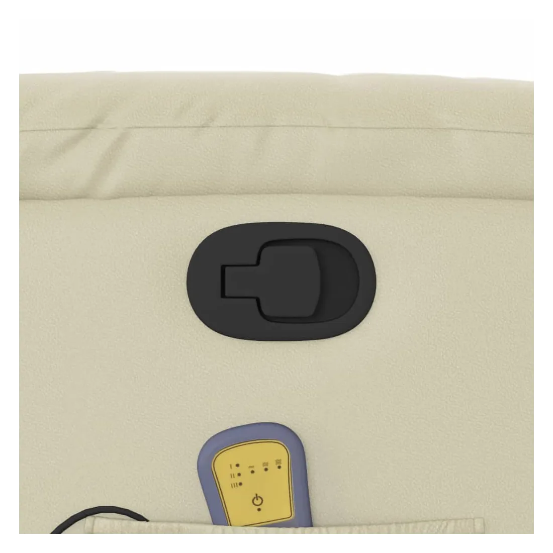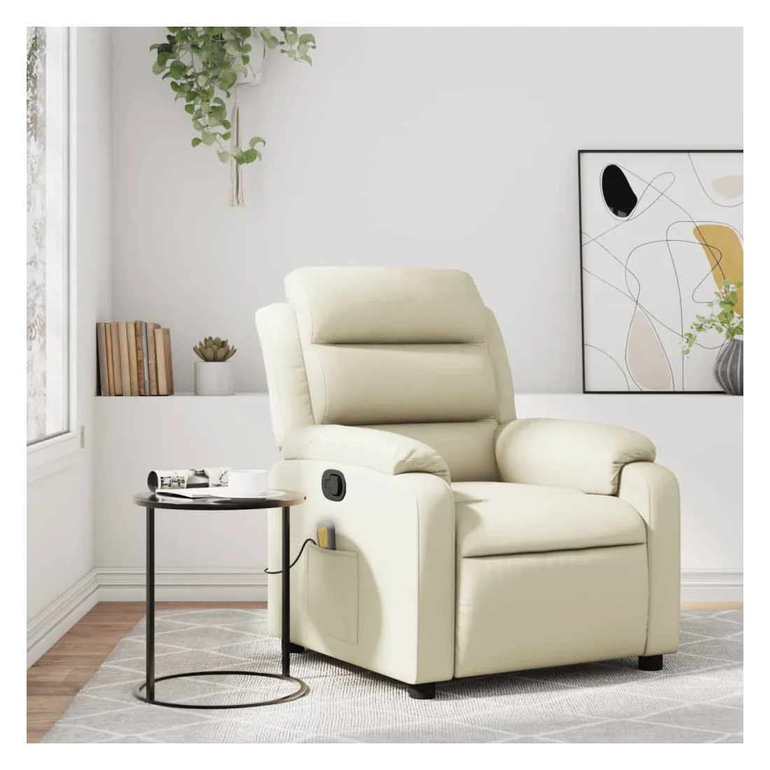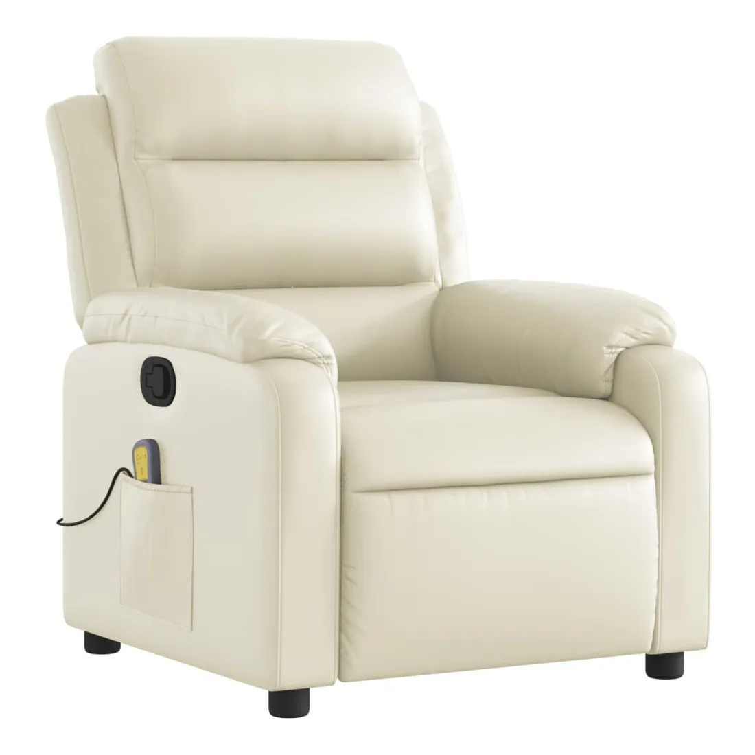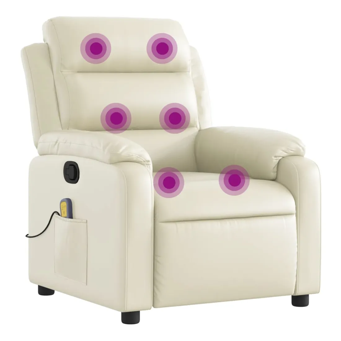 Asseyez-vous et détendez-vous dans ce fauteuil inclinable de massage très confortable ! Fonction d'inclinaison manuelle : ce fauteuil inclinable est doté d'une poignée du côté droit. Vous pouvez régler manuellement le repose-pieds et le dossier dans n'importe quelle position selon votre confort en tirant simplement sur la poignée. Cette fonction permet une inclinaison maximale de 135 degrés. De plus, le dossier peut revenir rapidement à sa position d'origine en tirant simplement sur la poignée.Fonction de vibration : les 6 points de massage vous permettent de faire l'expérience d'un massage mieux ciblé. De plus, la télécommande incluse vous permet de choisir différents programmes de massage. La fonction de massage est alimentée par le connecteur USB, mais la source d'alimentation USB 5V certifiée n'est pas incluse.Expérience de siège confortable : le siège, le dossier et les larges accoudoirs rembourrés épais recouverts de similicuir procurent une sensation confortable, vous faisant vous sentir enlacé lorsque vous êtes assis. Le similicuir est un matériau très résistant. Il est résistant aux taches, ce qui le rend facile à nettoyer avec un chiffon humide. La surface lisse donne également un aspect luxueux et la beauté du cuir véritable.Poche latérale pratique : ce fauteuil est doté d'une poche latérale pour ranger votre télécommande ou garder vos objets essentiels à portée de main.Cadre solide et stable : le cadre en bois et en métal offre une structure solide et une grande stabilité. Ce fauteuil inclinable est confortable et durable.