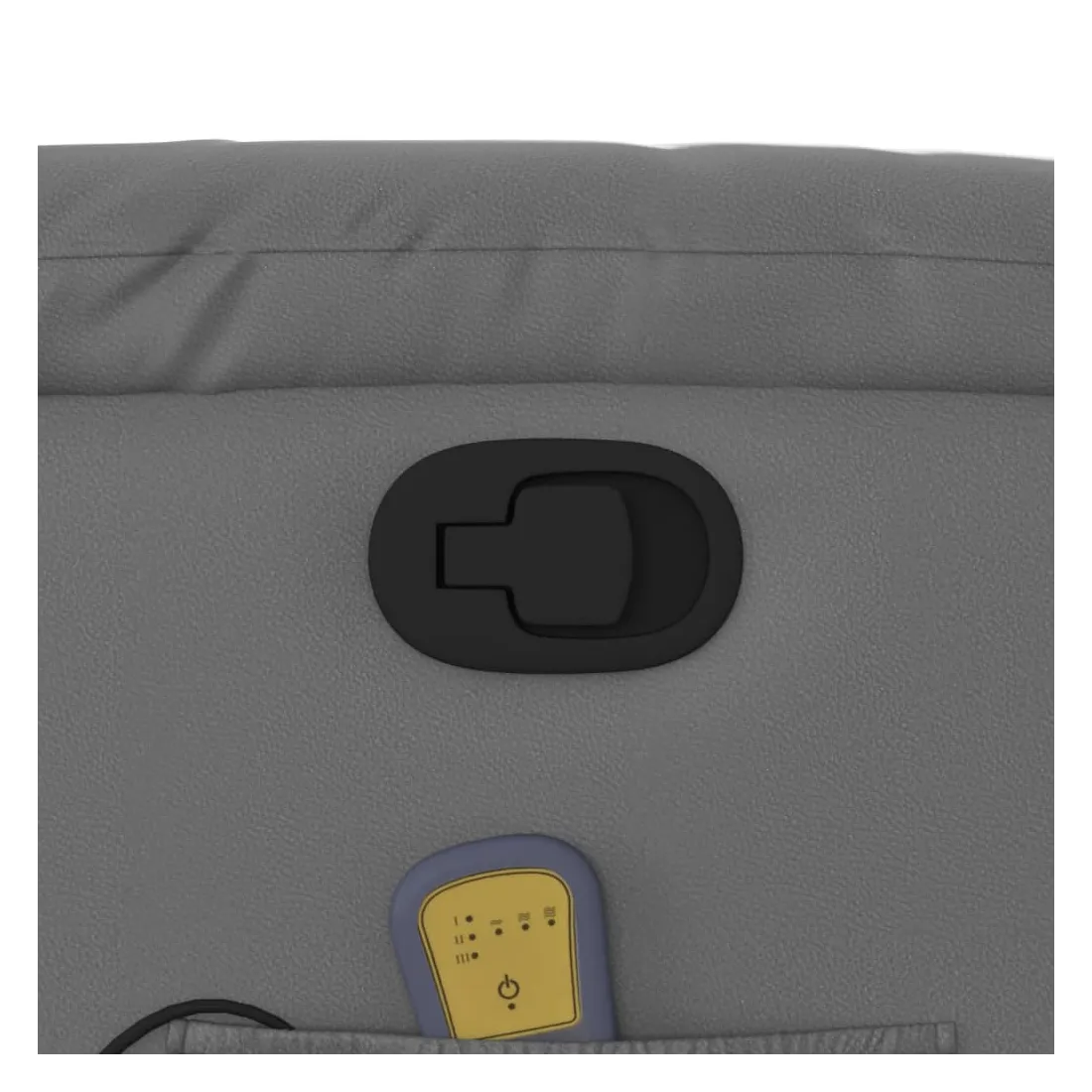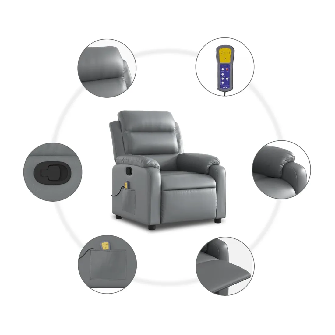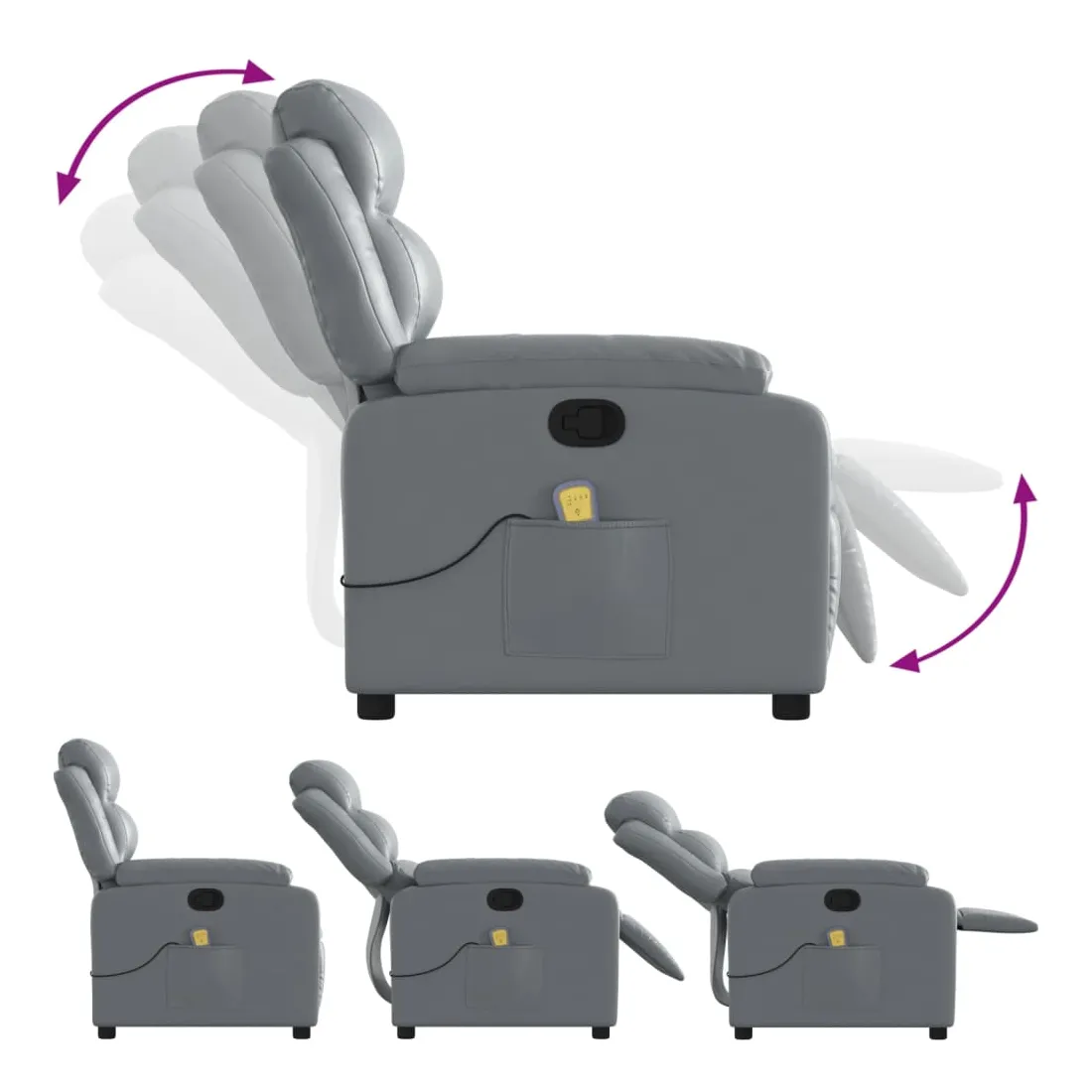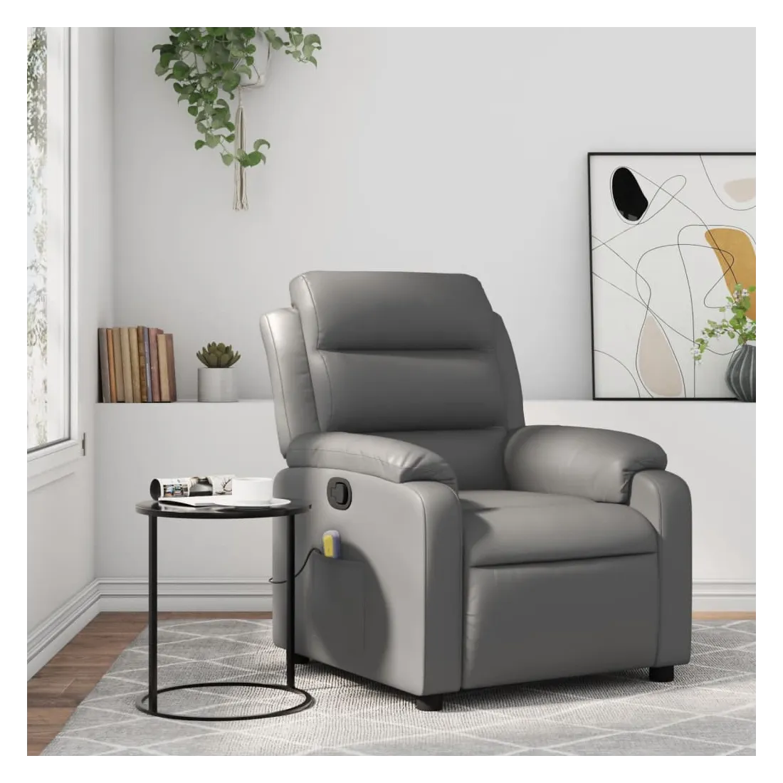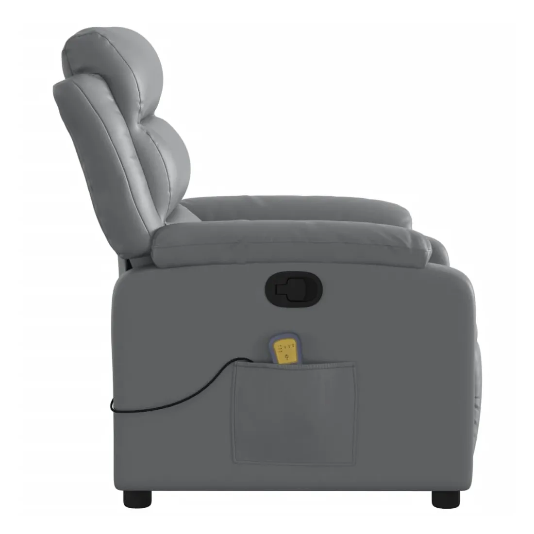 Asseyez-vous et détendez-vous dans ce fauteuil inclinable de massage très confortable ! Fonction d'inclinaison manuelle : ce fauteuil inclinable est doté d'une poignée du côté droit. Vous pouvez régler manuellement le repose-pieds et le dossier dans n'importe quelle position selon votre confort en tirant simplement sur la poignée. Cette fonction permet une inclinaison maximale de 135 degrés. De plus, le dossier peut revenir rapidement à sa position d'origine en tirant simplement sur la poignée.Fonction de vibration : les 6 points de massage vous permettent de faire l'expérience d'un massage mieux ciblé. De plus, la télécommande incluse vous permet de choisir différents programmes de massage. La fonction de massage est alimentée par le connecteur USB, mais la source d'alimentation USB 5V certifiée n'est pas incluse.Expérience de siège confortable : le siège, le dossier et les larges accoudoirs rembourrés épais recouverts de similicuir procurent une sensation confortable, vous faisant vous sentir enlacé lorsque vous êtes assis. Le similicuir est un matériau très résistant. Il est résistant aux taches, ce qui le rend facile à nettoyer avec un chiffon humide. La surface lisse donne également un aspect luxueux et la beauté du cuir véritable.Poche latérale pratique : ce fauteuil est doté d'une poche latérale pour ranger votre télécommande ou garder vos objets essentiels à portée de main.Cadre solide et stable : le cadre en bois et en métal offre une structure solide et une grande stabilité. Ce fauteuil inclinable est confortable et durable.