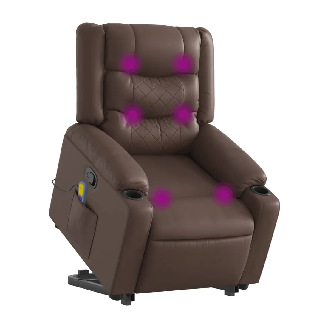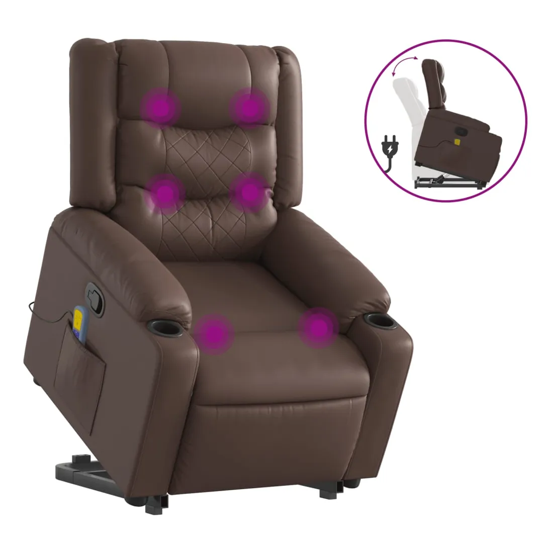 Asseyez-vous et détendez-vous dans ce fauteuil inclinable de massage très confortable ! Fonction de levage électrique : ce fauteuil inclinable pour personnes âgées est équipé d'un moteur électrique pour la fonction de levage. Grâce à la fonction qui pousse toute la chaise vers le haut, vous pouvez facilement vous tenir debout sans stresser votre dos et vos genoux en appuyant simplement sur le bouton.Fonction d'inclinaison manuelle : ce fauteuil inclinable est doté d'une poignée du côté droit. Vous pouvez régler manuellement le repose-pieds et le dossier dans n'importe quelle position selon votre confort en tirant simplement sur la poignée. Cette fonction permet une inclinaison maximale de 135 degrés. De plus, le dossier peut revenir rapidement à sa position d'origine en tirant simplement sur la poignée.Fonction de vibration : les 6 points de massage vous permettent de faire l'expérience d'un massage mieux ciblé. De plus, la télécommande incluse vous permet de choisir différents programmes de massage. La fonction de massage est alimentée par le connecteur USB qui nécessite une source d'alimentation USB certifiée de 5 V (non fournie).Expérience de siège confortable : le siège, le dossier et les larges accoudoirs rembourrés épais recouverts de similicuir procurent une sensation confortable, vous faisant vous sentir enlacé lorsque vous êtes assis. Le similicuir est un matériau très résistant. Il est résistant aux taches, ce qui le rend facile à nettoyer avec un chiffon humide. La surface lisse donne également un aspect luxueux et la beauté du cuir véritable.Poche latérale pratique : ce fauteuil est doté d'une poche latérale pour ranger votre télécommande ou garder vos objets essentiels à portée de main.Cadre solide et stable : le cadre en bois et en métal offre une structure solide et une grande stabilité. Ce fauteuil inclinable est confortable et durable.