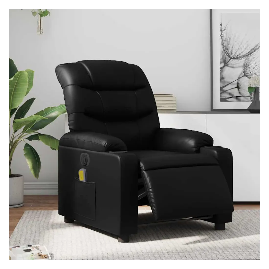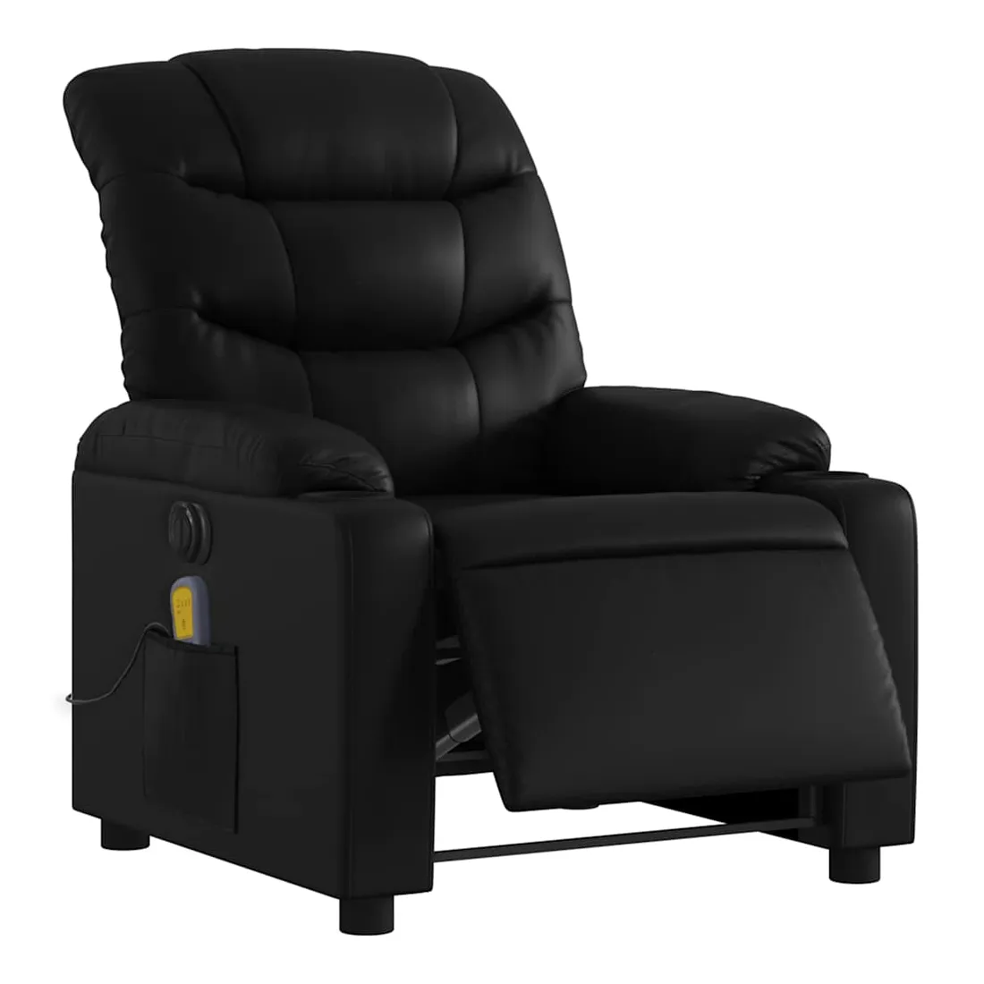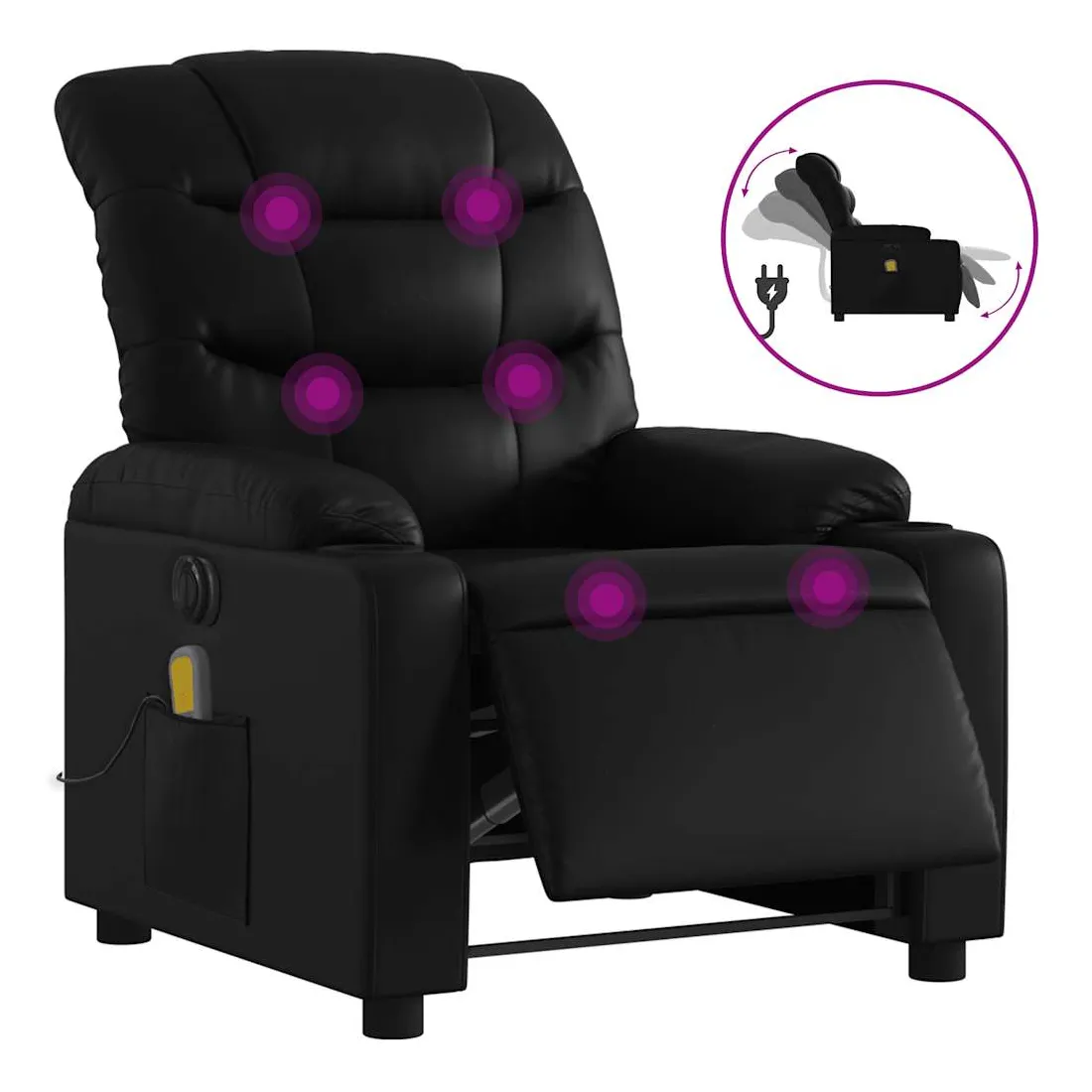 Asseyez-vous et détendez-vous dans ce fauteuil inclinable de massage électrique très confortable ! Fonction d'inclinaison électrique : ce fauteuil inclinable est équipé d'un moteur électrique qui permet de régler automatiquement le repose-pied et le dossier dans n'importe quelle position, selon votre confort, en appuyant simplement sur le bouton situé sur le côté du fauteuil. Cette fonction permet une inclinaison maximale de 135 degrés. En outre, le dossier peut revenir automatiquement à sa position d'origine par une simple pression sur le bouton.Fonction de vibration : les 6 points de massage vous permettent de faire l'expérience d'un massage mieux ciblé. De plus, la télécommande incluse vous permet de choisir différents programmes de massage. La fonction de massage est alimentée par le connecteur USB qui nécessite une source d'alimentation USB certifiée de 5 V (non fournie).Expérience de siège confortable : le siège, le dossier et les larges accoudoirs rembourrés épais recouverts de similicuir procurent une sensation confortable et chaleureuse, vous faisant vous sentir enlacé lorsque vous êtes assis. Le simili cuir est un matériau très résistant. Il est résistant aux taches, ce qui le rend facile à nettoyer avec un chiffon humide. La surface lisse donne également un aspect luxueux et la beauté du cuir véritable.Poche latérale pratique : ce fauteuil est doté d'une poche latérale pour ranger votre télécommande ou garder vos objets essentiels à portée de main.Cadre solide et stable : le cadre en bois et en métal offre une structure solide et une grande stabilité. Ce fauteuil inclinable est confortable et durable.