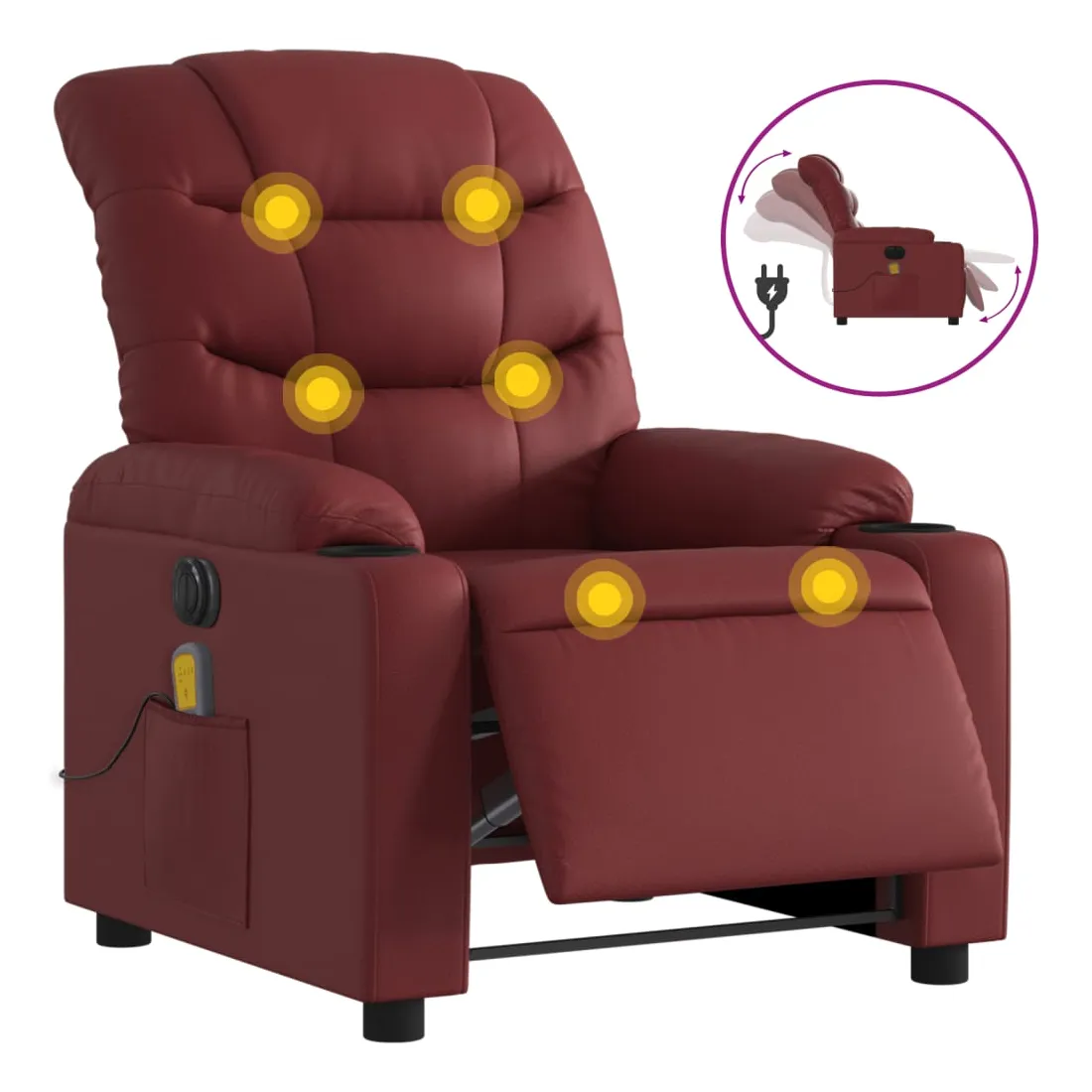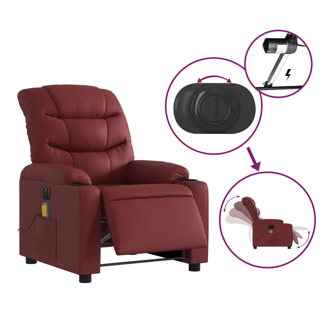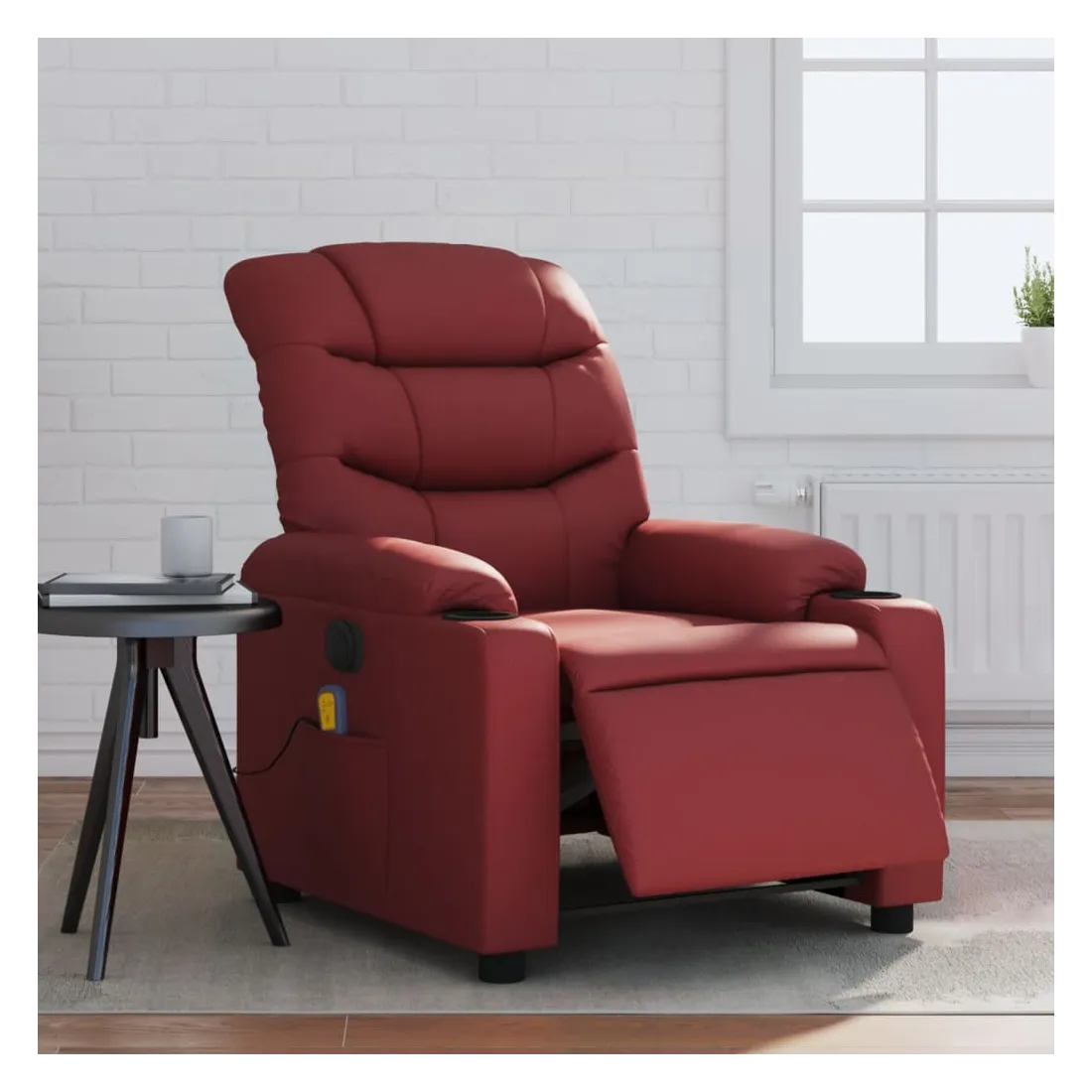 Asseyez-vous et détendez-vous dans ce fauteuil inclinable de massage électrique très confortable ! Fonction d'inclinaison électrique : ce fauteuil inclinable est équipé d'un moteur électrique qui permet de régler automatiquement le repose-pied et le dossier dans n'importe quelle position, selon votre confort, en appuyant simplement sur le bouton situé sur le côté du fauteuil. Cette fonction permet une inclinaison maximale de 135 degrés. En outre, le dossier peut revenir automatiquement à sa position d'origine par une simple pression sur le bouton.Fonction de vibration : les 6 points de massage vous permettent de faire l'expérience d'un massage mieux ciblé. De plus, la télécommande incluse vous permet de choisir différents programmes de massage. La fonction de massage est alimentée par le connecteur USB qui nécessite une source d'alimentation USB certifiée de 5 V (non fournie).Expérience de siège confortable : le siège, le dossier et les larges accoudoirs rembourrés épais recouverts de similicuir procurent une sensation confortable et chaleureuse, vous faisant vous sentir enlacé lorsque vous êtes assis. Le simili cuir est un matériau très résistant. Il est résistant aux taches, ce qui le rend facile à nettoyer avec un chiffon humide. La surface lisse donne également un aspect luxueux et la beauté du cuir véritable.Poche latérale pratique : ce fauteuil est doté d'une poche latérale pour ranger votre télécommande ou garder vos objets essentiels à portée de main.Cadre solide et stable : le cadre en bois et en métal offre une structure solide et une grande stabilité. Ce fauteuil inclinable est confortable et durable.