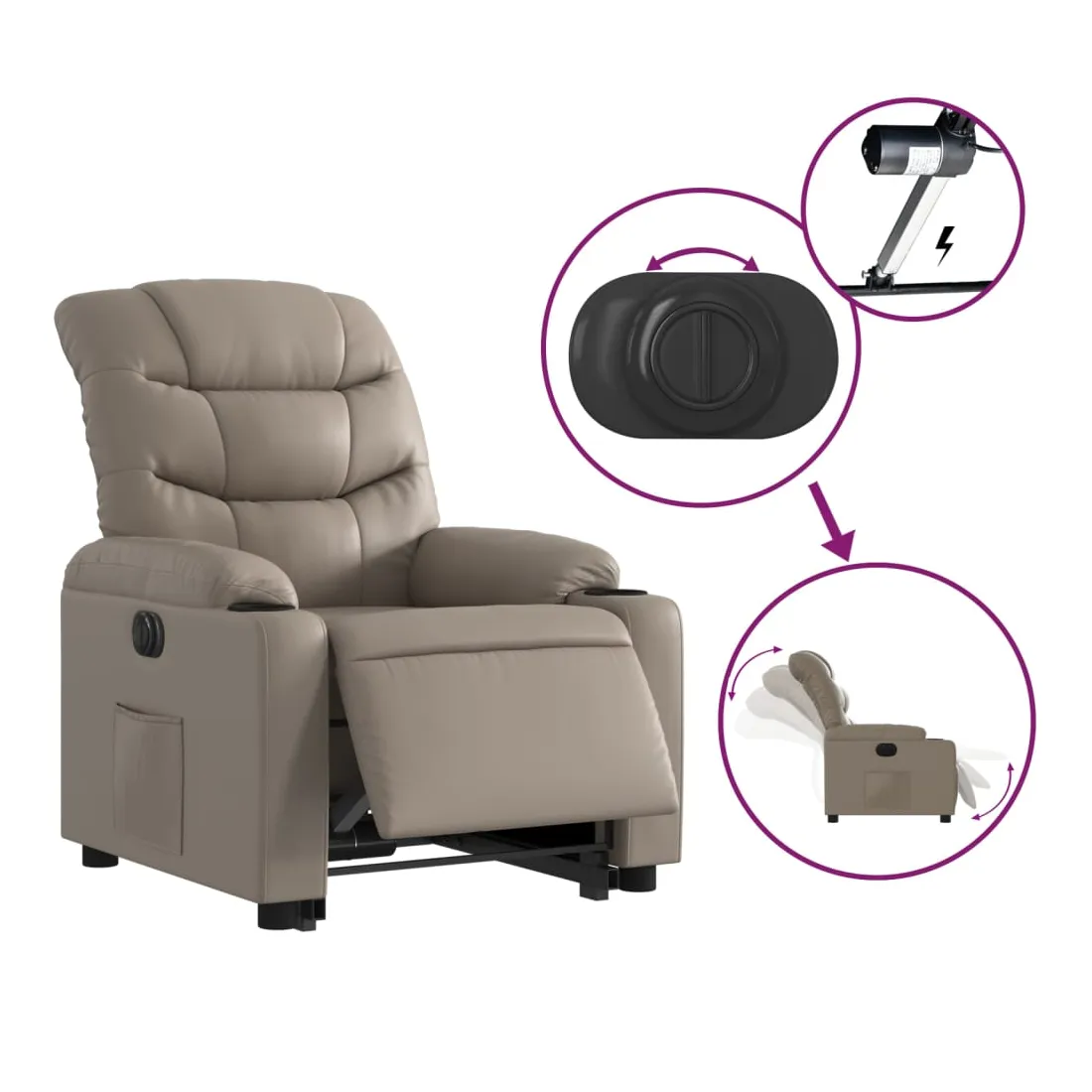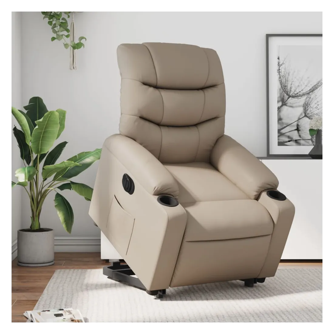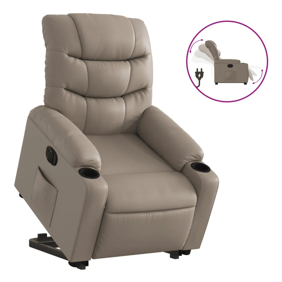 Asseyez-vous et détendez-vous dans ce fauteuil inclinable électrique très confortable ! Fonction de levage électrique : ce fauteuil inclinable pour personnes âgées est équipé d'un moteur électrique pour la fonction de levage. Grâce à la fonction qui pousse toute la chaise vers le haut, vous pouvez facilement vous tenir debout sans stresser votre dos et vos genoux en appuyant simplement sur le bouton.Fonction d'inclinaison électrique : ce fauteuil inclinable est également équipé d'un moteur électrique qui permet de régler automatiquement le repose-pied et le dossier dans n'importe quelle position, selon votre confort, en appuyant simplement sur le bouton situé sur le côté du fauteuil. Cette fonction permet une inclinaison maximale de 135 degrés. En outre, le dossier peut revenir automatiquement à sa position d'origine par une simple pression sur le bouton.Expérience de siège confortable : le siège, le dossier et les larges accoudoirs rembourrés épais recouverts de similicuir procurent une sensation confortable et chaleureuse, vous faisant vous sentir enlacé lorsque vous êtes assis. Le simili cuir est un matériau très résistant. Il est résistant aux taches, ce qui le rend facile à nettoyer avec un chiffon humide. La surface lisse donne également un aspect luxueux et la beauté du cuir véritable.Poche latérale pratique : ce fauteuil est doté d'une poche latérale pour vous permettre de garder vos objets essentiels à portée de main.Cadre solide et stable : le cadre en bois et en métal offre une structure solide et une grande stabilité. Ce fauteuil inclinable est confortable et durable.