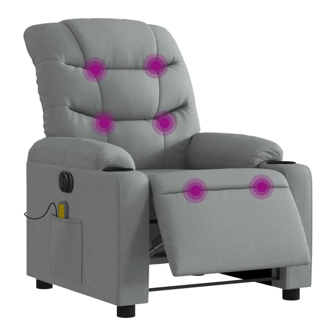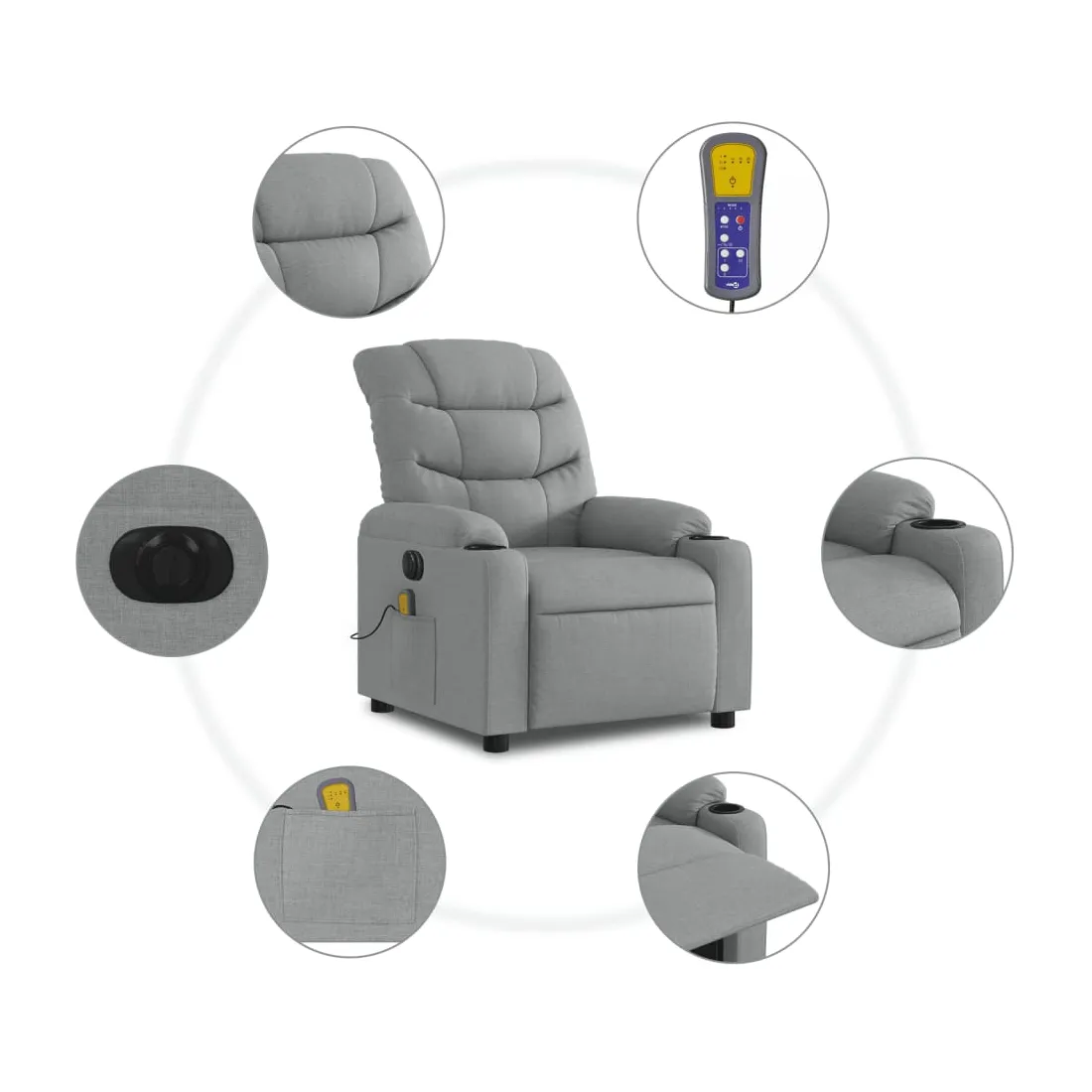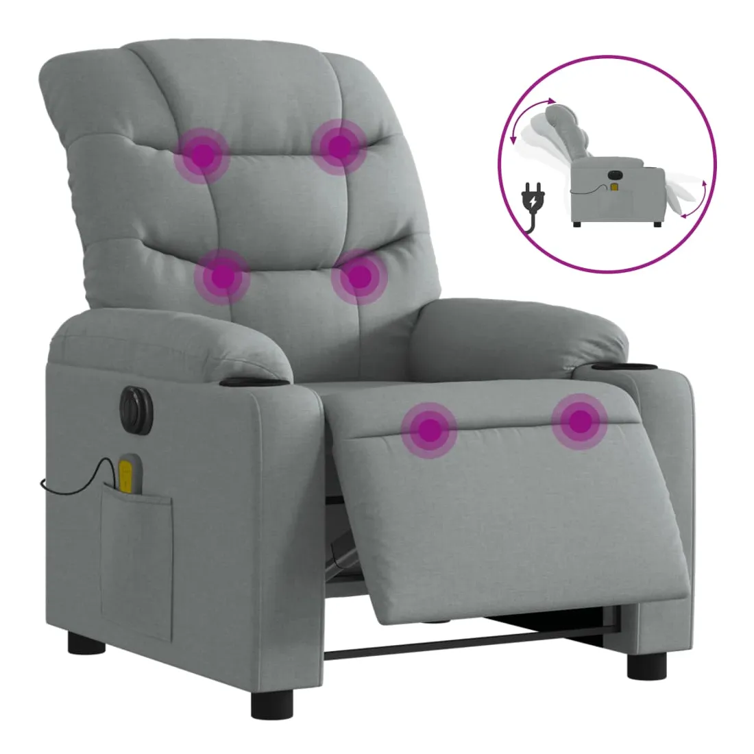 Asseyez-vous et détendez-vous dans ce fauteuil inclinable de massage électrique très confortable ! Fonction d'inclinaison électrique : ce fauteuil inclinable est équipé d'un moteur électrique qui permet de régler automatiquement le repose-pied et le dossier dans n'importe quelle position, selon votre confort, en appuyant simplement sur le bouton situé sur le côté du fauteuil. Cette fonction permet une inclinaison maximale de 135 degrés. En outre, le dossier peut revenir automatiquement à sa position d'origine par une simple pression sur le bouton.Fonction de vibration : les 6 points de massage vous permettent de faire l'expérience d'un massage mieux ciblé. De plus, la télécommande incluse vous permet de choisir différents programmes de massage. La fonction de massage est alimentée par le connecteur USB qui nécessite une source d'alimentation USB certifiée de 5 V (non fournie).Expérience d'assise confortable : le siège, le dossier et les larges accoudoirs bien rembourrés recouverts de tissu procurent une sensation confortable et chaleureuse, vous permettant de vous sentir enveloppé lorsque vous êtes assis. Le tissu présente un aspect simple et épuré et est respirant et durable.Poche latérale pratique : ce fauteuil est doté d'une poche latérale pour ranger votre télécommande ou garder vos objets essentiels à portée de main.Cadre solide et stable : le cadre en bois et en métal offre une structure solide et une grande stabilité. Ce fauteuil inclinable est confortable et durable.