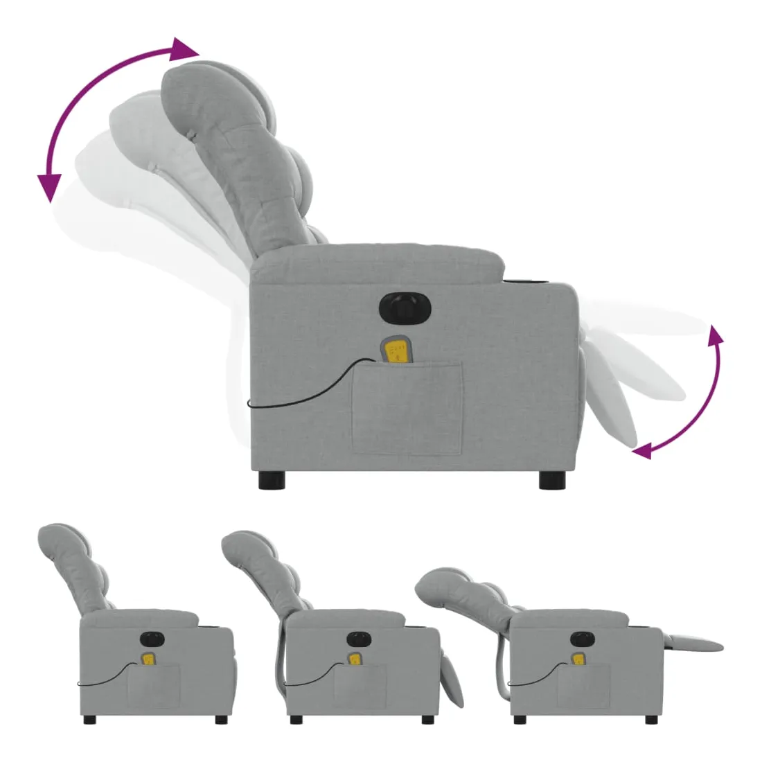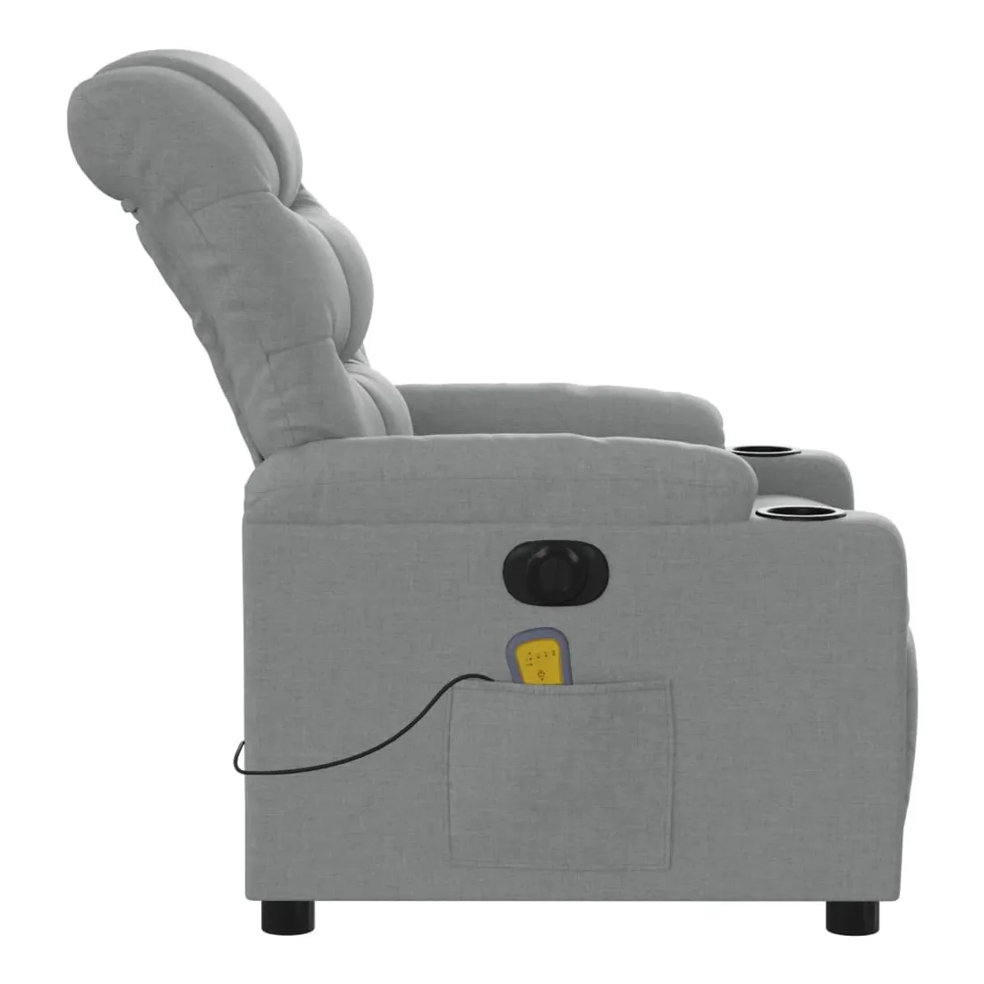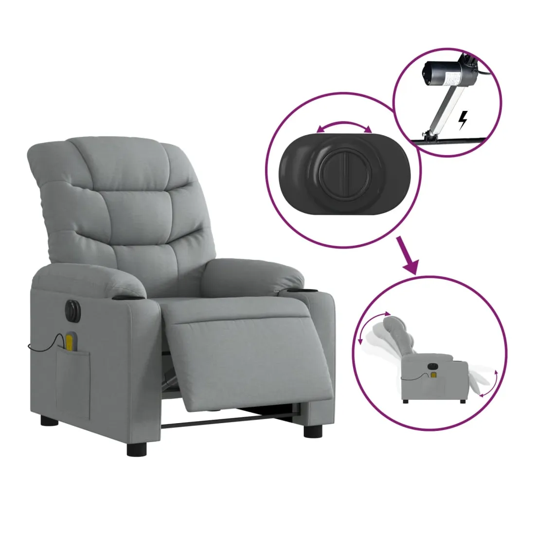 Asseyez-vous et détendez-vous dans ce fauteuil inclinable de massage électrique très confortable ! Fonction d'inclinaison électrique : ce fauteuil inclinable est équipé d'un moteur électrique qui permet de régler automatiquement le repose-pied et le dossier dans n'importe quelle position, selon votre confort, en appuyant simplement sur le bouton situé sur le côté du fauteuil. Cette fonction permet une inclinaison maximale de 135 degrés. En outre, le dossier peut revenir automatiquement à sa position d'origine par une simple pression sur le bouton.Fonction de vibration : les 6 points de massage vous permettent de faire l'expérience d'un massage mieux ciblé. De plus, la télécommande incluse vous permet de choisir différents programmes de massage. La fonction de massage est alimentée par le connecteur USB qui nécessite une source d'alimentation USB certifiée de 5 V (non fournie).Expérience d'assise confortable : le siège, le dossier et les larges accoudoirs bien rembourrés recouverts de tissu procurent une sensation confortable et chaleureuse, vous permettant de vous sentir enveloppé lorsque vous êtes assis. Le tissu présente un aspect simple et épuré et est respirant et durable.Poche latérale pratique : ce fauteuil est doté d'une poche latérale pour ranger votre télécommande ou garder vos objets essentiels à portée de main.Cadre solide et stable : le cadre en bois et en métal offre une structure solide et une grande stabilité. Ce fauteuil inclinable est confortable et durable.