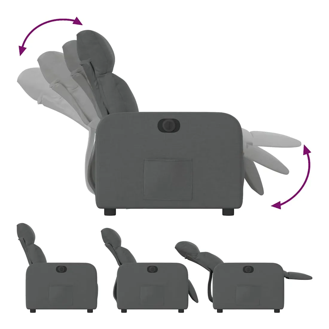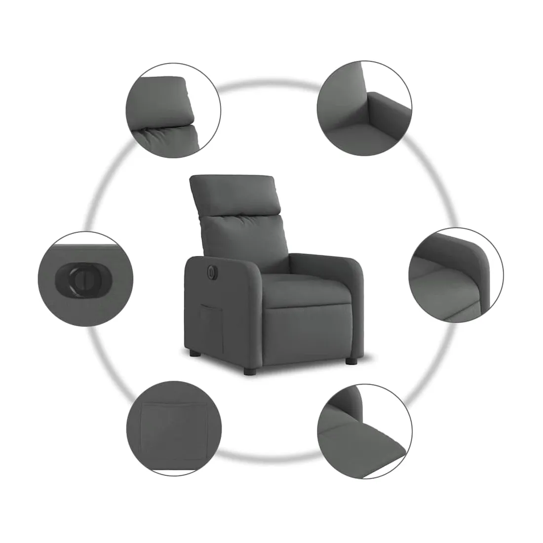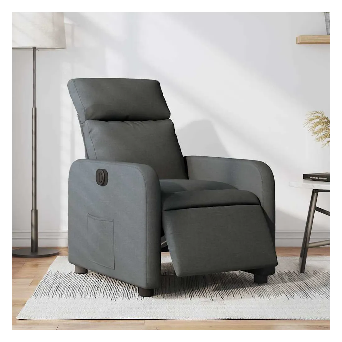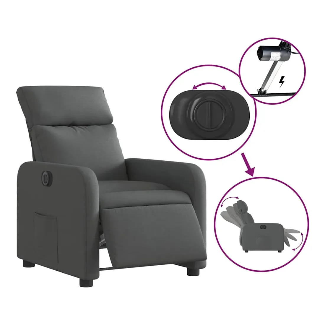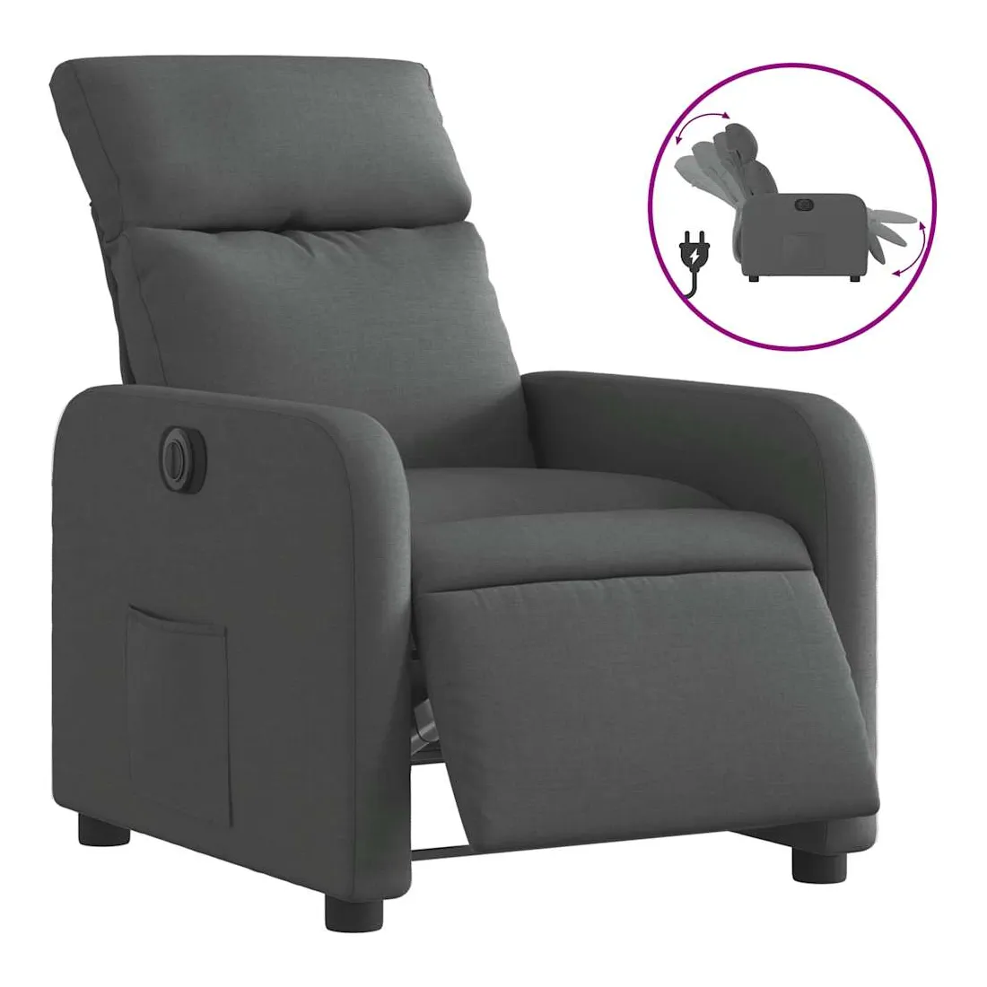 Asseyez-vous et détendez-vous dans ce fauteuil inclinable électrique très confortable ! Fonction d'inclinaison électrique : ce fauteuil inclinable est équipé d'un moteur électrique qui permet de régler automatiquement le repose-pied et le dossier dans n'importe quelle position, selon votre confort, en appuyant simplement sur le bouton situé sur le côté du fauteuil. Cette fonction permet une inclinaison maximale de 135 degrés. En outre, le dossier peut revenir automatiquement à sa position d'origine par une simple pression sur le bouton.Expérience d'assise confortable : le siège, le dossier et les larges accoudoirs bien rembourrés recouverts de tissu procurent une sensation confortable et chaleureuse, vous permettant de vous sentir enveloppé lorsque vous êtes assis. Le tissu présente un aspect simple et épuré et est respirant et durable.Poche latérale pratique : ce fauteuil est doté d'une poche latérale pour vous permettre de garder vos objets essentiels à portée de main.Cadre solide et stable : le cadre en bois et en métal offre une structure solide et une grande stabilité. Ce fauteuil inclinable est confortable et durable.