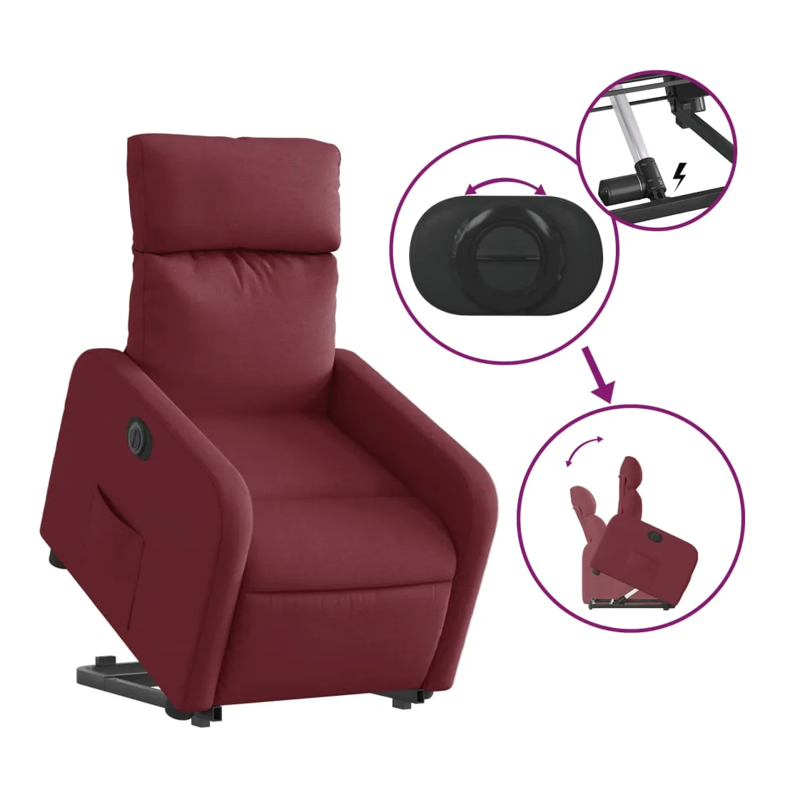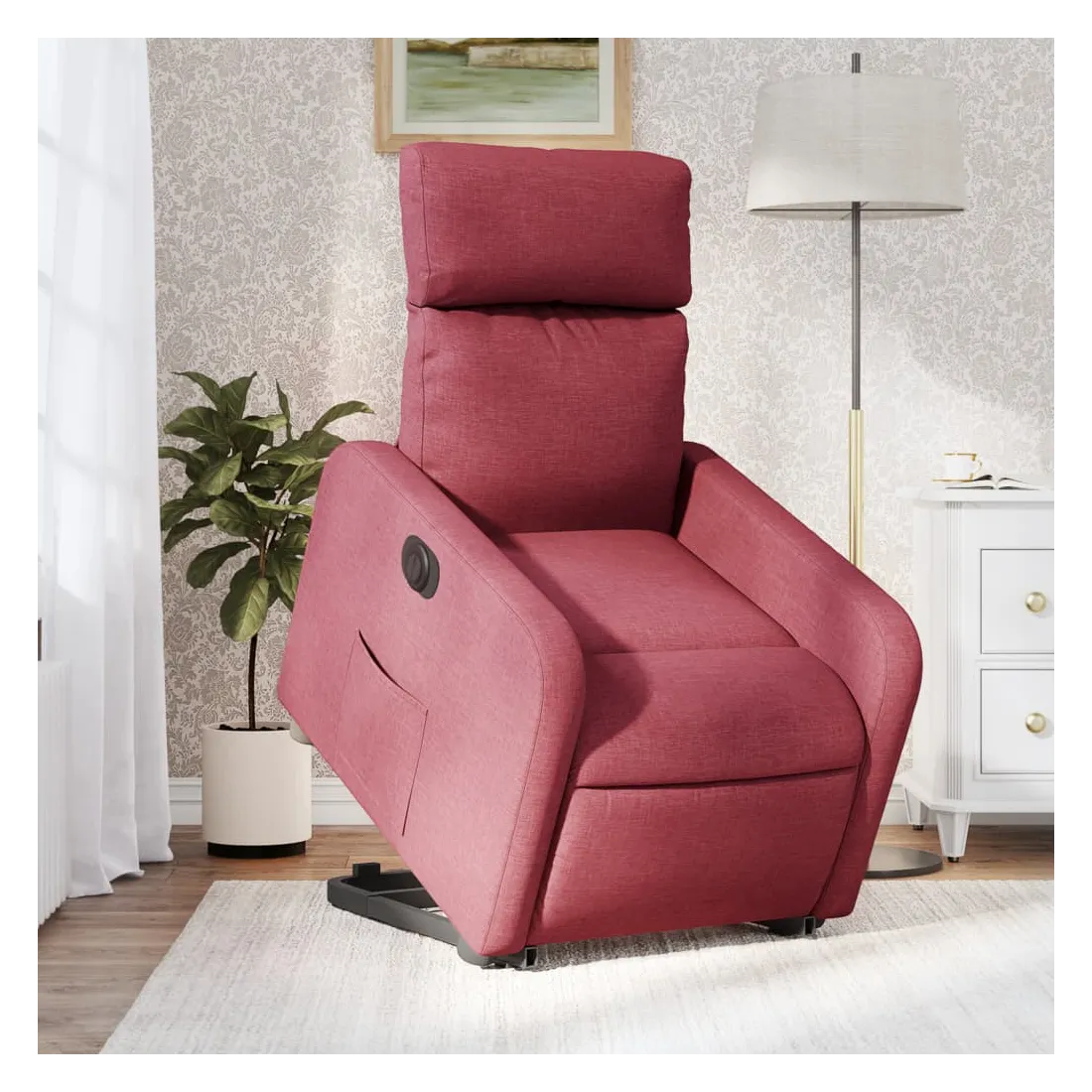 Asseyez-vous et détendez-vous dans ce fauteuil inclinable électrique très confortable ! Fonction de levage électrique : ce fauteuil inclinable pour personnes âgées est équipé d'un moteur électrique pour la fonction de levage. Grâce à la fonction qui pousse toute la chaise vers le haut, vous pouvez facilement vous tenir debout sans stresser votre dos et vos genoux en appuyant simplement sur le bouton.Fonction d'inclinaison électrique : ce fauteuil inclinable est également équipé d'un moteur électrique qui permet de régler automatiquement le repose-pied et le dossier dans n'importe quelle position, selon votre confort, en appuyant simplement sur le bouton situé sur le côté du fauteuil. Cette fonction permet une inclinaison maximale de 135 degrés. En outre, le dossier peut revenir automatiquement à sa position d'origine par une simple pression sur le bouton.Expérience d'assise confortable : le siège, le dossier et les larges accoudoirs bien rembourrés recouverts de tissu procurent une sensation confortable et chaleureuse, vous permettant de vous sentir enveloppé lorsque vous êtes assis. Le tissu présente un aspect simple et épuré et est respirant et durable.Poche latérale pratique : ce fauteuil est doté d'une poche latérale pour vous permettre de garder vos objets essentiels à portée de main.Cadre solide et stable : le cadre en bois et en métal offre une structure solide et une grande stabilité. Ce fauteuil inclinable est confortable et durable.