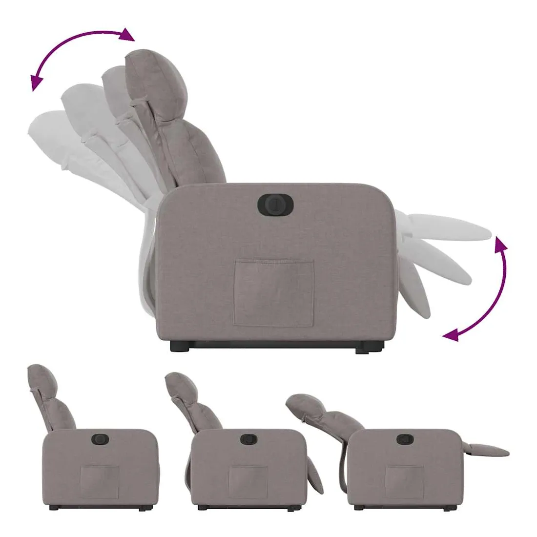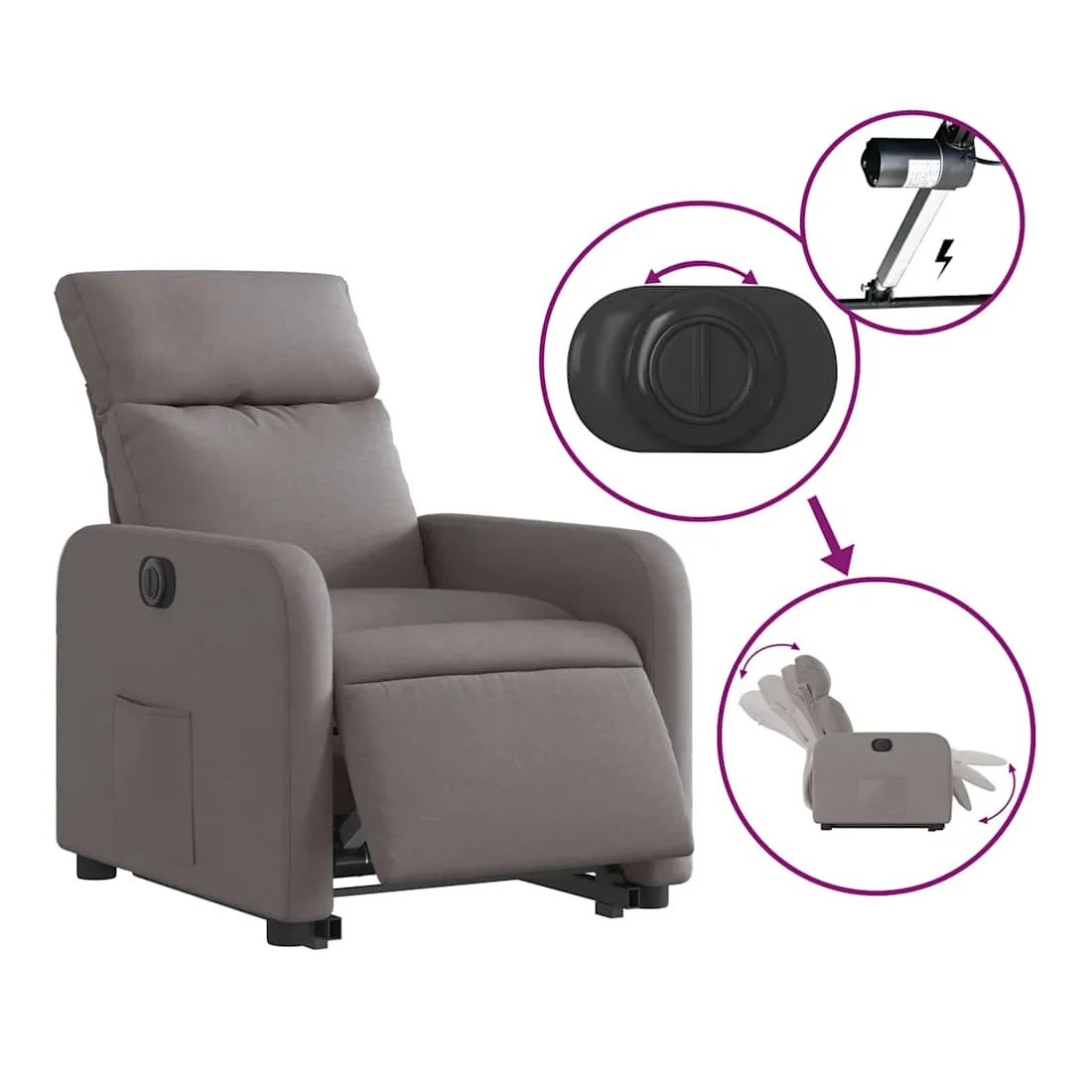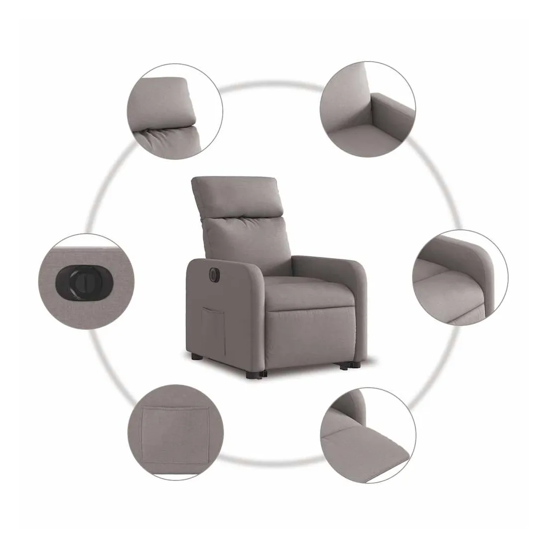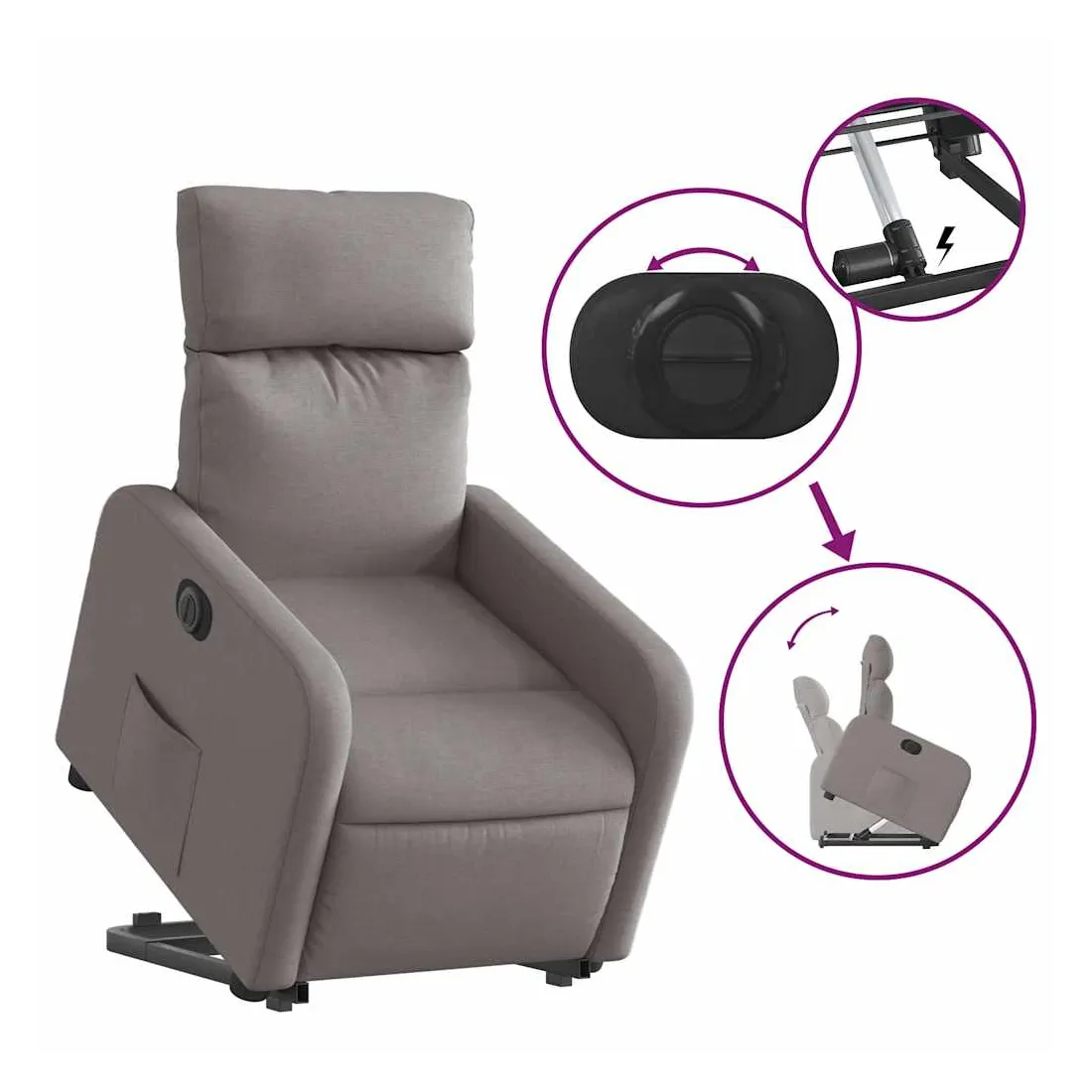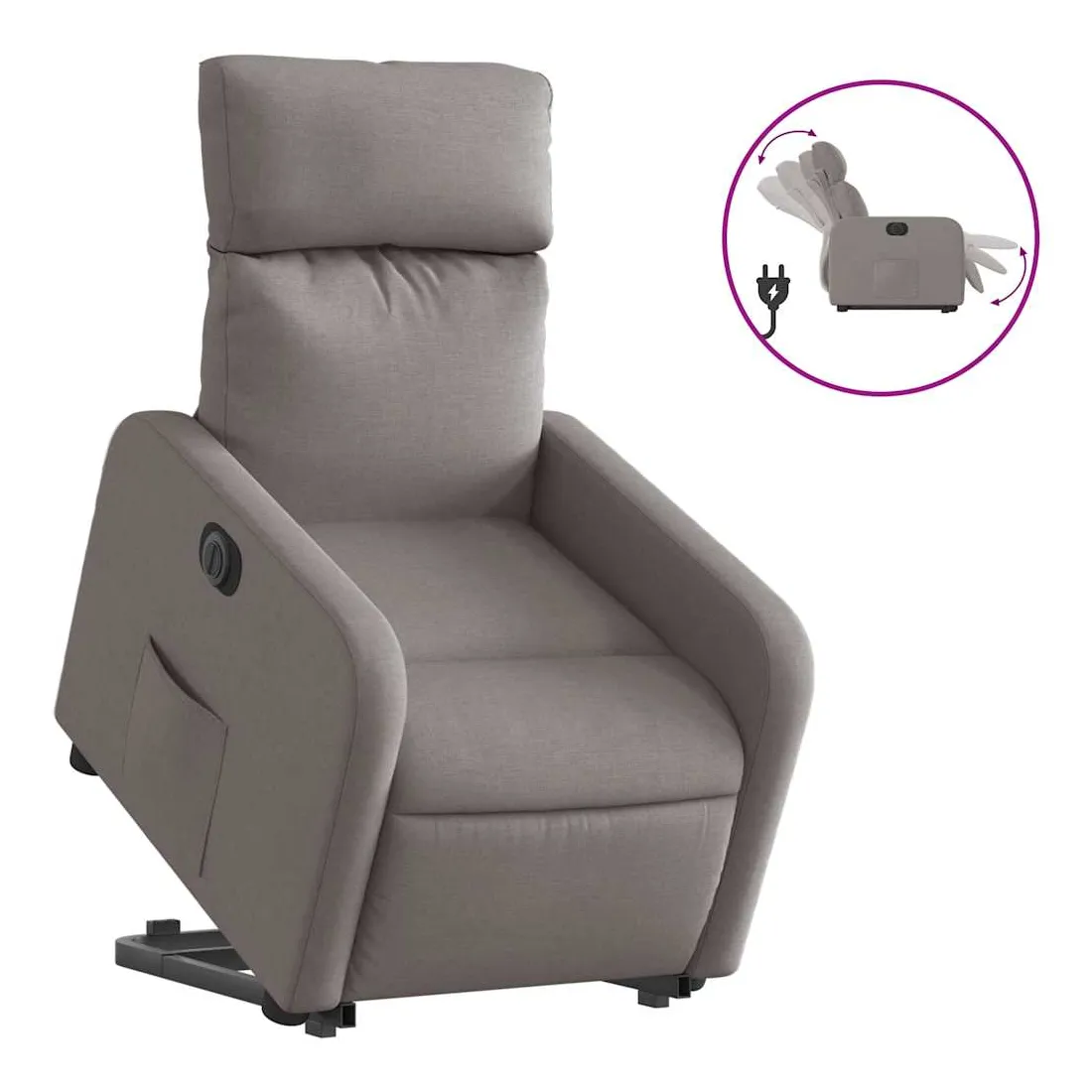 Asseyez-vous et détendez-vous dans ce fauteuil inclinable électrique très confortable ! Fonction de levage électrique : ce fauteuil inclinable pour personnes âgées est équipé d'un moteur électrique pour la fonction de levage. Grâce à la fonction qui pousse toute la chaise vers le haut, vous pouvez facilement vous tenir debout sans stresser votre dos et vos genoux en appuyant simplement sur le bouton.Fonction d'inclinaison électrique : ce fauteuil inclinable est également équipé d'un moteur électrique qui permet de régler automatiquement le repose-pied et le dossier dans n'importe quelle position, selon votre confort, en appuyant simplement sur le bouton situé sur le côté du fauteuil. Cette fonction permet une inclinaison maximale de 135 degrés. En outre, le dossier peut revenir automatiquement à sa position d'origine par une simple pression sur le bouton.Expérience d'assise confortable : le siège, le dossier et les larges accoudoirs bien rembourrés recouverts de tissu procurent une sensation confortable et chaleureuse, vous permettant de vous sentir enveloppé lorsque vous êtes assis. Le tissu présente un aspect simple et épuré et est respirant et durable.Poche latérale pratique : ce fauteuil est doté d'une poche latérale pour vous permettre de garder vos objets essentiels à portée de main.Cadre solide et stable : le cadre en bois et en métal offre une structure solide et une grande stabilité. Ce fauteuil inclinable est confortable et durable.