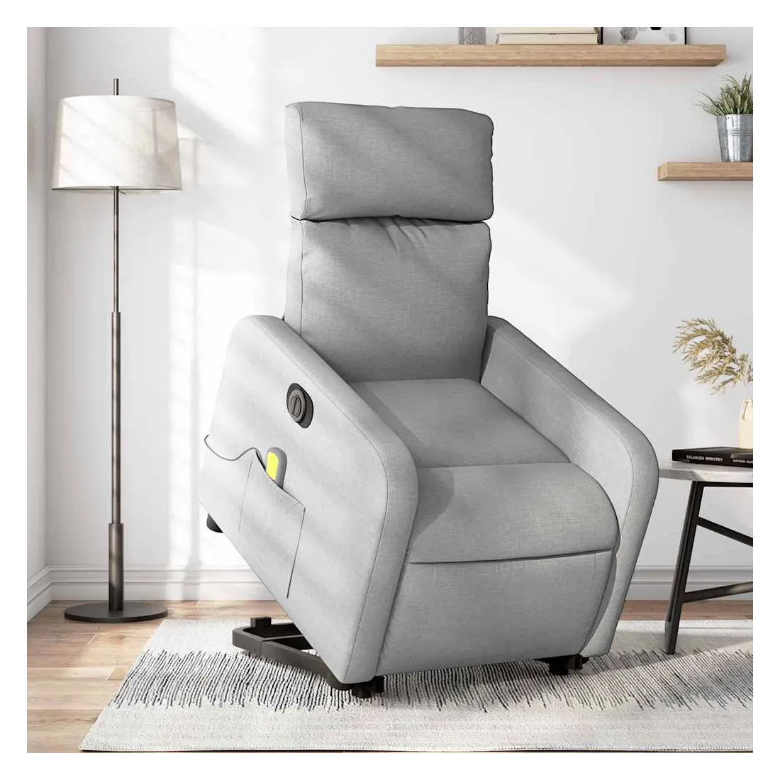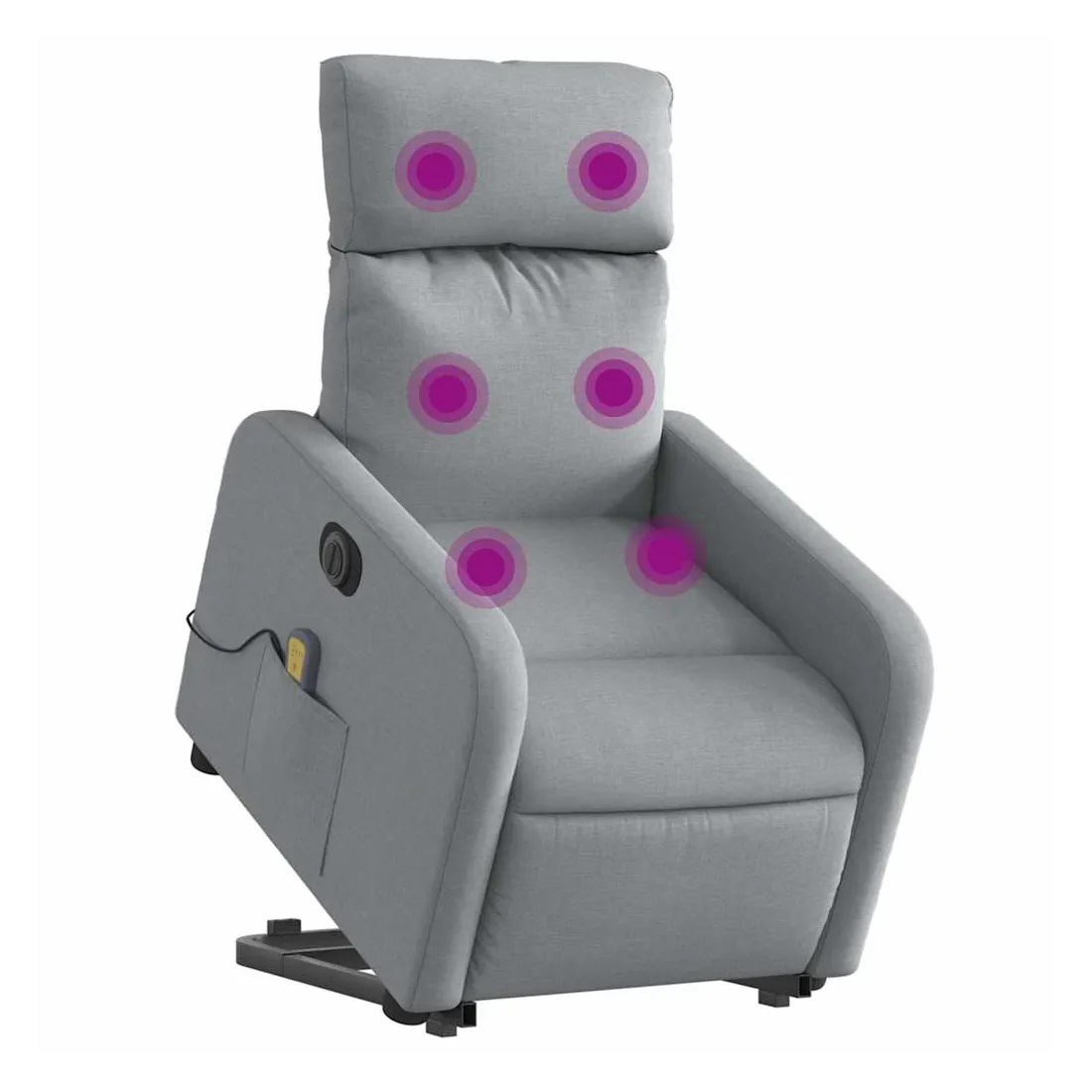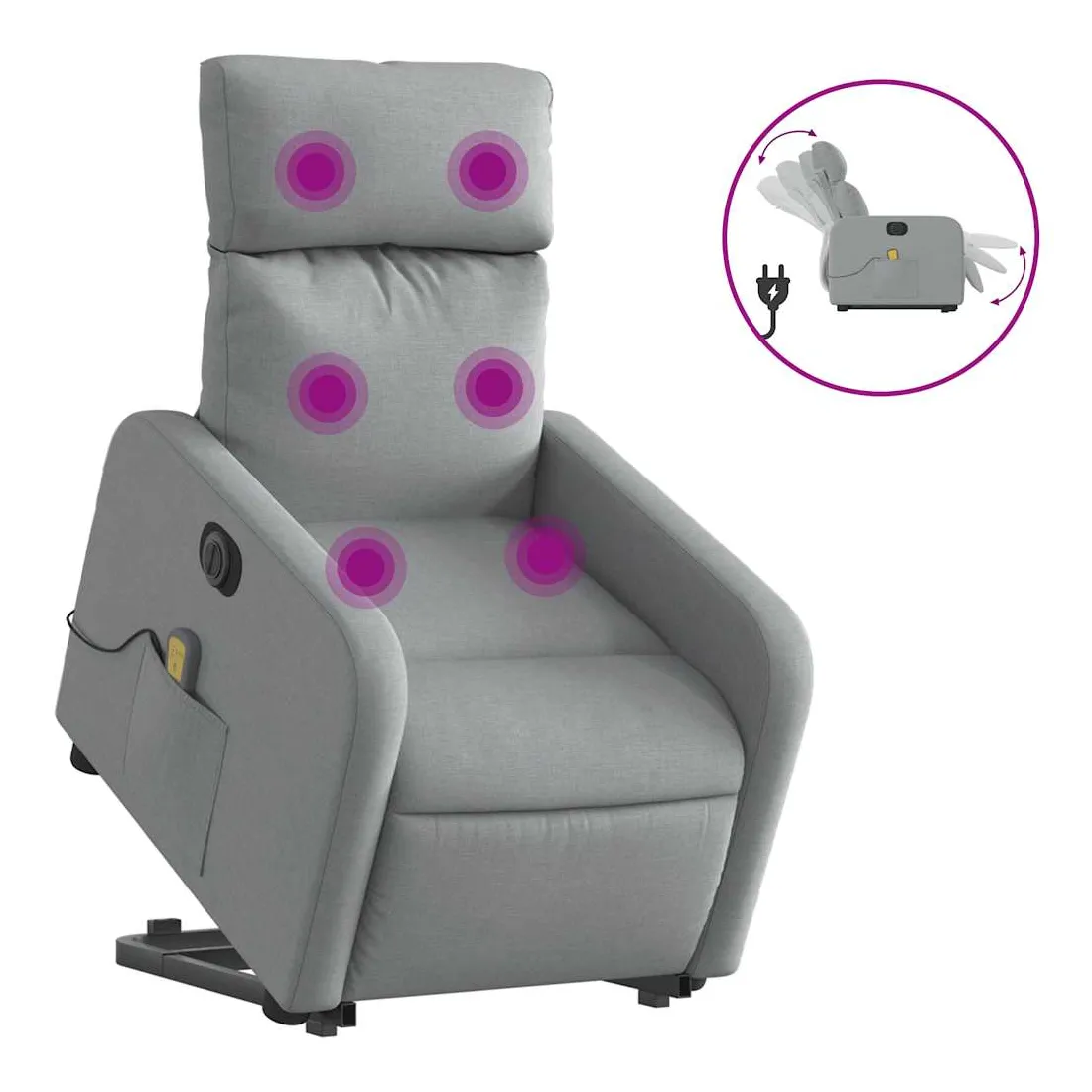 Asseyez-vous et détendez-vous dans ce fauteuil inclinable de massage électrique très confortable ! Fonction de levage électrique : ce fauteuil inclinable pour personnes âgées est équipé d'un moteur électrique pour la fonction de levage. Grâce à la fonction qui pousse toute la chaise vers le haut, vous pouvez facilement vous tenir debout sans stresser votre dos et vos genoux en appuyant simplement sur le bouton.Fonction d'inclinaison électrique : ce fauteuil inclinable est également équipé d'un moteur électrique qui permet de régler automatiquement le repose-pied et le dossier dans n'importe quelle position, selon votre confort, en appuyant simplement sur le bouton situé sur le côté du fauteuil. Cette fonction permet une inclinaison maximale de 135 degrés. En outre, le dossier peut revenir automatiquement à sa position d'origine par une simple pression sur le bouton.Fonction de vibration : les 6 points de massage vous permettent de faire l'expérience d'un massage mieux ciblé. De plus, la télécommande incluse vous permet de choisir différents programmes de massage. La fonction de massage est alimentée par le connecteur USB qui nécessite une source d'alimentation USB certifiée de 5 V (non fournie).Expérience d'assise confortable : le siège, le dossier et les larges accoudoirs bien rembourrés recouverts de tissu procurent une sensation confortable et chaleureuse, vous permettant de vous sentir enveloppé lorsque vous êtes assis. Le tissu présente un aspect simple et épuré et est respirant et durable.Poche latérale pratique : ce fauteuil est doté d'une poche latérale pour vous permettre de garder vos objets essentiels à portée de main.Cadre solide et stable : le cadre en bois et en métal offre une structure solide et une grande stabilité. Ce fauteuil inclinable est confortable et durable.