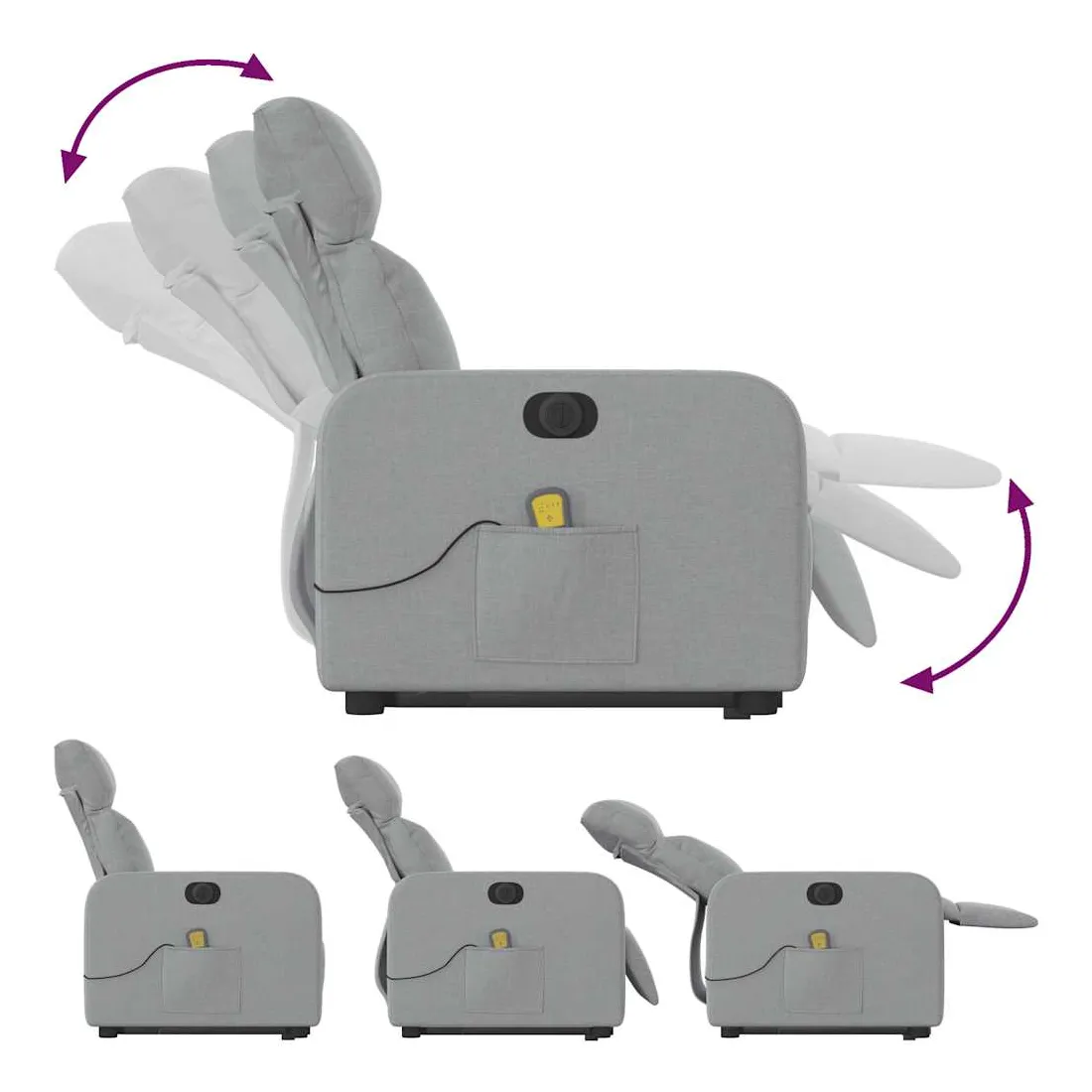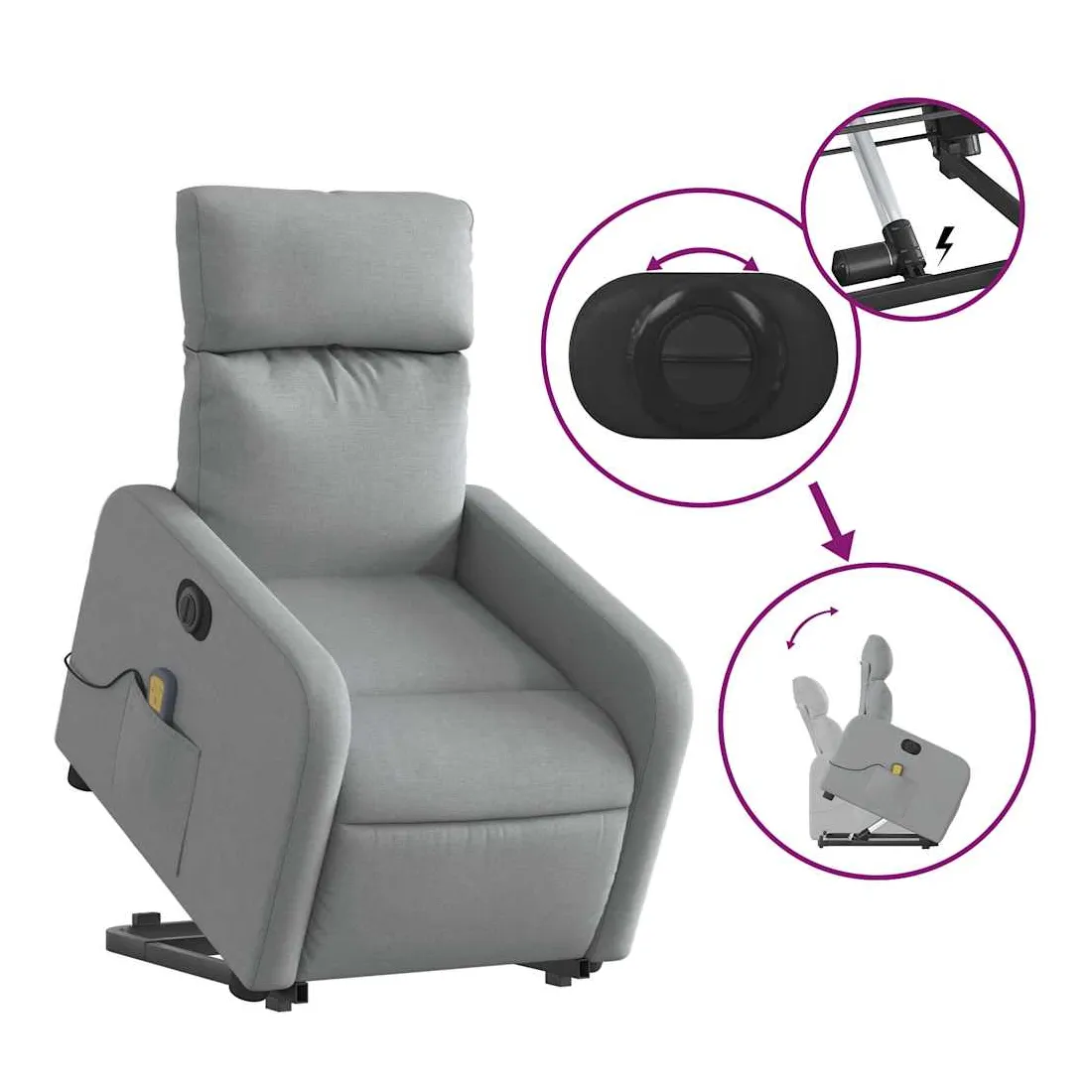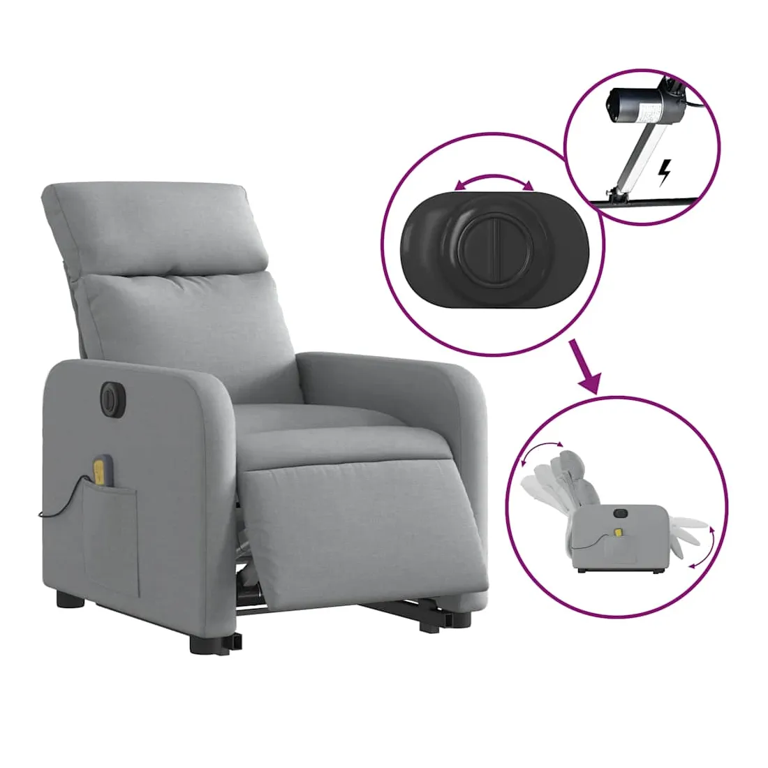 Asseyez-vous et détendez-vous dans ce fauteuil inclinable de massage électrique très confortable ! Fonction de levage électrique : ce fauteuil inclinable pour personnes âgées est équipé d'un moteur électrique pour la fonction de levage. Grâce à la fonction qui pousse toute la chaise vers le haut, vous pouvez facilement vous tenir debout sans stresser votre dos et vos genoux en appuyant simplement sur le bouton.Fonction d'inclinaison électrique : ce fauteuil inclinable est également équipé d'un moteur électrique qui permet de régler automatiquement le repose-pied et le dossier dans n'importe quelle position, selon votre confort, en appuyant simplement sur le bouton situé sur le côté du fauteuil. Cette fonction permet une inclinaison maximale de 135 degrés. En outre, le dossier peut revenir automatiquement à sa position d'origine par une simple pression sur le bouton.Fonction de vibration : les 6 points de massage vous permettent de faire l'expérience d'un massage mieux ciblé. De plus, la télécommande incluse vous permet de choisir différents programmes de massage. La fonction de massage est alimentée par le connecteur USB qui nécessite une source d'alimentation USB certifiée de 5 V (non fournie).Expérience d'assise confortable : le siège, le dossier et les larges accoudoirs bien rembourrés recouverts de tissu procurent une sensation confortable et chaleureuse, vous permettant de vous sentir enveloppé lorsque vous êtes assis. Le tissu présente un aspect simple et épuré et est respirant et durable.Poche latérale pratique : ce fauteuil est doté d'une poche latérale pour vous permettre de garder vos objets essentiels à portée de main.Cadre solide et stable : le cadre en bois et en métal offre une structure solide et une grande stabilité. Ce fauteuil inclinable est confortable et durable.