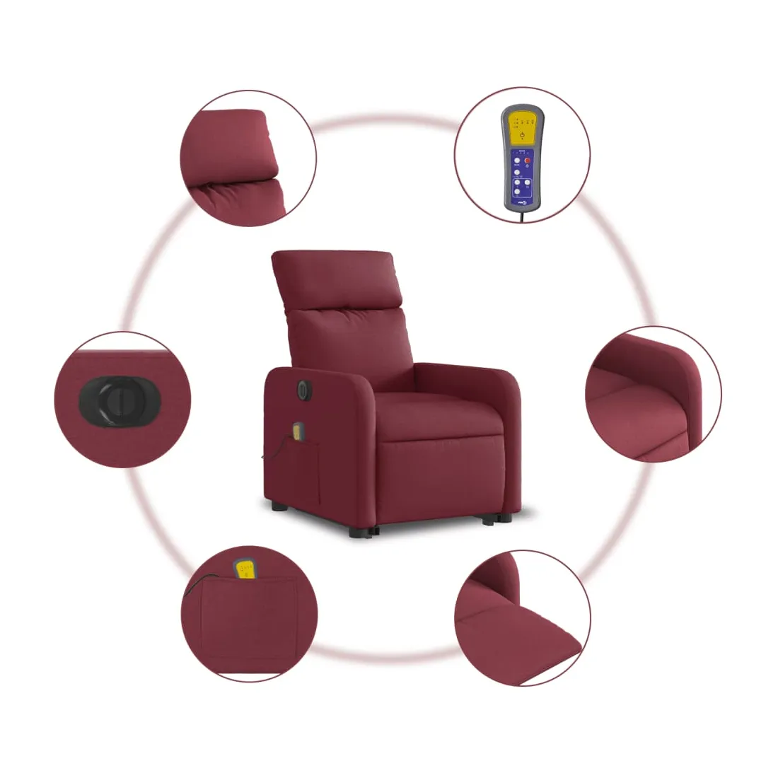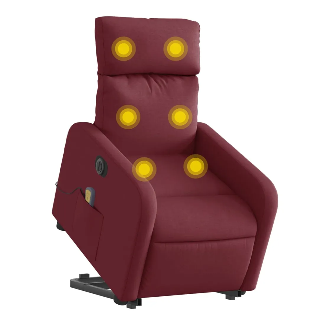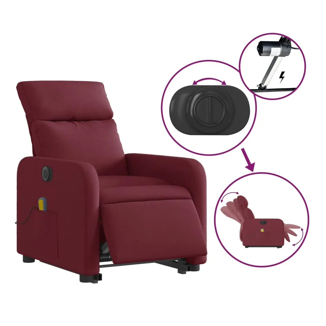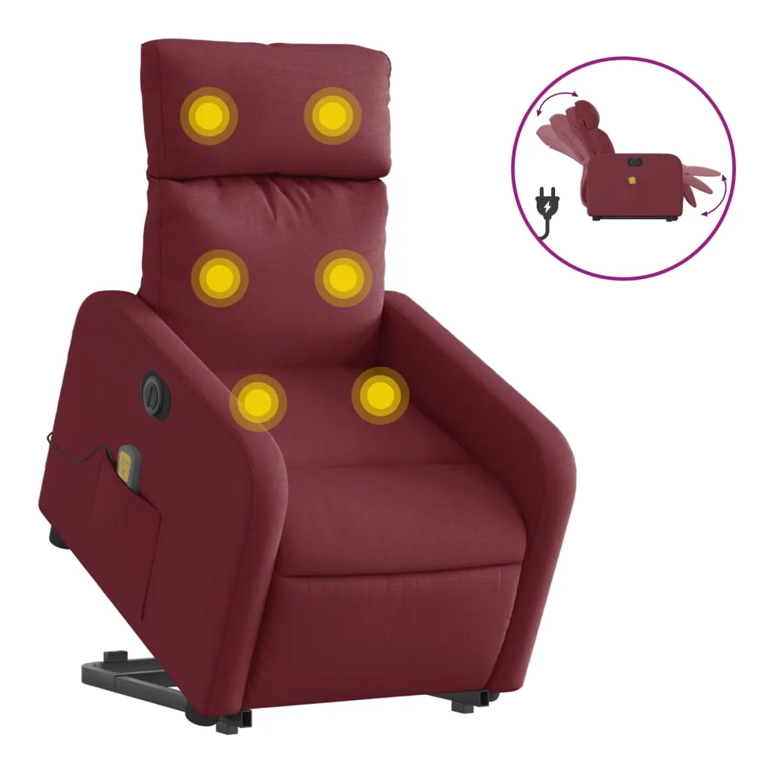Asseyez-vous et détendez-vous dans ce fauteuil inclinable de massage électrique très confortable ! Fonction de levage électrique : ce fauteuil inclinable pour personnes âgées est équipé d'un moteur électrique pour la fonction de levage. Grâce à la fonction qui pousse toute la chaise vers le haut, vous pouvez facilement vous tenir debout sans stresser votre dos et vos genoux en appuyant simplement sur le bouton.Fonction d'inclinaison électrique : ce fauteuil inclinable est également équipé d'un moteur électrique qui permet de régler automatiquement le repose-pied et le dossier dans n'importe quelle position, selon votre confort, en appuyant simplement sur le bouton situé sur le côté du fauteuil. Cette fonction permet une inclinaison maximale de 135 degrés. En outre, le dossier peut revenir automatiquement à sa position d'origine par une simple pression sur le bouton.Fonction de vibration : les 6 points de massage vous permettent de faire l'expérience d'un massage mieux ciblé. De plus, la télécommande incluse vous permet de choisir différents programmes de massage. La fonction de massage est alimentée par le connecteur USB qui nécessite une source d'alimentation USB certifiée de 5 V (non fournie).Expérience d'assise confortable : le siège, le dossier et les larges accoudoirs bien rembourrés recouverts de tissu procurent une sensation confortable et chaleureuse, vous permettant de vous sentir enveloppé lorsque vous êtes assis. Le tissu présente un aspect simple et épuré et est respirant et durable.Poche latérale pratique : ce fauteuil est doté d'une poche latérale pour vous permettre de garder vos objets essentiels à portée de main.Cadre solide et stable : le cadre en bois et en métal offre une structure solide et une grande stabilité. Ce fauteuil inclinable est confortable et durable.
