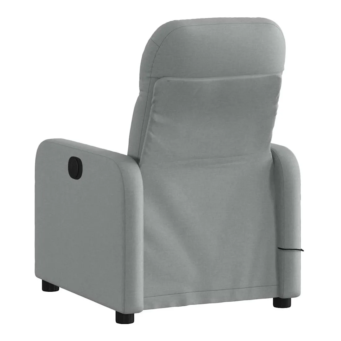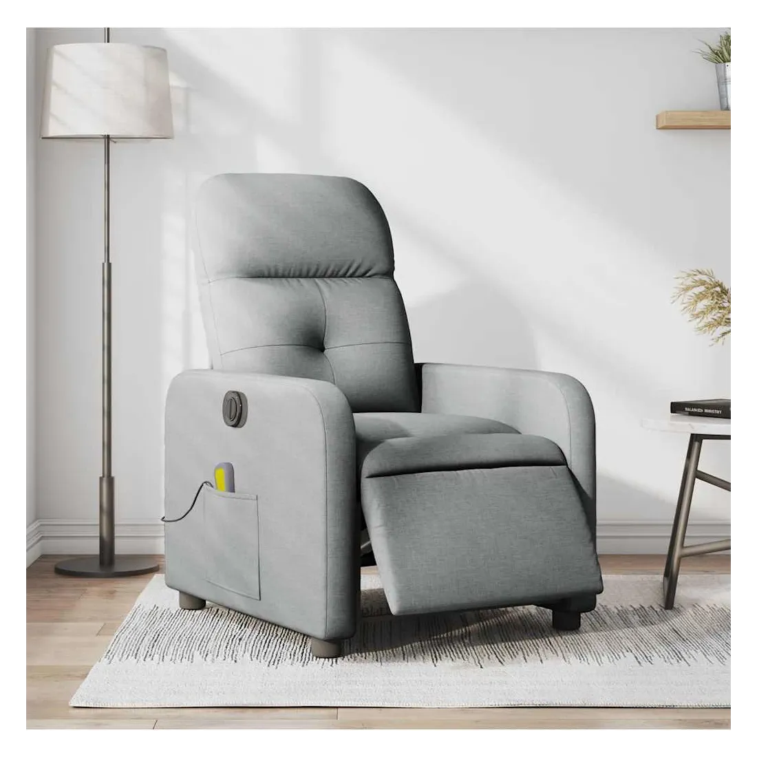 Asseyez-vous et détendez-vous dans ce fauteuil inclinable de massage électrique très confortable ! Fonction d'inclinaison électrique : ce fauteuil inclinable est équipé d'un moteur électrique qui permet de régler automatiquement le repose-pied et le dossier dans n'importe quelle position, selon votre confort, en appuyant simplement sur le bouton situé sur le côté du fauteuil. Cette fonction permet une inclinaison maximale de 135 degrés. En outre, le dossier peut revenir automatiquement à sa position d'origine par une simple pression sur le bouton.Fonction de vibration : les 6 points de massage vous permettent de faire l'expérience d'un massage mieux ciblé. De plus, la télécommande incluse vous permet de choisir différents programmes de massage. La fonction de massage est alimentée par le connecteur USB qui nécessite une source d'alimentation USB certifiée de 5 V (non fournie).Expérience d'assise confortable : le siège, le dossier et les larges accoudoirs bien rembourrés recouverts de tissu procurent une sensation confortable et chaleureuse, vous permettant de vous sentir enveloppé lorsque vous êtes assis. Le tissu présente un aspect simple et épuré et est respirant et durable.Poche latérale pratique : ce fauteuil est doté d'une poche latérale pour ranger votre télécommande ou garder vos objets essentiels à portée de main.Cadre solide et stable : le cadre en bois et en métal offre une structure solide et une grande stabilité. Ce fauteuil inclinable est confortable et durable.