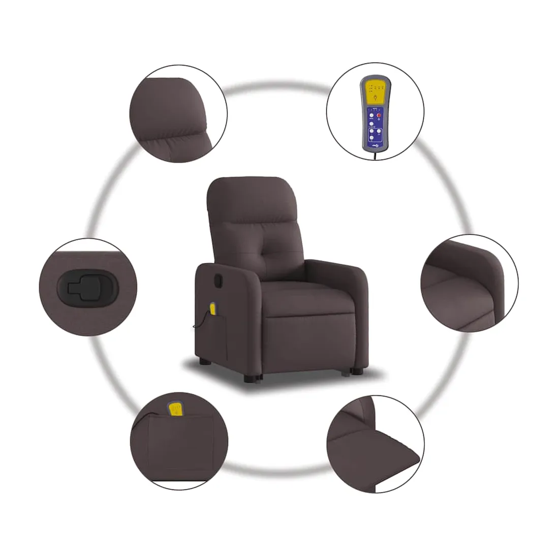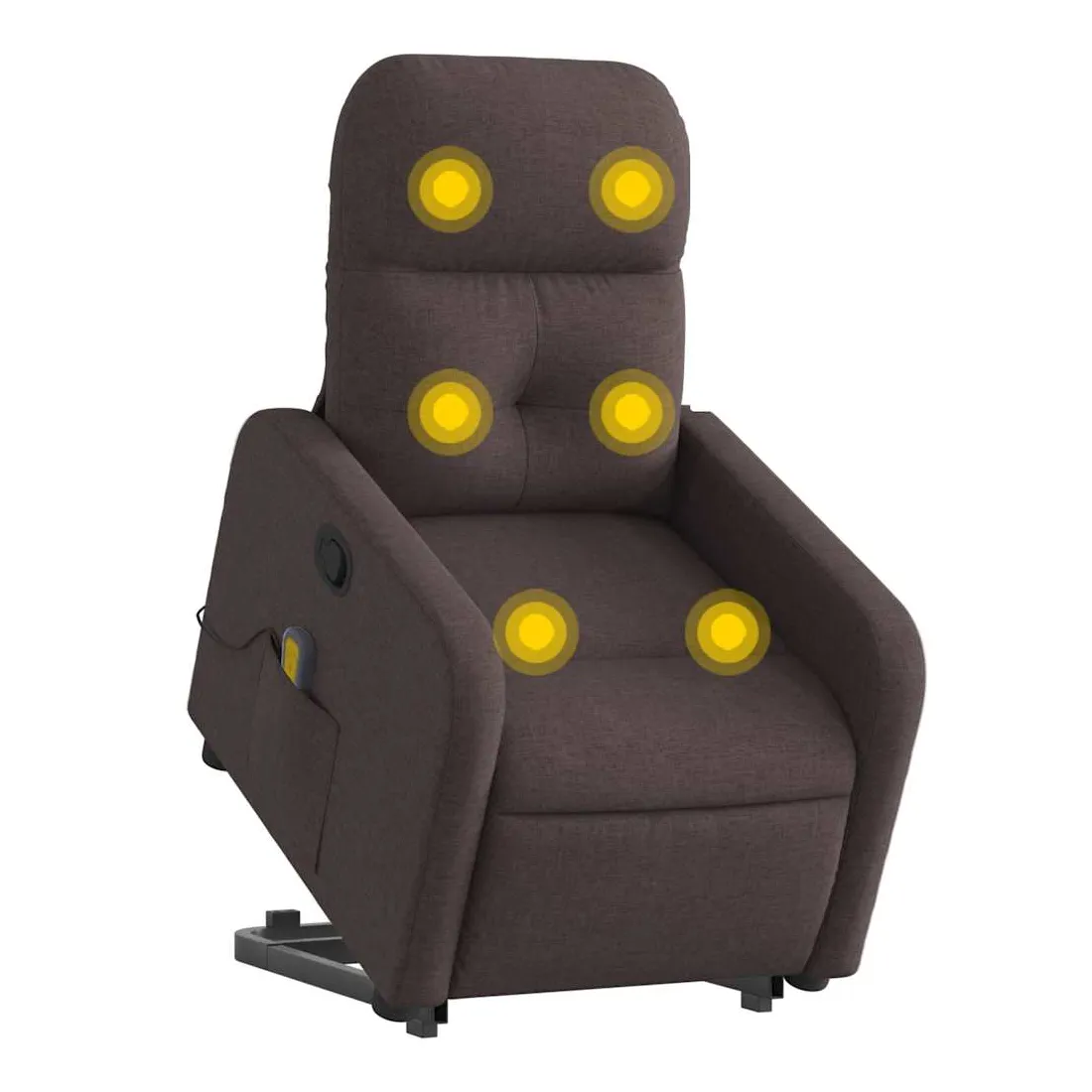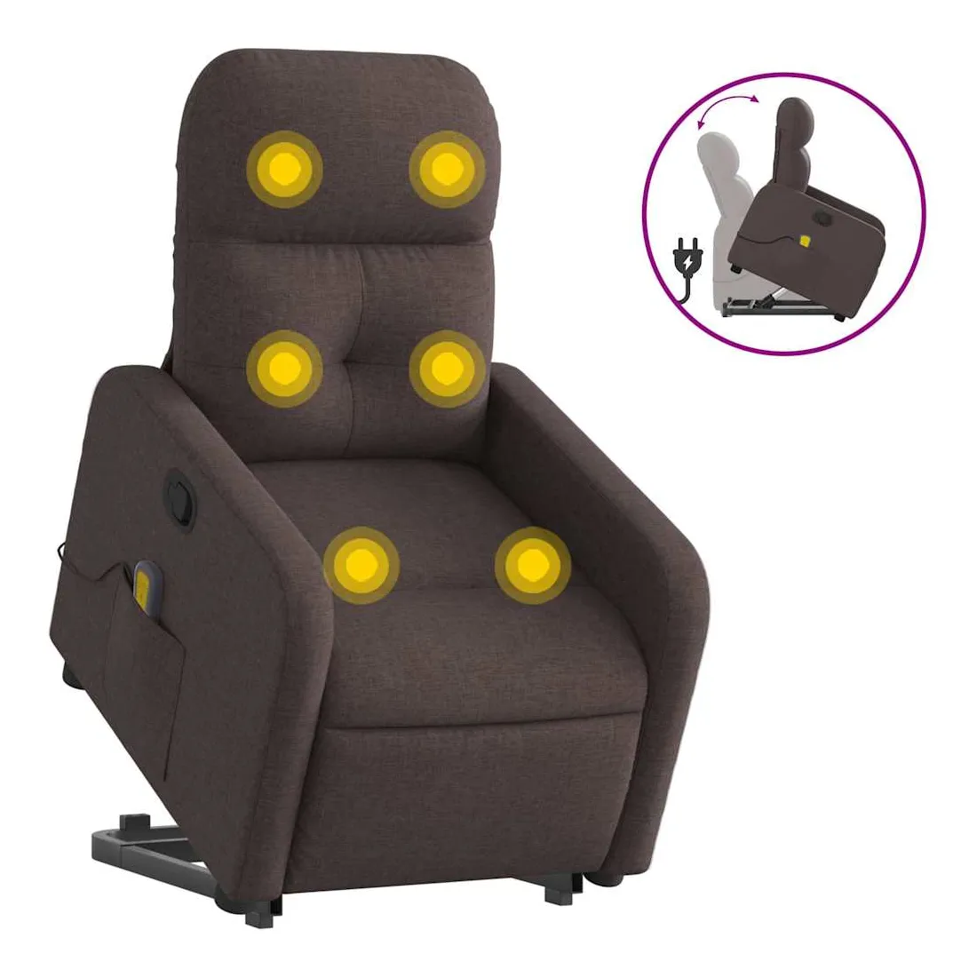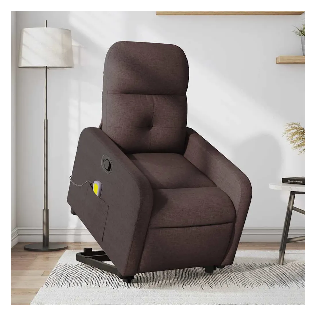 Asseyez-vous et détendez-vous dans ce fauteuil inclinable de massage très confortable ! Fonction de levage électrique : ce fauteuil inclinable pour personnes âgées est équipé d'un moteur électrique pour la fonction de levage. Grâce à la fonction qui pousse toute la chaise vers le haut, vous pouvez facilement vous tenir debout sans stresser votre dos et vos genoux en appuyant simplement sur le bouton.Fonction d'inclinaison manuelle : ce fauteuil inclinable est doté d'une poignée du côté droit. Vous pouvez régler manuellement le repose-pieds et le dossier dans n'importe quelle position selon votre confort en tirant simplement sur la poignée. Cette fonction permet une inclinaison maximale de 135 degrés. De plus, le dossier peut revenir rapidement à sa position d'origine en tirant simplement sur la poignée.Fonction de vibration : les 6 points de massage vous permettent de faire l'expérience d'un massage mieux ciblé. De plus, la télécommande incluse vous permet de choisir différents programmes de massage. La fonction de massage est alimentée par le connecteur USB qui nécessite une source d'alimentation USB certifiée de 5 V (non fournie).Expérience d'assise confortable : le siège, le dossier et les larges accoudoirs bien rembourrés recouverts de tissu procurent une sensation confortable et chaleureuse, vous permettant de vous sentir enveloppé lorsque vous êtes assis. Le tissu présente un aspect simple et épuré et est respirant et durable.Poche latérale pratique : ce fauteuil est doté d'une poche latérale pour ranger votre télécommande ou garder vos objets essentiels à portée de main.Cadre solide et stable : le cadre en bois et en métal offre une structure solide et une grande stabilité. Ce fauteuil inclinable est confortable et durable.