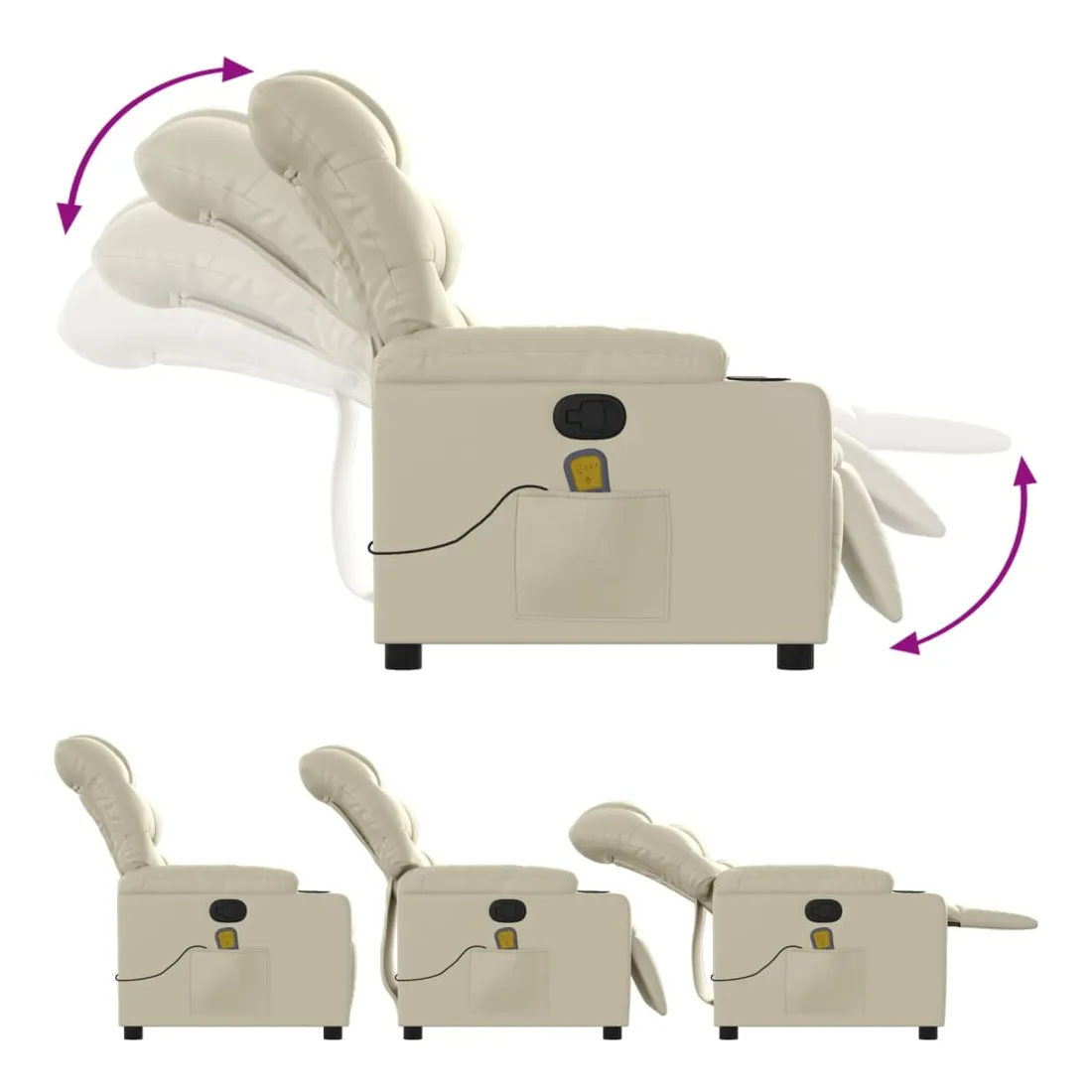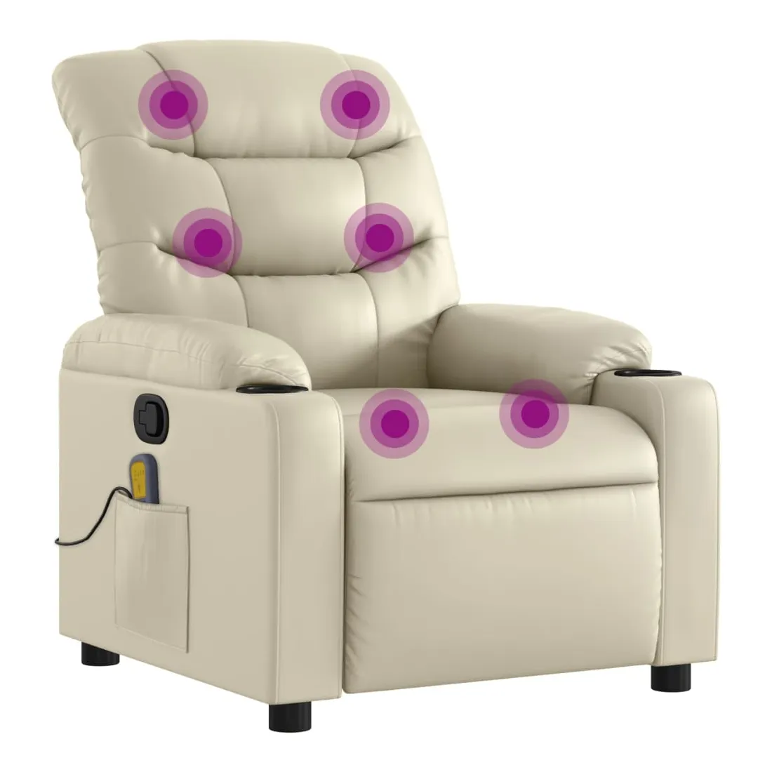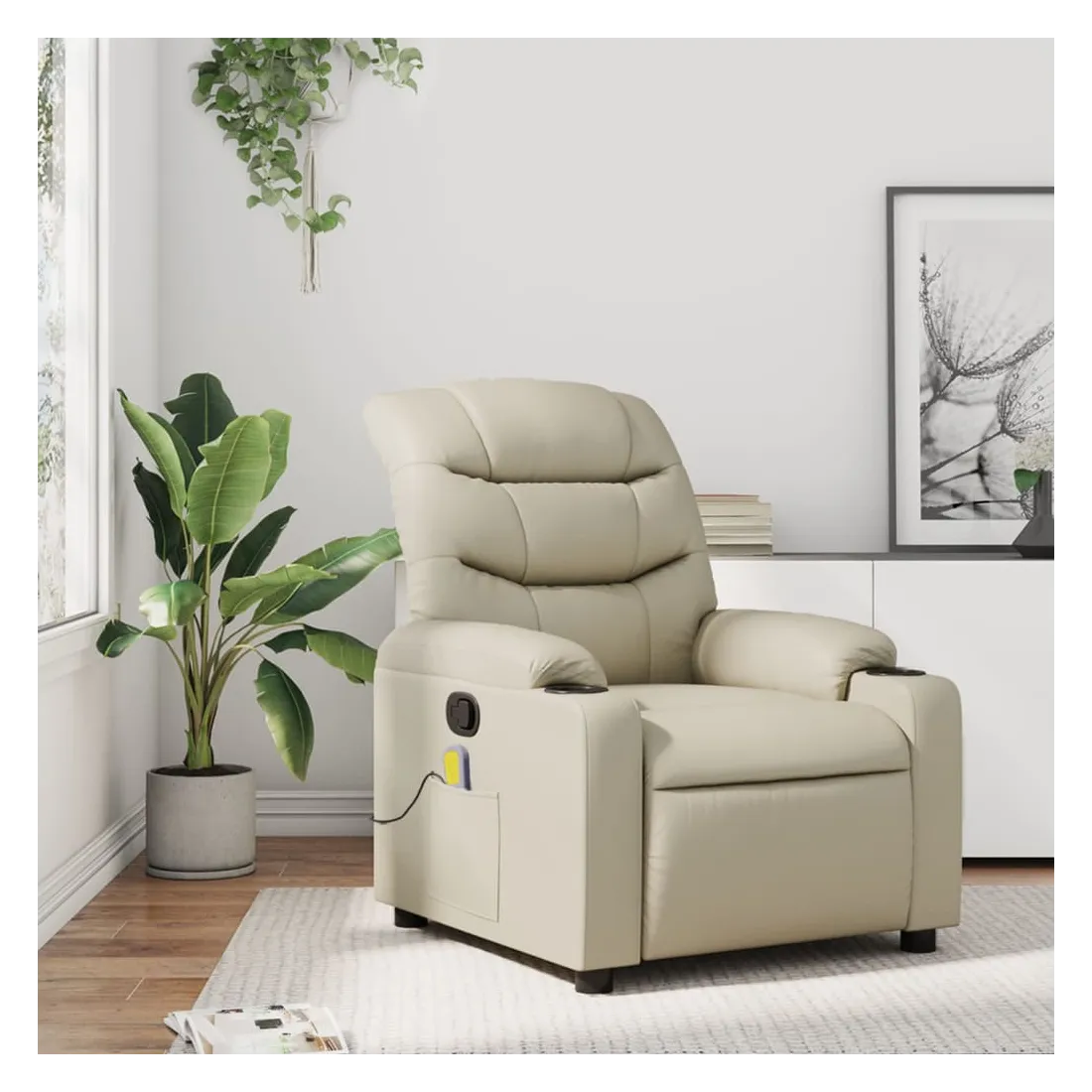 Asseyez-vous et détendez-vous dans ce fauteuil inclinable de massage très confortable ! Fonction d'inclinaison manuelle : ce fauteuil inclinable est doté d'une poignée du côté droit. Vous pouvez régler manuellement le repose-pieds et le dossier dans n'importe quelle position selon votre confort en tirant simplement sur la poignée. Cette fonction permet une inclinaison maximale de 135 degrés. De plus, le dossier peut revenir rapidement à sa position d'origine en tirant simplement sur la poignée.Fonction de vibration : les 6 points de massage vous permettent de faire l'expérience d'un massage mieux ciblé. De plus, la télécommande incluse vous permet de choisir différents programmes de massage. La fonction de massage est alimentée par le connecteur USB, mais la source d'alimentation USB 5V certifiée n'est pas incluse.Expérience de siège confortable : le siège, le dossier et les larges accoudoirs rembourrés épais recouverts de similicuir procurent une sensation confortable, vous faisant vous sentir enlacé lorsque vous êtes assis. Le similicuir est un matériau très résistant. Il est résistant aux taches, ce qui le rend facile à nettoyer avec un chiffon humide. La surface lisse donne également un aspect luxueux et la beauté du cuir véritable.Porte-gobelets et poche latérale pratiques : ce fauteuil dispose de deux porte-gobelets pratiques pour vos boissons et d'une poche latérale pour votre télécommande ou pour garder vos objets essentiels à portée de main.Cadre solide et stable : le cadre en bois et en métal offre une structure solide et une grande stabilité. Ce fauteuil inclinable est confortable et durable.