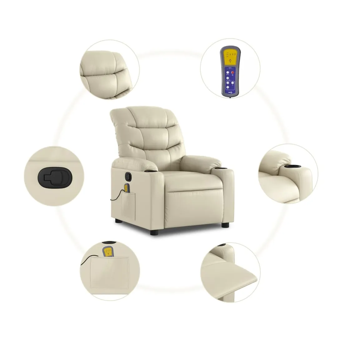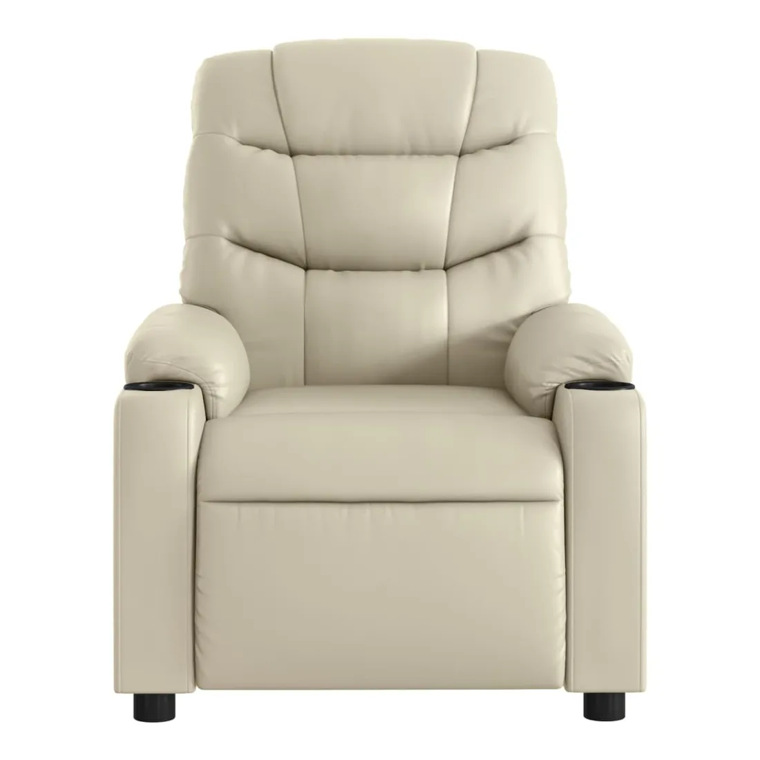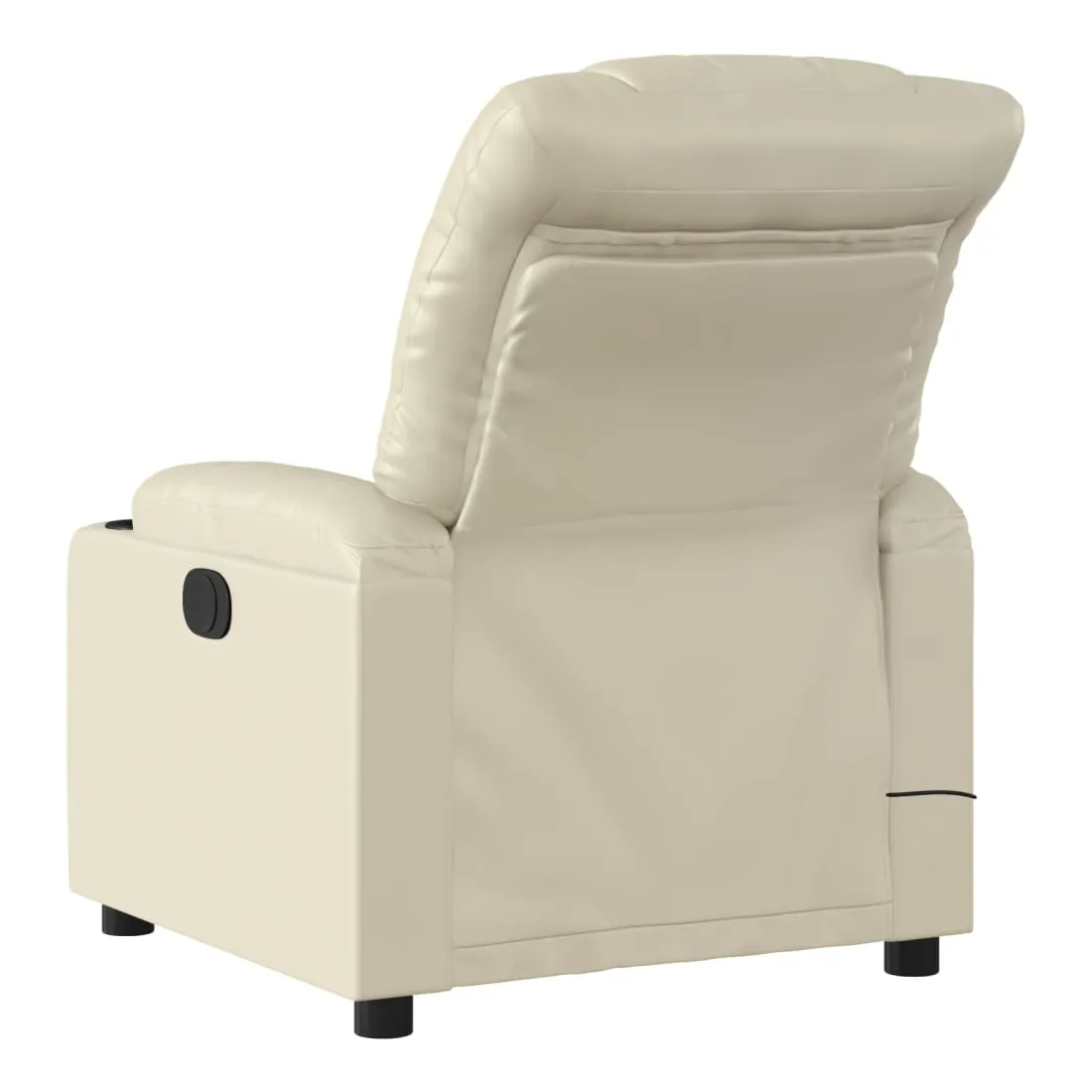 Asseyez-vous et détendez-vous dans ce fauteuil inclinable de massage très confortable ! Fonction d'inclinaison manuelle : ce fauteuil inclinable est doté d'une poignée du côté droit. Vous pouvez régler manuellement le repose-pieds et le dossier dans n'importe quelle position selon votre confort en tirant simplement sur la poignée. Cette fonction permet une inclinaison maximale de 135 degrés. De plus, le dossier peut revenir rapidement à sa position d'origine en tirant simplement sur la poignée.Fonction de vibration : les 6 points de massage vous permettent de faire l'expérience d'un massage mieux ciblé. De plus, la télécommande incluse vous permet de choisir différents programmes de massage. La fonction de massage est alimentée par le connecteur USB, mais la source d'alimentation USB 5V certifiée n'est pas incluse.Expérience de siège confortable : le siège, le dossier et les larges accoudoirs rembourrés épais recouverts de similicuir procurent une sensation confortable, vous faisant vous sentir enlacé lorsque vous êtes assis. Le similicuir est un matériau très résistant. Il est résistant aux taches, ce qui le rend facile à nettoyer avec un chiffon humide. La surface lisse donne également un aspect luxueux et la beauté du cuir véritable.Porte-gobelets et poche latérale pratiques : ce fauteuil dispose de deux porte-gobelets pratiques pour vos boissons et d'une poche latérale pour votre télécommande ou pour garder vos objets essentiels à portée de main.Cadre solide et stable : le cadre en bois et en métal offre une structure solide et une grande stabilité. Ce fauteuil inclinable est confortable et durable.