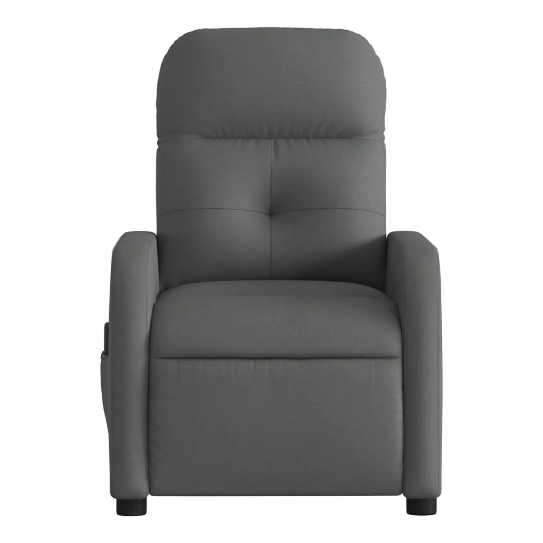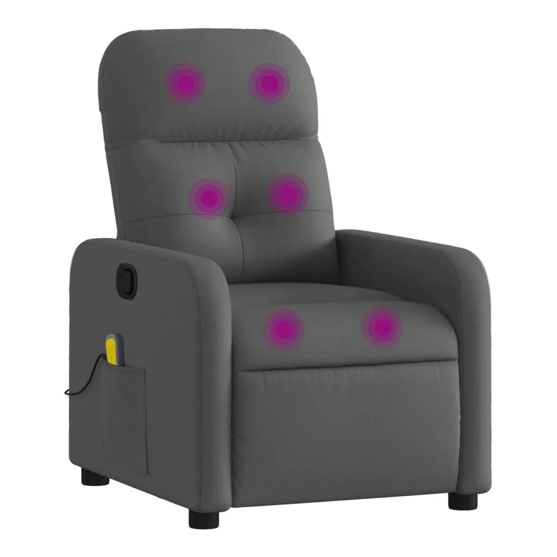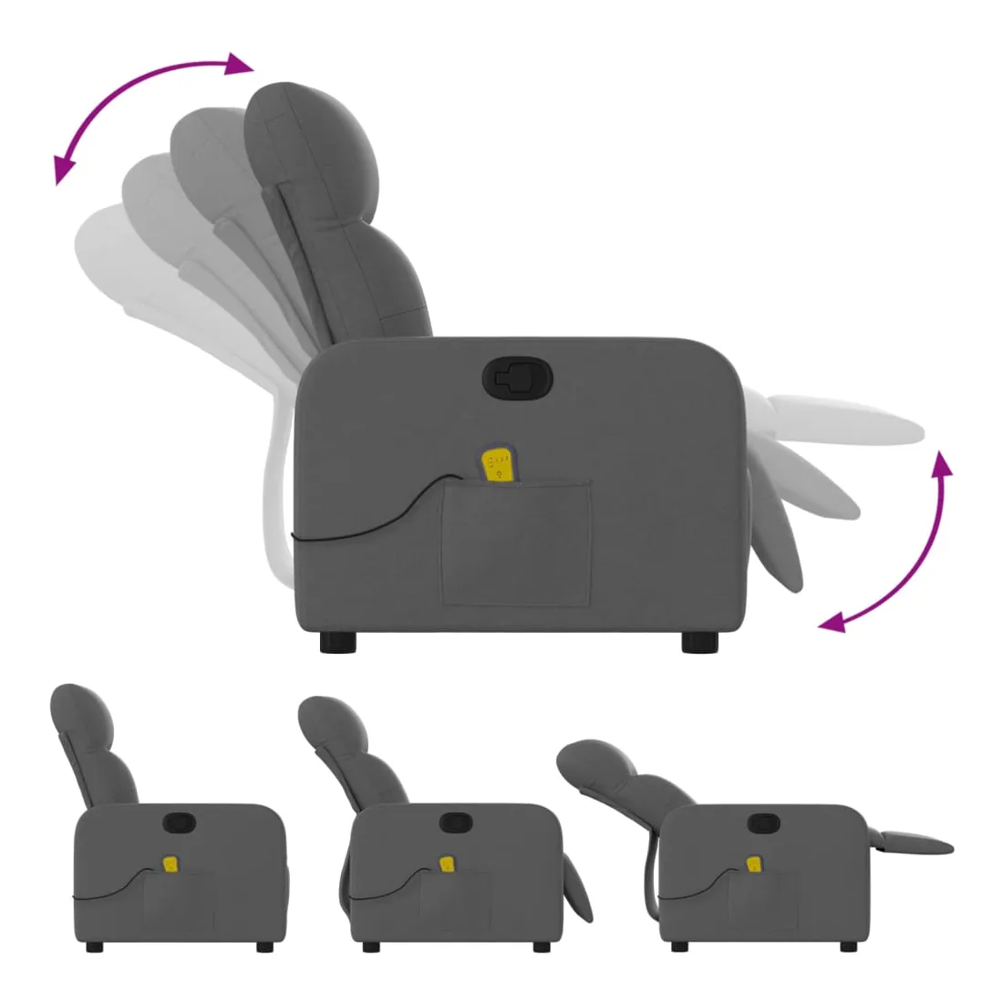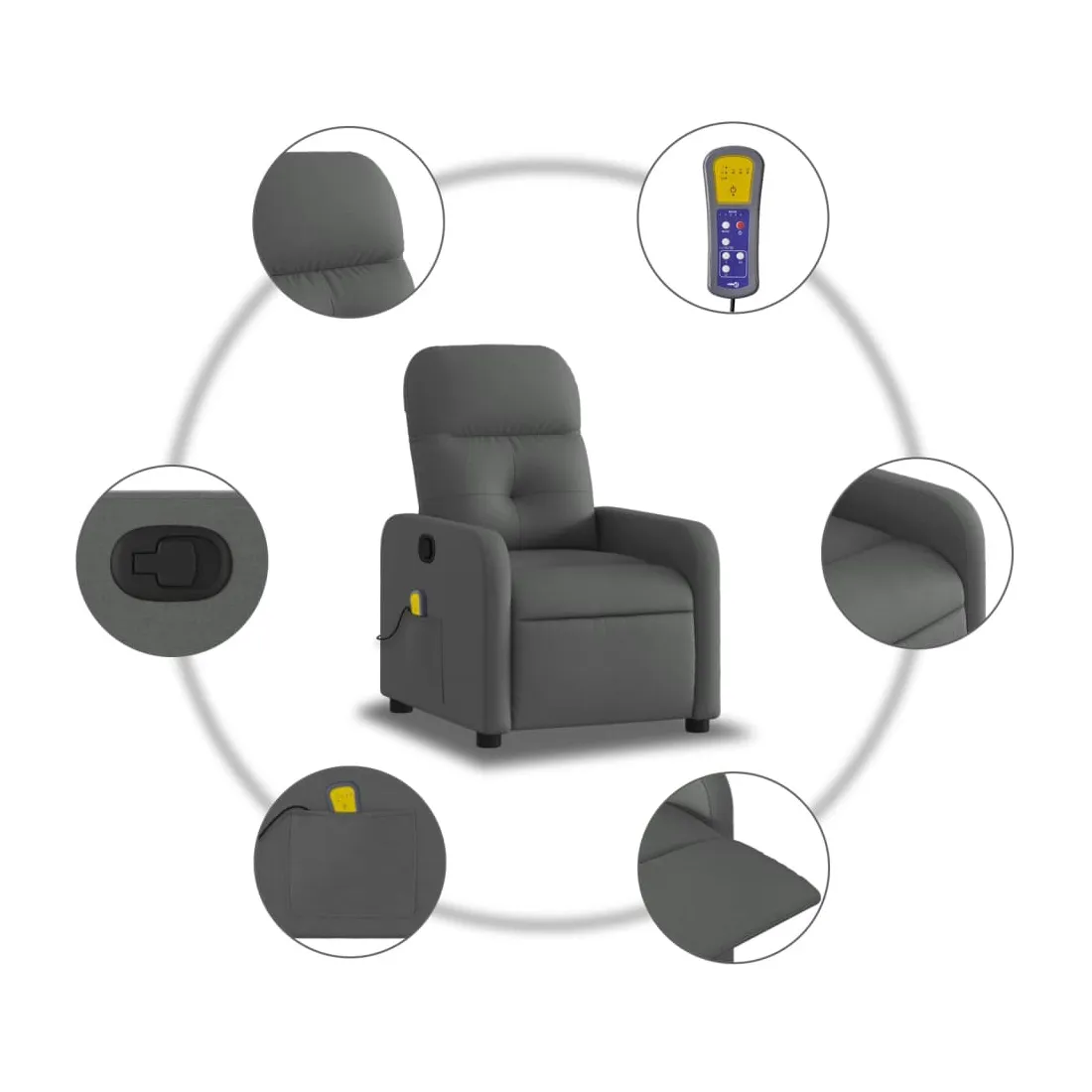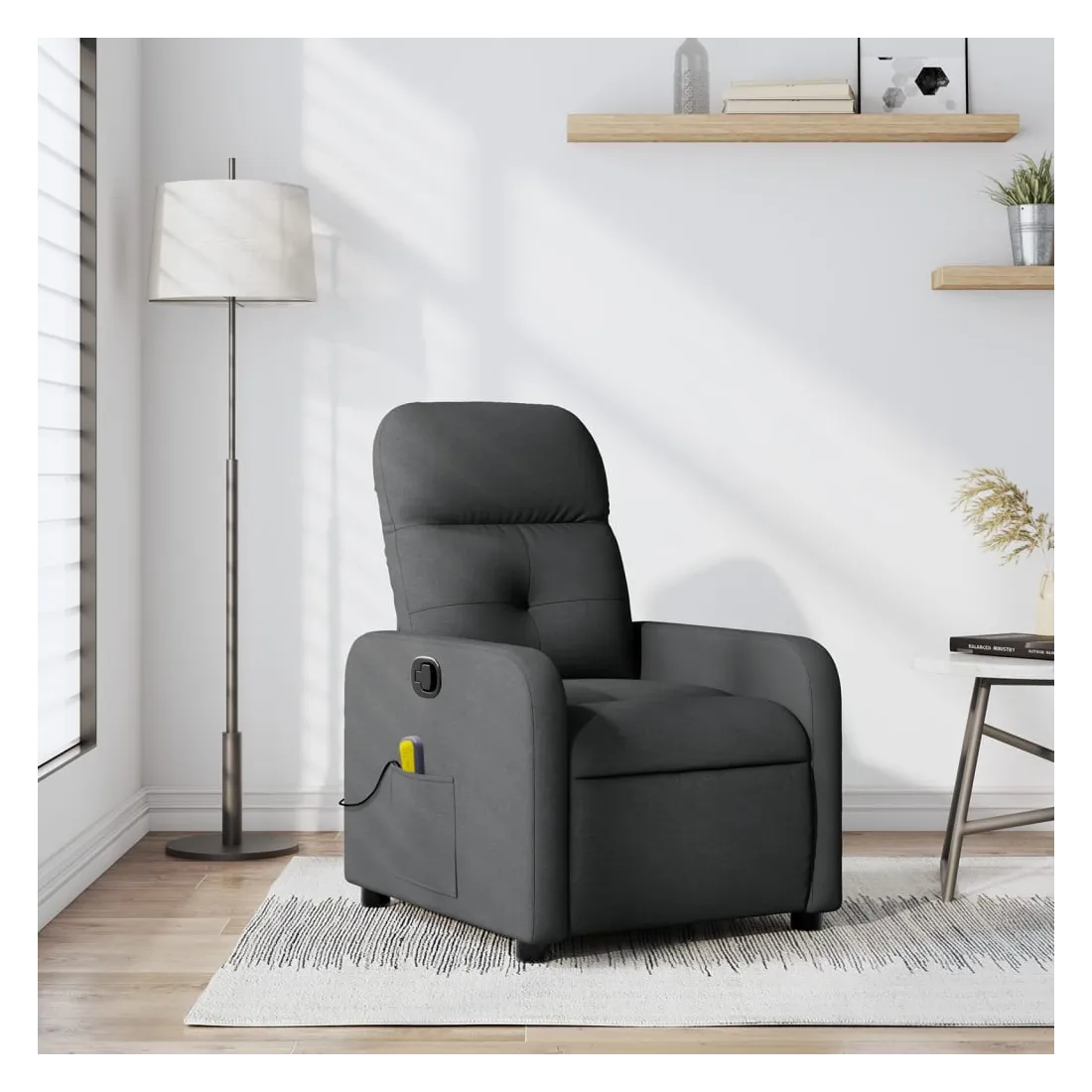 Asseyez-vous et détendez-vous dans ce fauteuil inclinable de massage très confortable ! Fonction d'inclinaison manuelle : ce fauteuil inclinable est doté d'une poignée du côté droit. Vous pouvez régler manuellement le repose-pieds et le dossier dans n'importe quelle position selon votre confort en tirant simplement sur la poignée. Cette fonction permet une inclinaison maximale de 135 degrés. De plus, le dossier peut revenir rapidement à sa position d'origine en tirant simplement sur la poignée.Fonction de vibration : les 6 points de massage vous permettent de faire l'expérience d'un massage mieux ciblé. De plus, la télécommande incluse vous permet de choisir différents programmes de massage. La fonction de massage est alimentée par le connecteur USB, mais la source d'alimentation USB 5V certifiée n'est pas incluse.Expérience d'assise confortable : le siège, le dossier et les larges accoudoirs bien rembourrés recouverts de tissu procurent une sensation confortable et chaleureuse, vous permettant de vous sentir enveloppé lorsque vous êtes assis. Le tissu présente un aspect simple et épuré et est respirant et durable.Poche latérale pratique : ce fauteuil est doté d'une poche latérale pour ranger votre télécommande ou garder vos objets essentiels à portée de main.Cadre solide et stable : le cadre en bois et en métal offre une structure solide et une grande stabilité. Ce fauteuil inclinable est confortable et durable.
