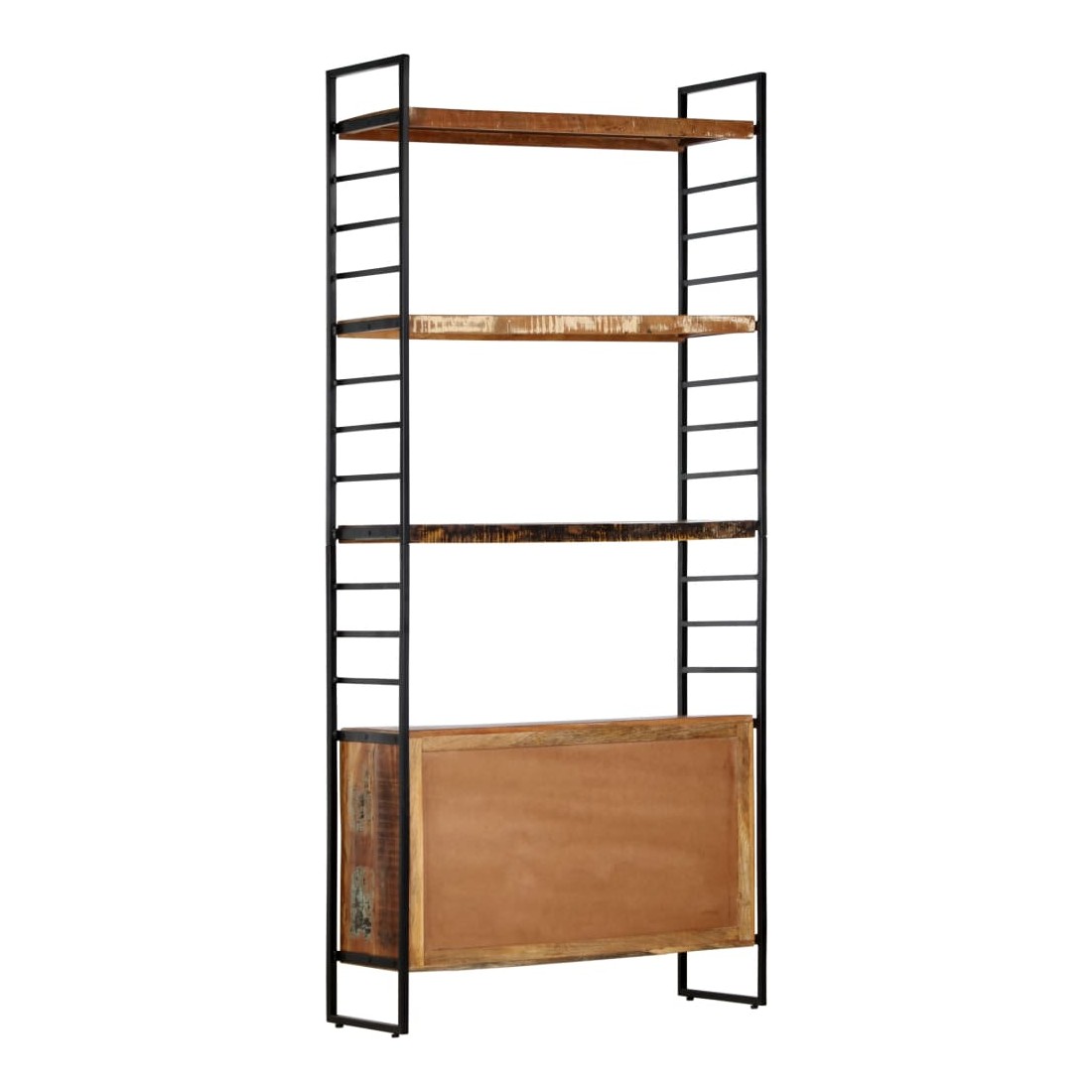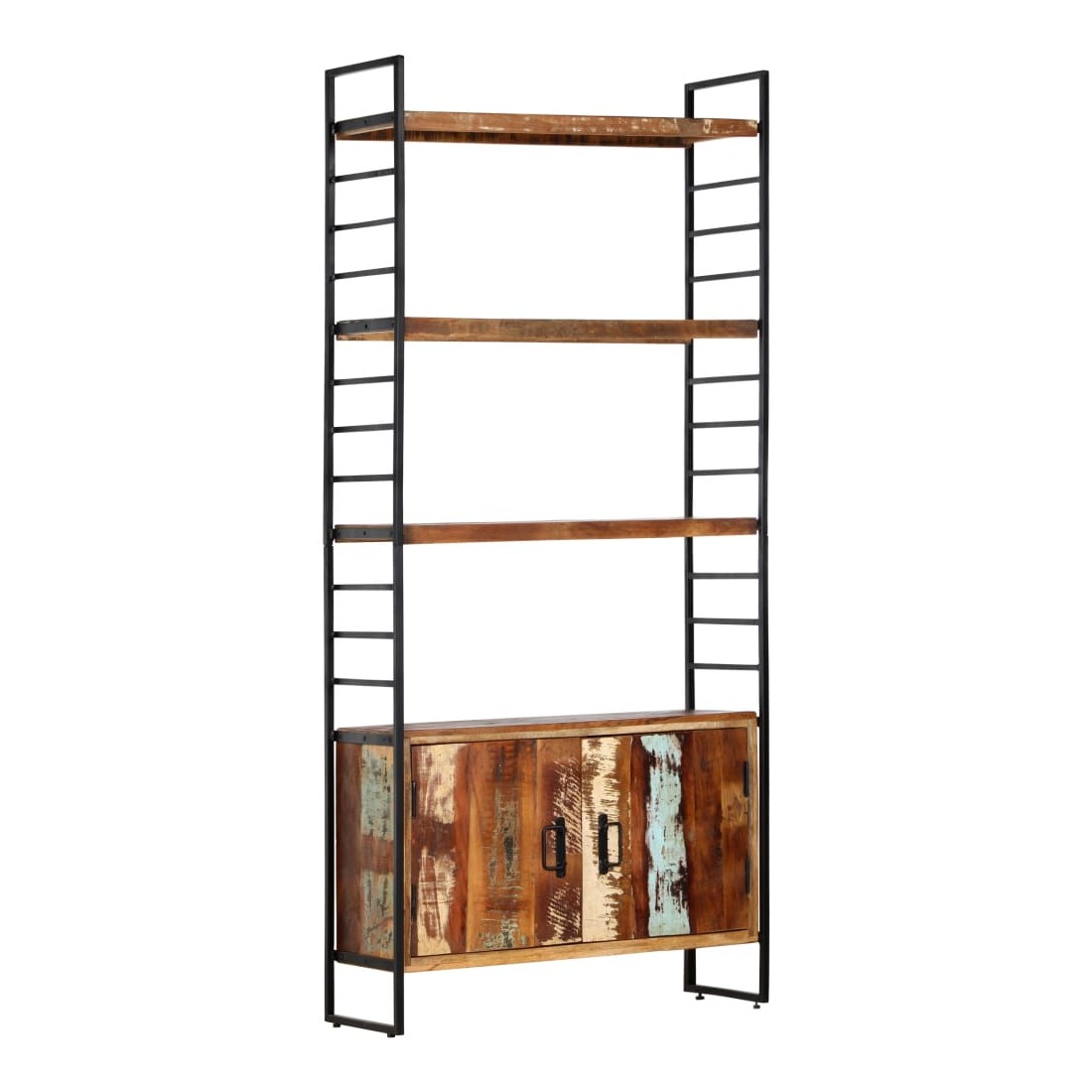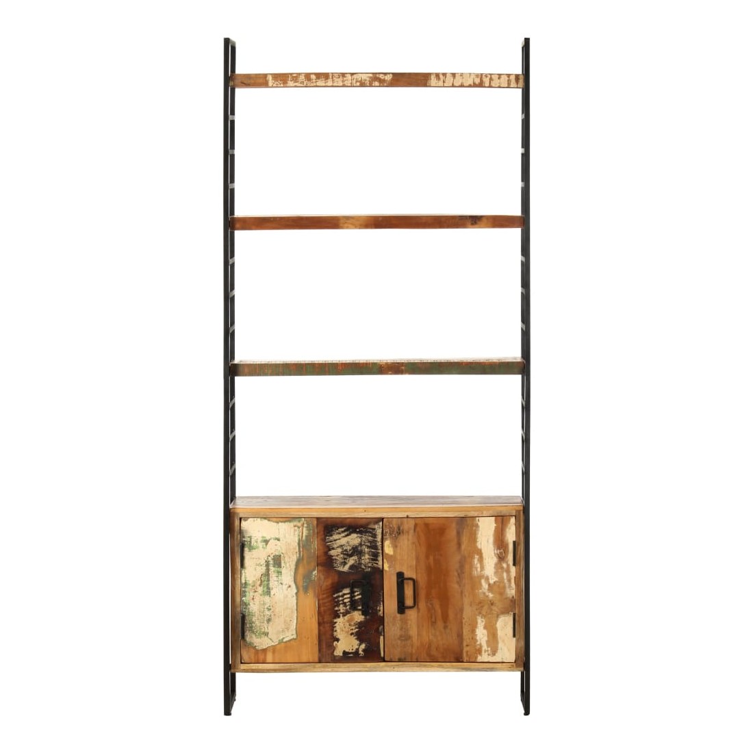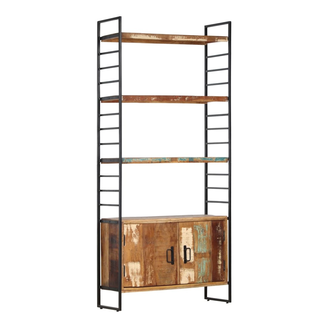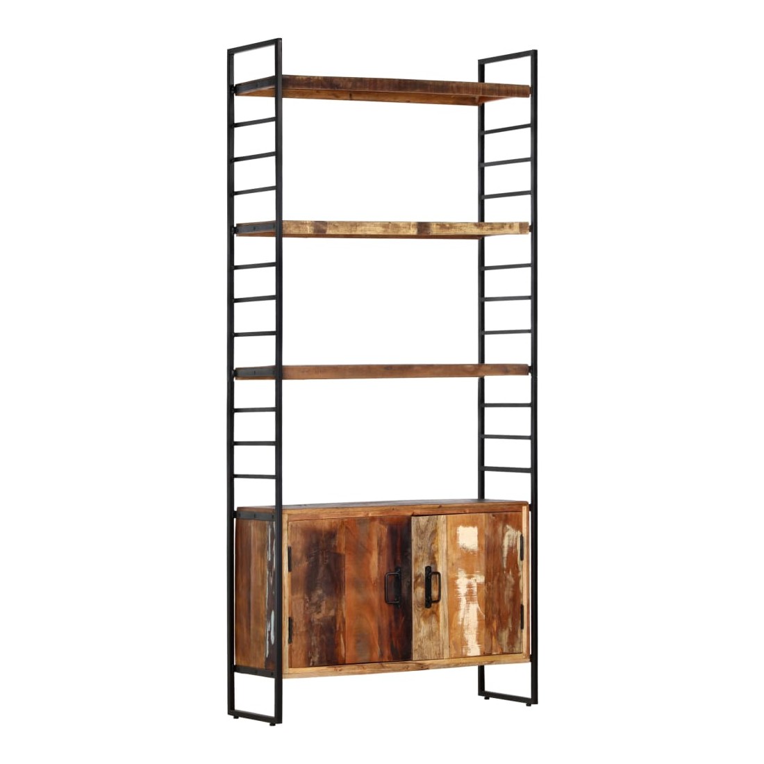 Ajoutez une touche de style industriel à votre maison ou bureau avec notre bibliothèque à 4 niveaux en bois. Cette bibliothèque avec 3 étagères et 2 portes offre une solution idéale pour stocker et afficher votre collection de livres, magazines, documents ou objets décoratifs tels que des cadres photo et des objets de collection. La bibliothèque est dotée d'un cadre solide en fer enduit de poudre qui lui donne un aspect industriel. Les étagères rétro sont en bois solide de récupération provenant des solives, des planchers et des poutres de soutènement de vieux bâtiments démolis et peuvent être composées de différents types de bois comme le pin, le teck, le hêtre, le chêne, le cèdre, le bois de manguier, l'acacia, etc. Cela signifie que le bois de récupération conserve les caractéristiques de ces différents types de bois. Le bois de récupération est déjà vieilli, érodé et séché, donc il ne rétrécit et ne se plie pas. Chaque étape du processus est réalisée avec le plus grand soin, que ce soit le polissage, la peinture ou le laquage. L'artisanat et les grains de bois accrocheurs rendent chaque meuble distinctif et légèrement différent l'un de l'autre.
