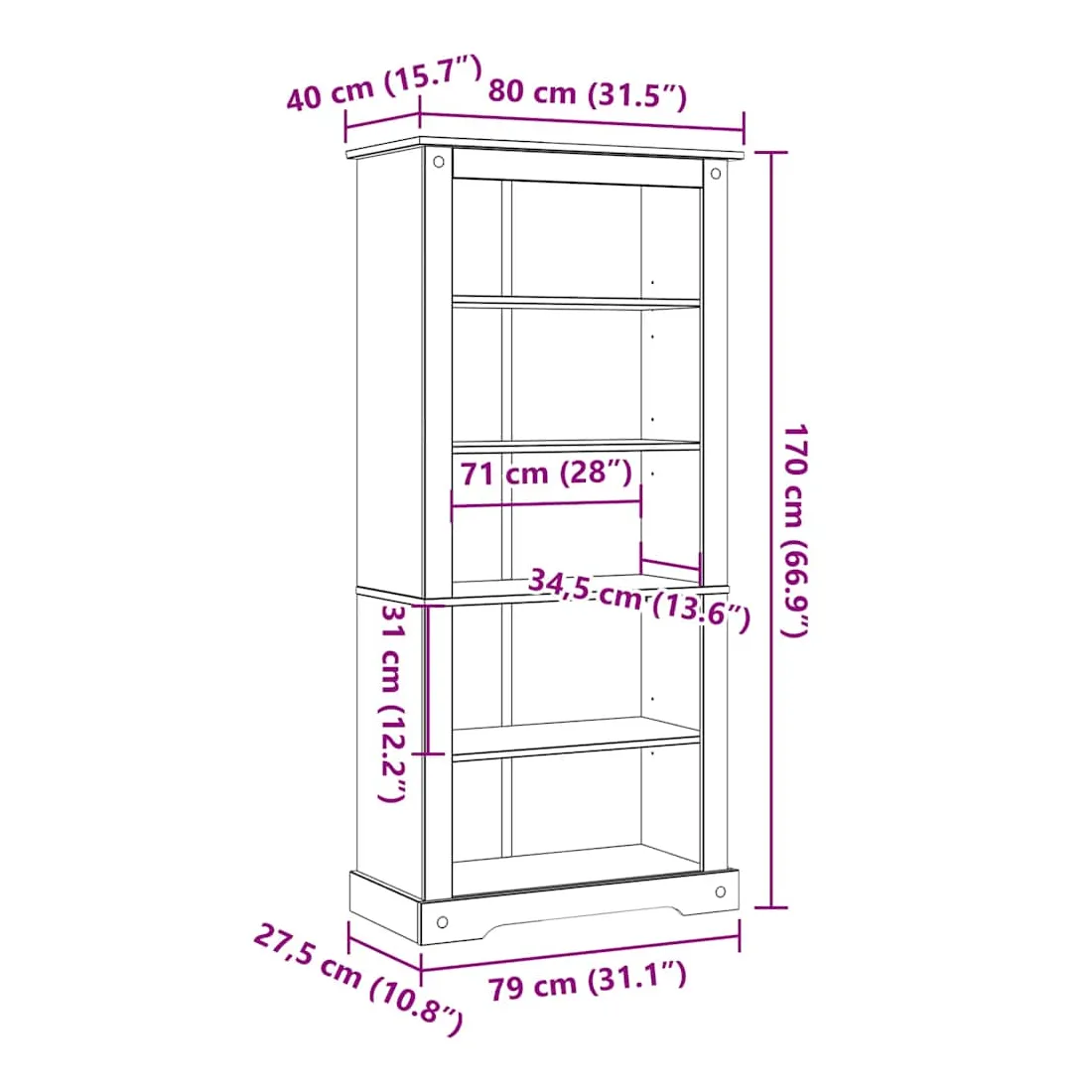 Cette bibliothèque en bois de haute qualité dégage un charme mexicain rustique qui en fera un supplément intemporel à votre bureau ou à votre salon. Cette élégante bibliothèque est fabriquée à partir de bois de pin de haute qualité, ce qui la rend résistante à l'usure. La bibliothèque en bois robuste nécessite un entretien minimal, et les beaux grains de bois lui confèrent un charme rustique. La bibliothèque a 5 étagères, offrant amplement d'espace pour ranger votre collection de livres, magazines et documents dans l'ordre. Avec un design simple mais intemporel, la bibliothèque peut également être utilisée pour afficher des bibelots, des albums photo, etc. L'assemblage est facile.