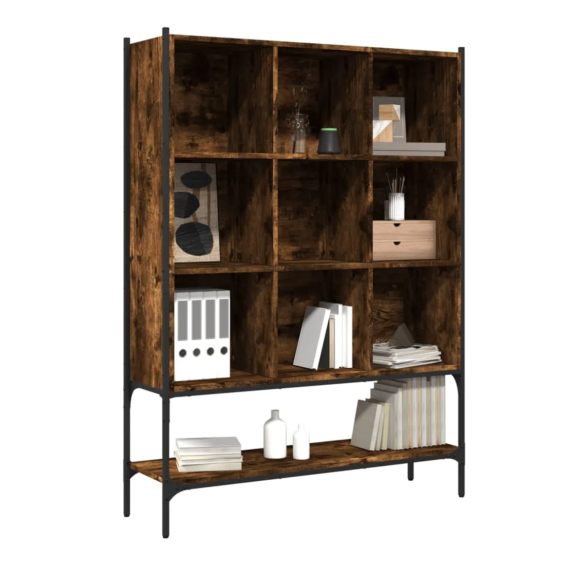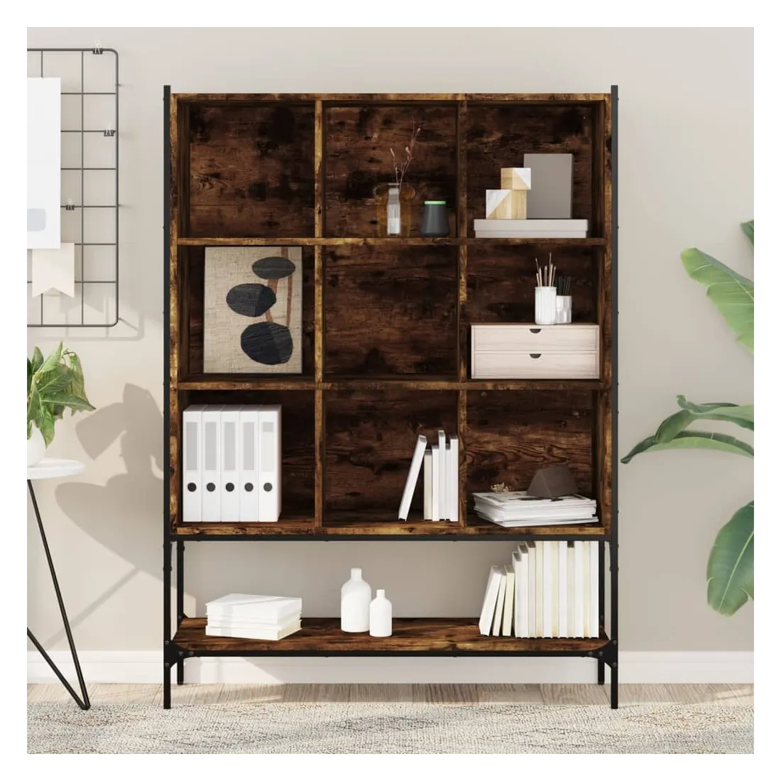 Cette bibliothèque est une aide précieuse pour l'organisation du désordre et un supplément intemporel à votre décoration intérieure. Construction robuste : l'acier et le bois d'ingénierie garantissent une construction robuste et offrent un support solide à vos articles.Design peu encombrant : la bibliothèque utilise de manière optimale l'espace vertical et occupe peu d'espace au sol, ce qui convient particulièrement aux petites pièces.Grand espace de rangement : la bibliothèque est conçue avec 9 compartiments ouverts et 1 étagère inférieure, offrant un grand espace de rangement pour stocker et exposer vos livres, magazines, objets de décoration, cadres photo, souvenirs de vacances et trophées tout en améliorant votre espace de vie.Nombreuses applications : l'armoire de rangement peut également être utilisée comme séparateur de pièce, s'adaptant facilement à tous les styles de pièces. Vous pouvez le placer dans le salon pour exposer la décoration, dans le bureau pour ranger les livres et les documents, dans la chambre à coucher pour ranger les objets de la vie quotidienne et dans la cave pour ranger les objets de toutes sortes. Attention :Pour éviter qu'il ne bascule, ce produit doit être utilisé avec le dispositif de fixation murale fourni.