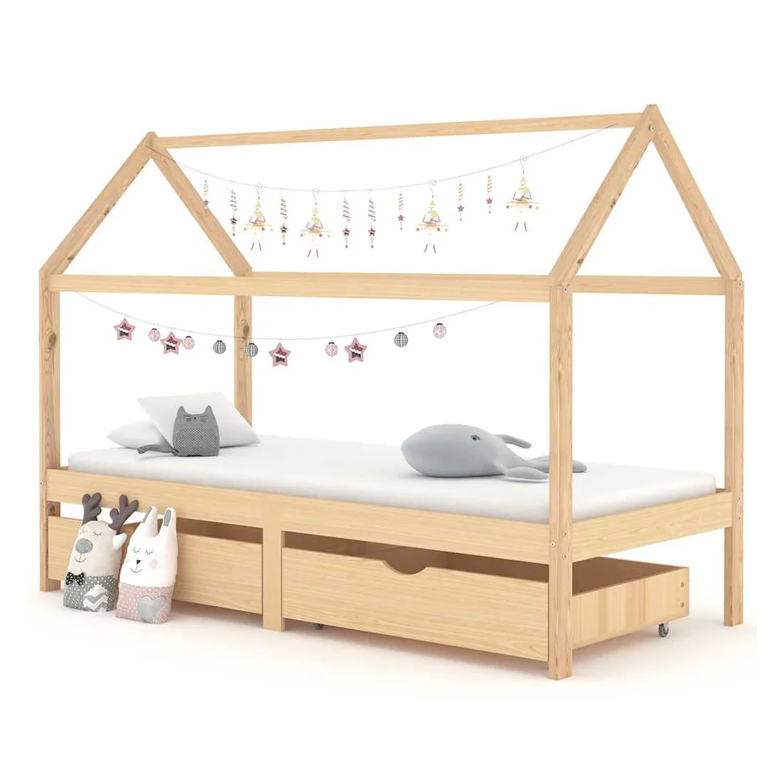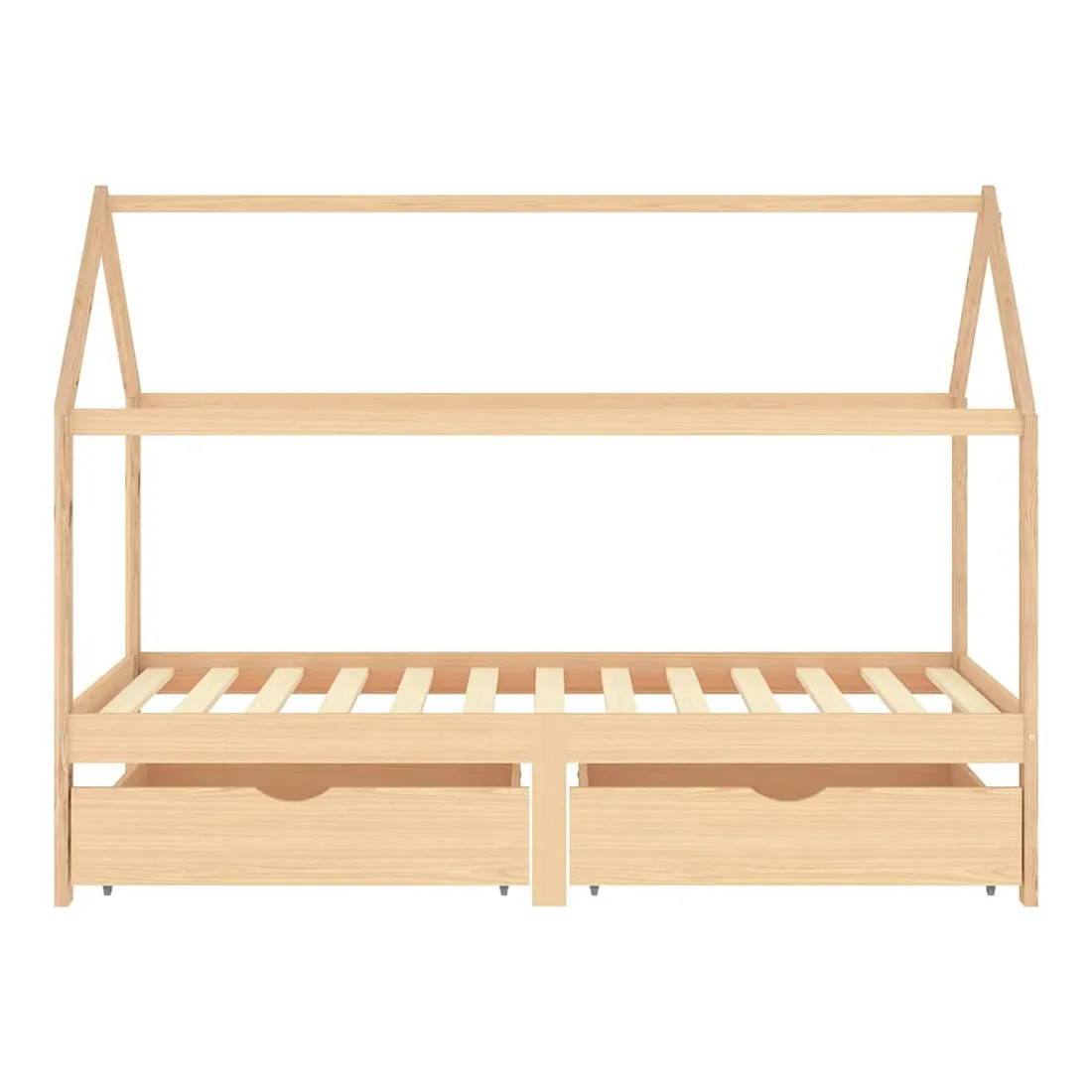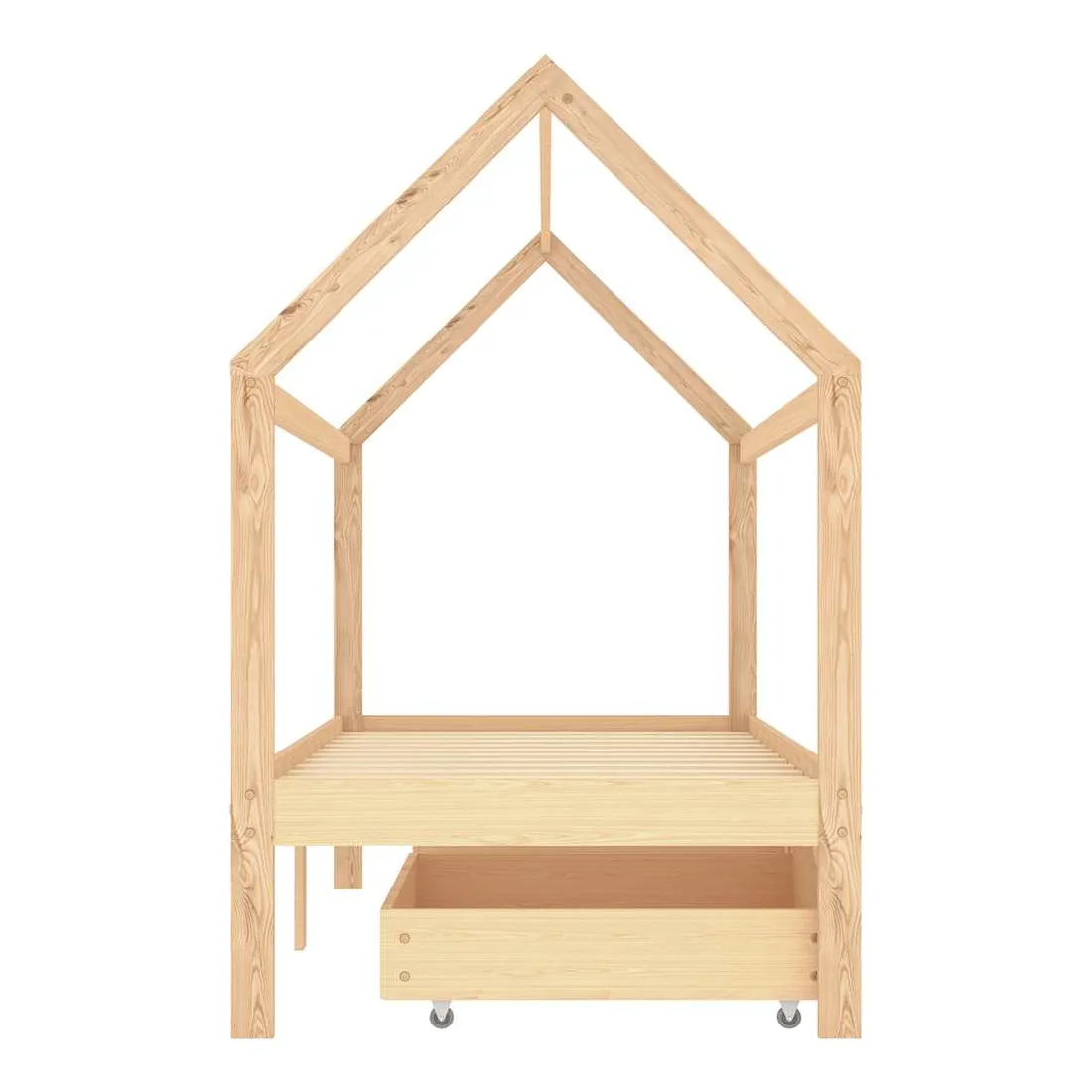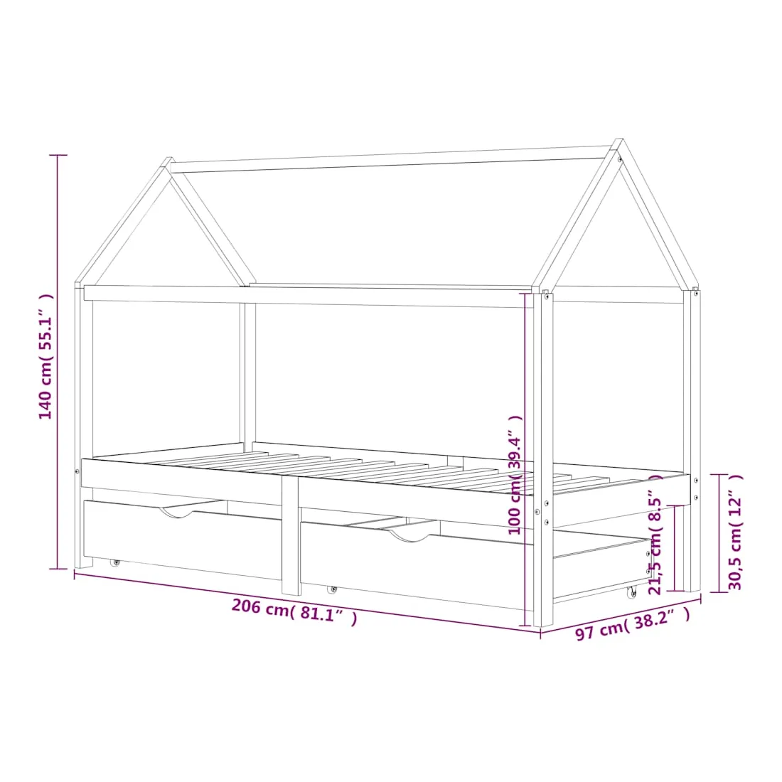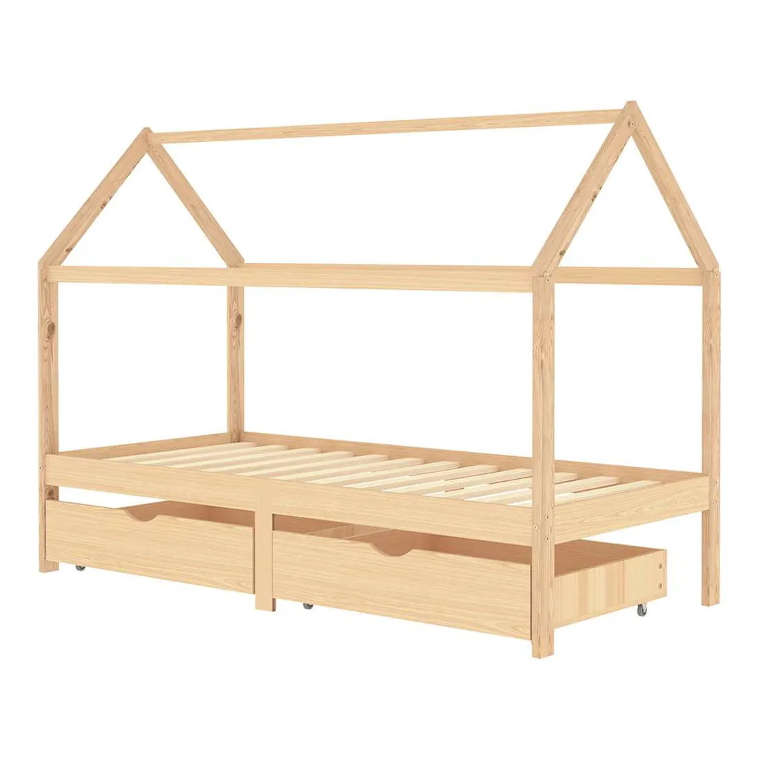 Ce cadre de lit d'enfant en bois avec tiroirs est un complément pratique et décoratif à la décoration de toute chambre à coucher. Le lit est intelligemment conçu avec un cadre de style cabane dans les arbres où vous pouvez accrocher des rideaux de lit pour créer de l'intimité pour votre enfant. Il peut également être utilisé comme un livre de lecture ou une maison de jeu pour votre enfant. Fabriqué en bois de pin massif, ce cadre de lit est extrêmement robuste et durable. Les lattes fortes offrent le soutien nécessaire et sont très confortables. Les tiroirs de lit inclus offrent un grand espace de rangement pour ranger des vêtements pliés, des jouets, etc., gardant votre pièce propre et bien rangée. Les roues à glissement facile peuvent fonctionner aussi bien sur de la moquette que sur des sols en bois. Ce cadre de lit convient à un matelas de 90 x 200 cm. Veuillez noter que la livraison inclut un cadre de lit seulement ; un matelas et les rideaux ne sont pas inclus. Le lit est facile à assembler. Vous pouvez chercher le matelas correspondant dans notre boutique.
