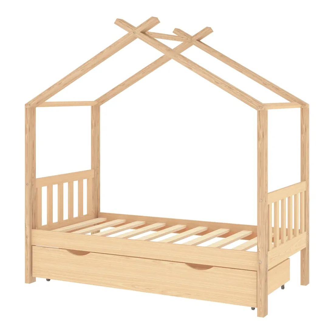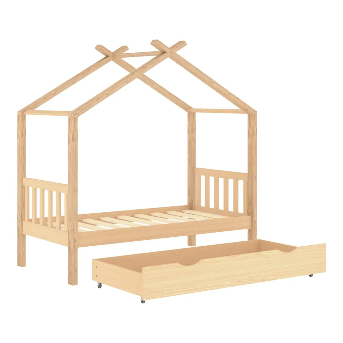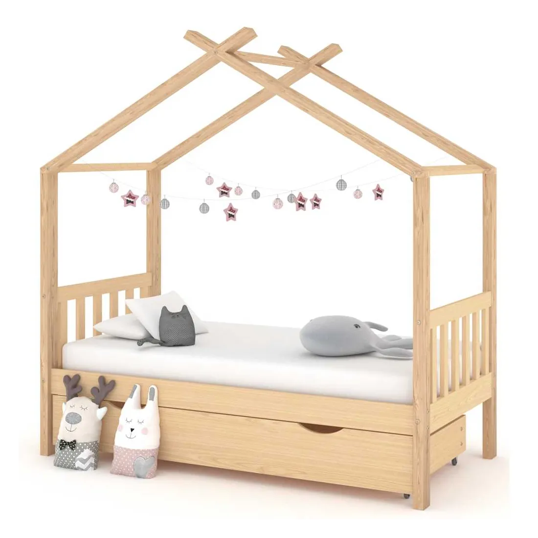 Ce cadre de lit enfant en bois avec tiroir est un supplément pratique et décoratif à la décoration de toute chambre à coucher. Le lit est intelligemment conçu avec un cadre de style maison d'arbre où vous pouvez accrocher des rideaux de lit pour créer de l'intimité pour votre enfant. Il peut aussi servir de soutien pour lire un livre ou de maisonnette pour votre enfant. Fabriqué en bois de pin massif, ce cadre de lit est extrêmement robuste et durable. Les lattes solides offrent le soutien nécessaire et sont très confortables. Le tiroir de lit inclus avec 2 poignées offre un grand espace de rangement pour ranger les vêtements pliés, les jouets, etc. et garder votre pièce propre et bien rangée. Les roues à glissement facile peuvent rouler sur la moquette et le parquet. Ce cadre de lit convient à un matelas mesurant 80 x 160 cm. Veuillez noter que la livraison comprend uniquement un cadre de lit, le matelas et les rideaux ne sont pas inclus. Le lit est facile à assembler. Vous pouvez consulter notre boutique pour les matelas assortis.