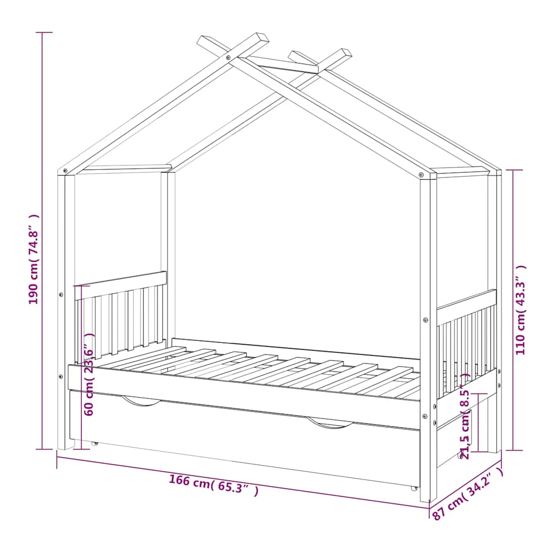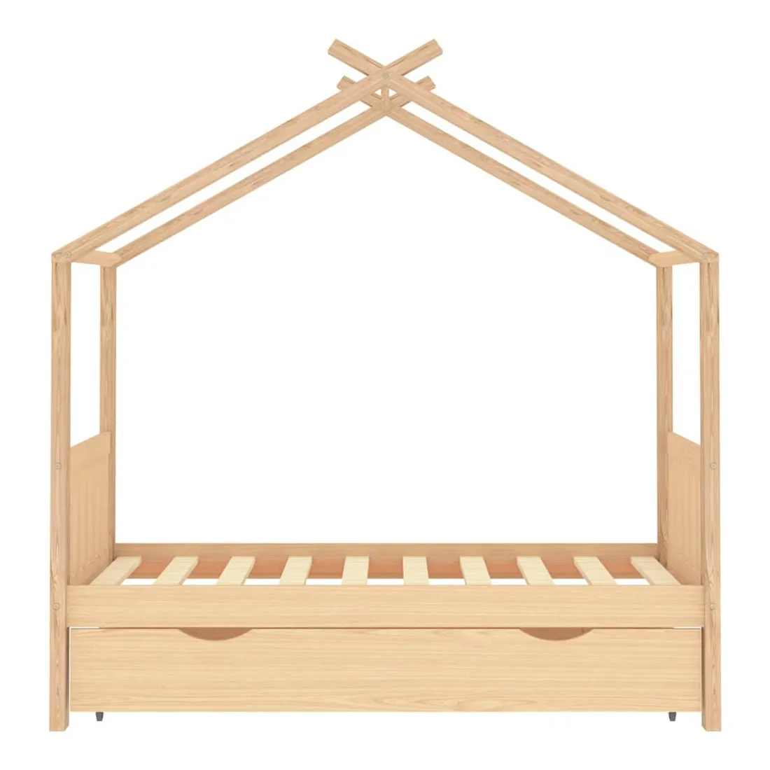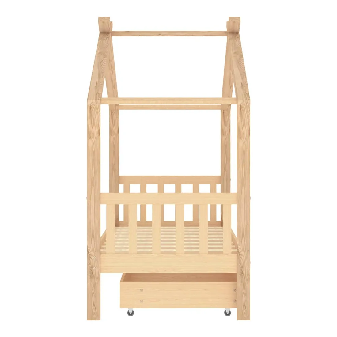 Ce cadre de lit enfant en bois avec tiroir est un supplément pratique et décoratif à la décoration de toute chambre à coucher. Le lit est intelligemment conçu avec un cadre de style maison d'arbre où vous pouvez accrocher des rideaux de lit pour créer de l'intimité pour votre enfant. Il peut aussi servir de soutien pour lire un livre ou de maisonnette pour votre enfant. Fabriqué en bois de pin massif, ce cadre de lit est extrêmement robuste et durable. Les lattes solides offrent le soutien nécessaire et sont très confortables. Le tiroir de lit inclus avec 2 poignées offre un grand espace de rangement pour ranger les vêtements pliés, les jouets, etc. et garder votre pièce propre et bien rangée. Les roues à glissement facile peuvent rouler sur la moquette et le parquet. Ce cadre de lit convient à un matelas mesurant 80 x 160 cm. Veuillez noter que la livraison comprend uniquement un cadre de lit, le matelas et les rideaux ne sont pas inclus. Le lit est facile à assembler. Vous pouvez consulter notre boutique pour les matelas assortis.