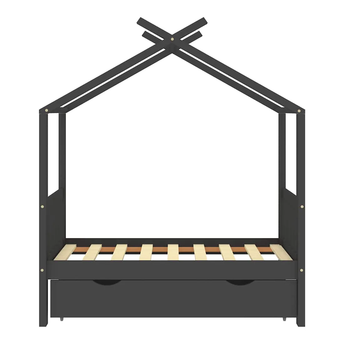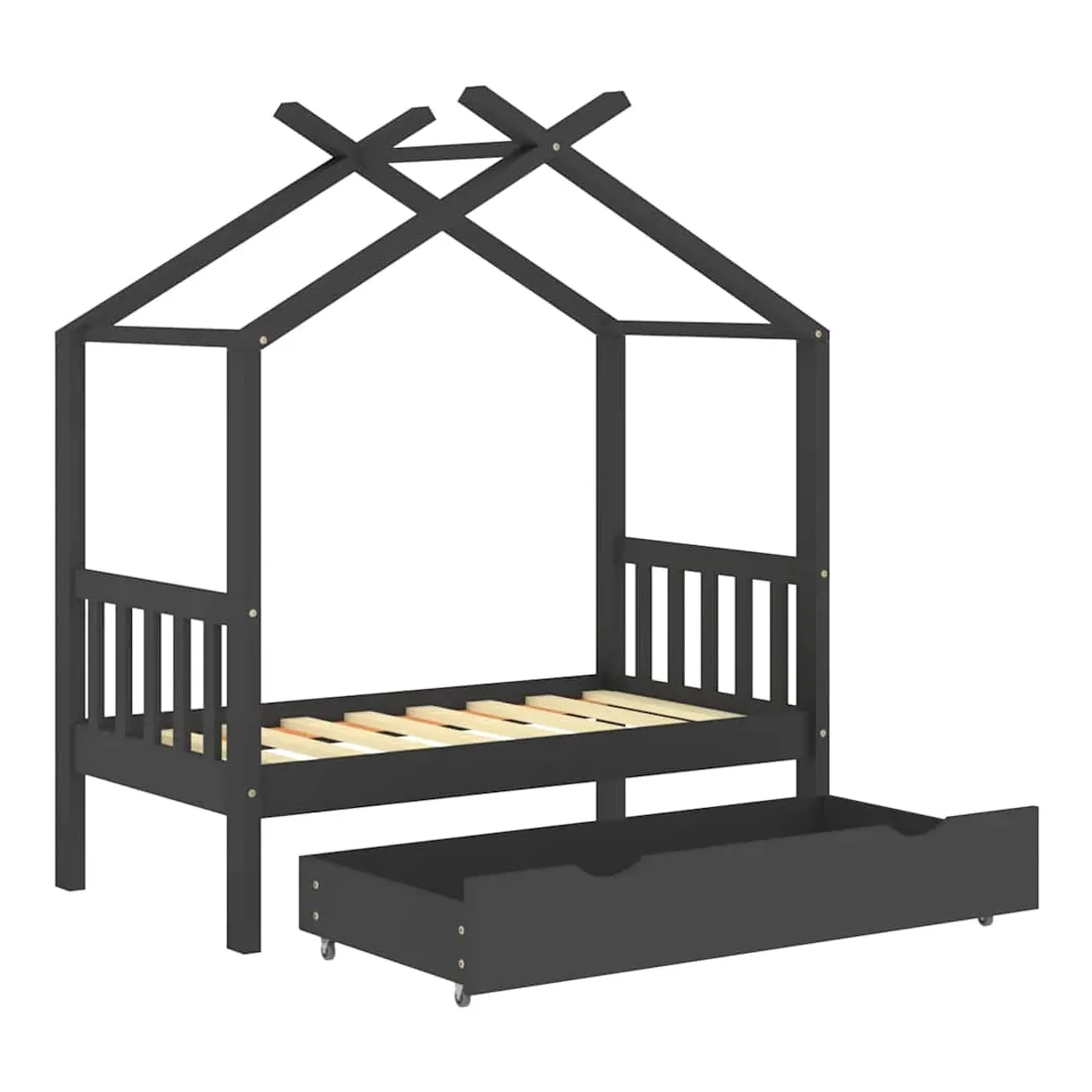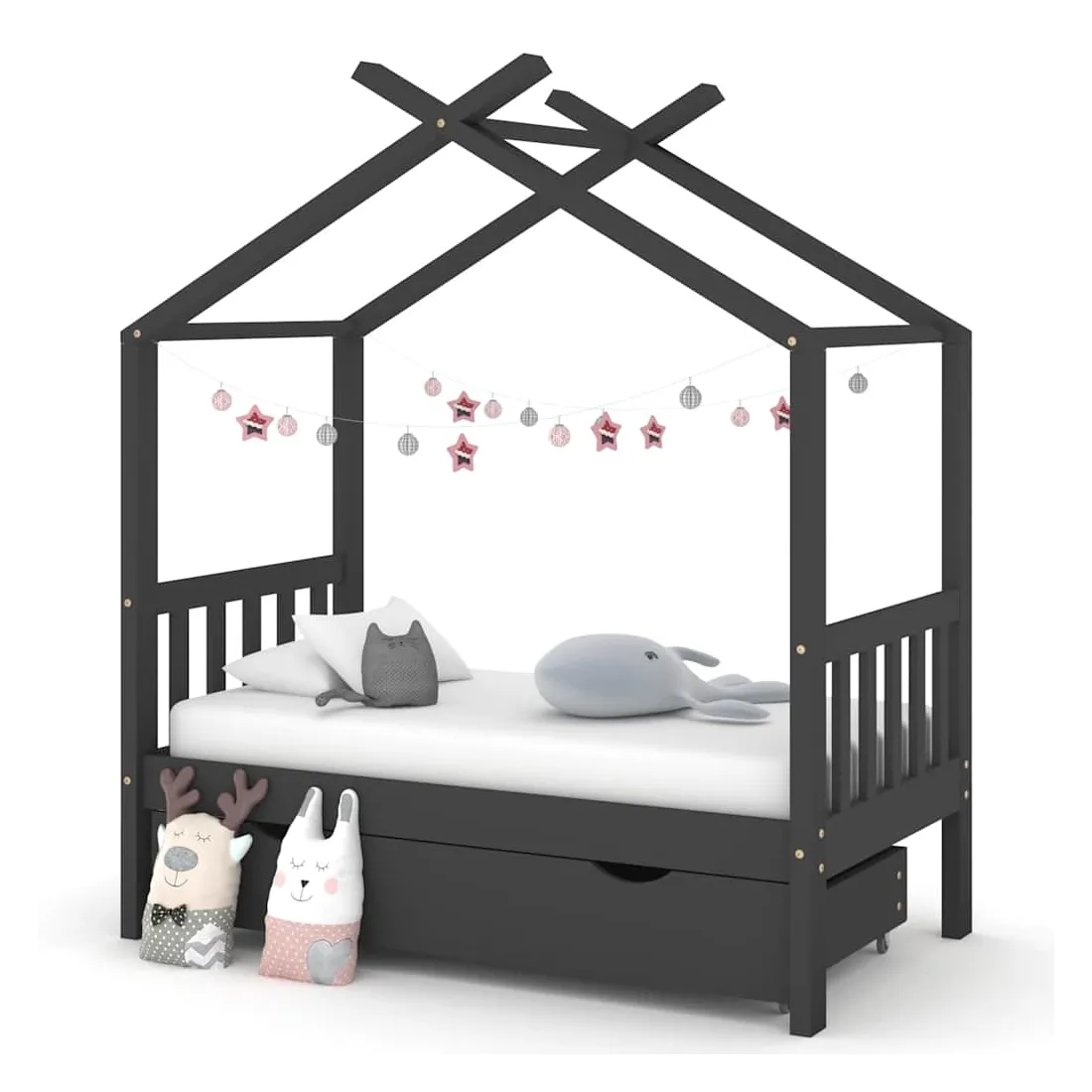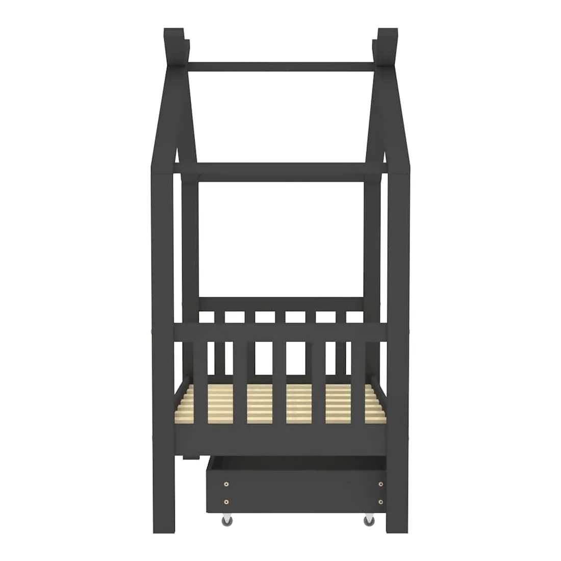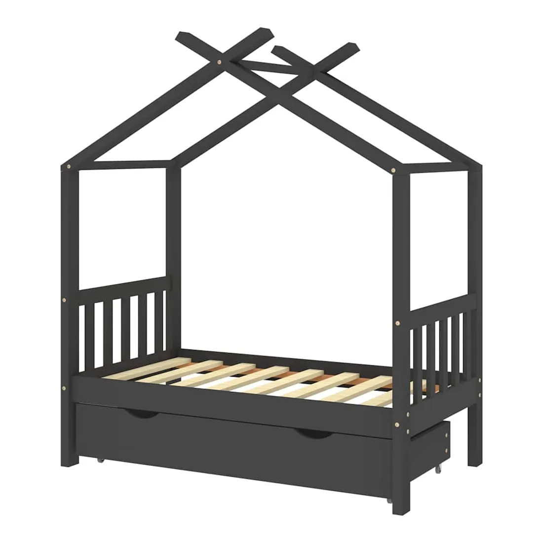 Ce cadre de lit enfant en bois avec tiroir est un supplément pratique et décoratif à la décoration de toute chambre à coucher. Le lit est intelligemment conçu avec un cadre de style maison d'arbre où vous pouvez accrocher des rideaux de lit pour créer de l'intimité pour votre enfant. Il peut aussi servir de soutien pour lire un livre ou de maisonnette pour votre enfant. Fabriqué en bois de pin massif, ce cadre de lit est extrêmement robuste et durable. Les lattes solides offrent le soutien nécessaire et sont très confortables. Le tiroir de lit inclus avec 2 poignées offre un grand espace de rangement pour ranger les vêtements pliés, les jouets, etc. et garder votre pièce propre et bien rangée. Les roues à glissement facile peuvent rouler sur la moquette et le parquet. Ce cadre de lit convient à un matelas mesurant 70 x 140 cm. Veuillez noter que la livraison comprend uniquement un cadre de lit, le matelas et les rideaux ne sont pas inclus. Le lit est facile à assembler. Vous pouvez consulter notre boutique pour les matelas assortis.