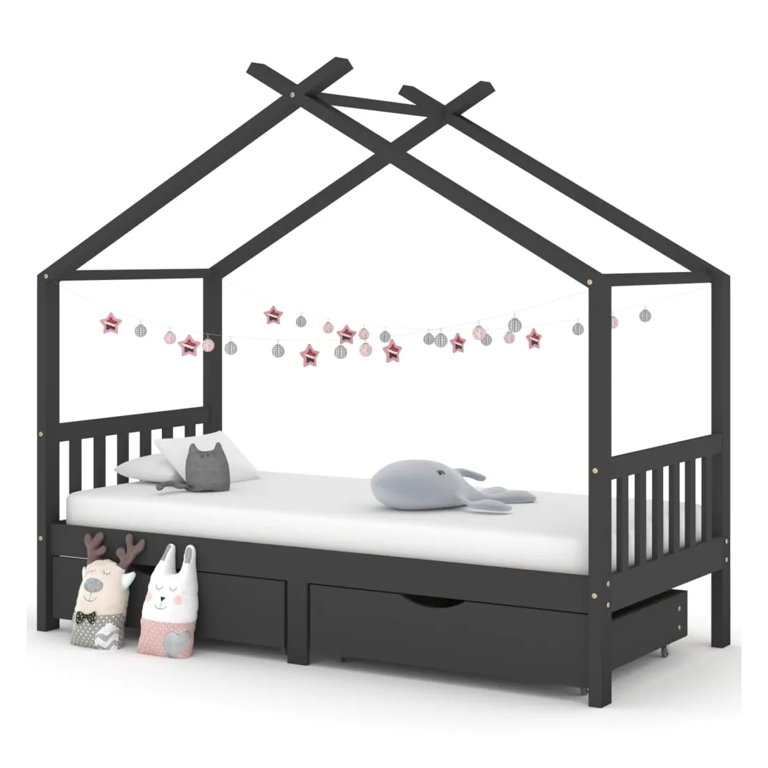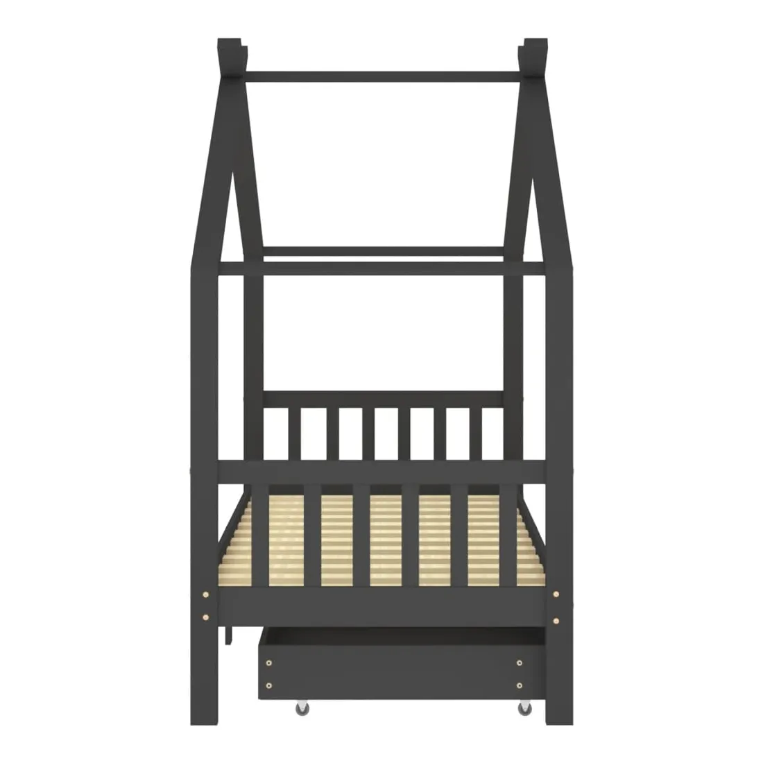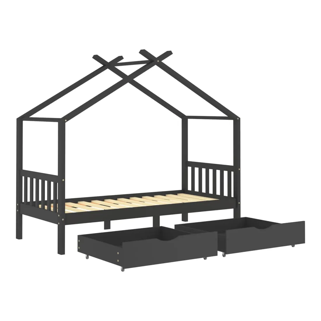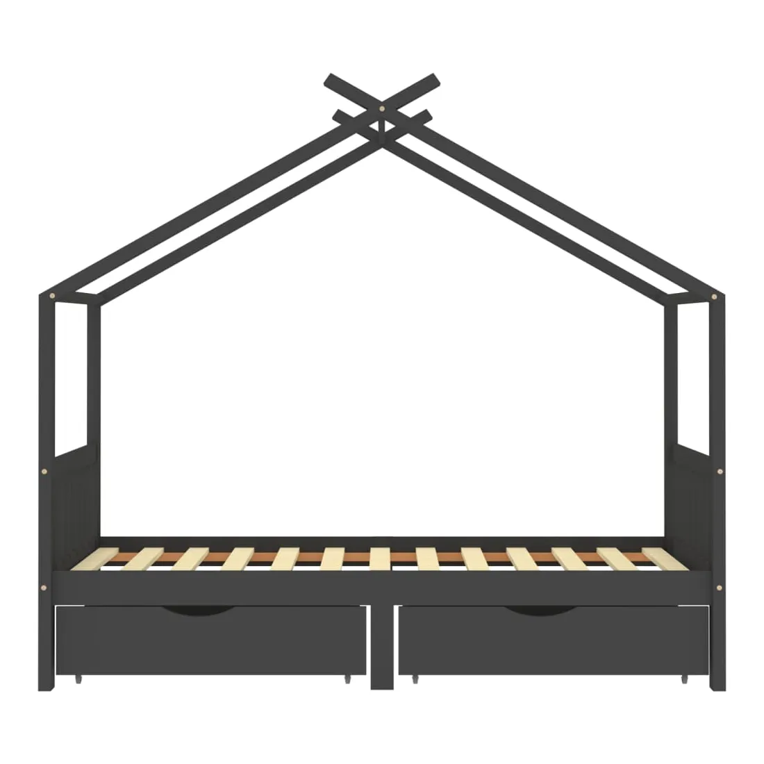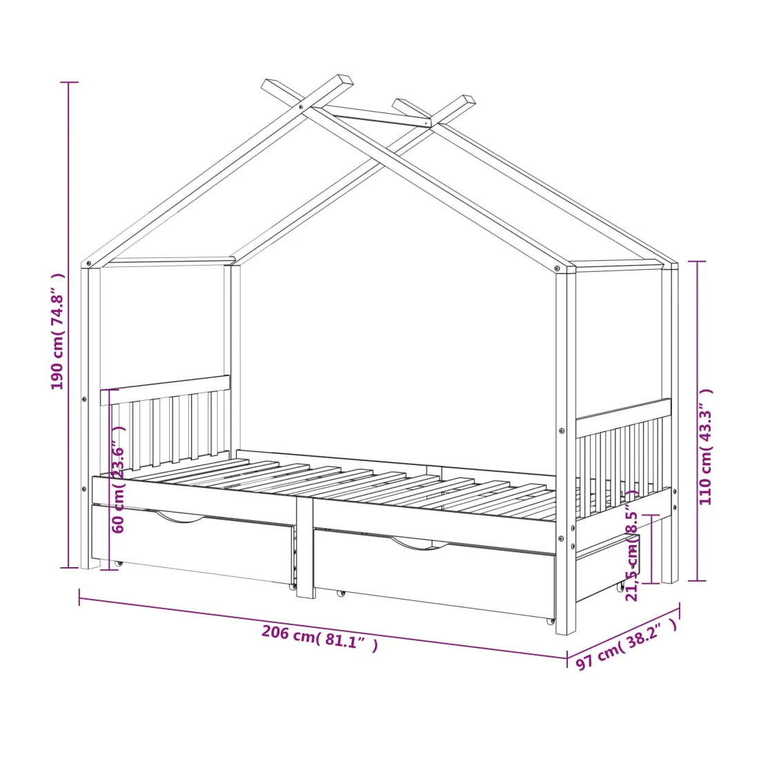 Ce cadre de lit d'enfant en bois avec tiroirs est un complément pratique et décoratif à la décoration de toute chambre à coucher. Le lit est intelligemment conçu avec un cadre de style cabane dans les arbres où vous pouvez accrocher des rideaux de lit pour créer de l'intimité pour votre enfant. Il peut également être utilisé comme un livre de lecture ou une maison de jeu pour votre enfant. Fabriqué en bois de pin massif, ce cadre de lit est extrêmement robuste et durable. Les lattes fortes offrent le soutien nécessaire et sont très confortables. Les tiroirs de lit inclus offrent un grand espace de rangement pour ranger des vêtements pliés, des jouets, etc., gardant votre pièce propre et bien rangée. Les roues à glissement facile peuvent fonctionner aussi bien sur de la moquette que sur des sols en bois. Ce cadre de lit convient à un matelas de 90 x 200 cm. Veuillez noter que la livraison inclut un cadre de lit seulement ; un matelas et les rideaux ne sont pas inclus. Le lit est facile à assembler. Vous pouvez chercher le matelas correspondant dans notre boutique.