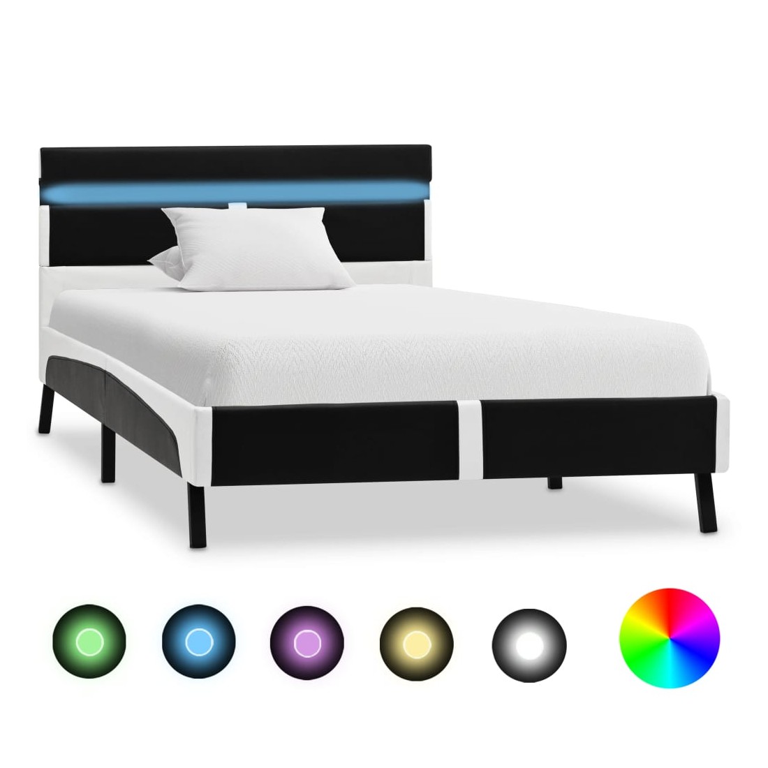 Fabriqué en MDF solide et robuste, ce lit robuste se caractérise par un design simple mais élégant, ainsi que par une construction solide. Les lattes de contreplaqué robustes ainsi que les pieds en acier offrent le soutien nécessaire et sont également confortables. Recouvert de similicuir durable, le lit dégage un look accueillant et est facile à entretenir. Ce lit à plateforme convient à un matelas de 200 x 90 cm. En outre, vous pouvez facilement régler la puissance, la luminosité et les différentes couleurs clignotantes de la bande lumineuse LED avec la télécommande à 24 touches entièrement fonctionnelle incluse pour créer un spectacle de lumière époustouflant. Veuillez noter que la livraison inclut un cadre de lit seulement ; un matelas n'est pas inclus. Le lit est facile à assembler. Vous pouvez chercher le matelas correspondant dans notre boutique. Remarque : ce produit est doté d'un connecteur USB, mais la source d'alimentation certifiée de USB 5V n'est pas incluse.