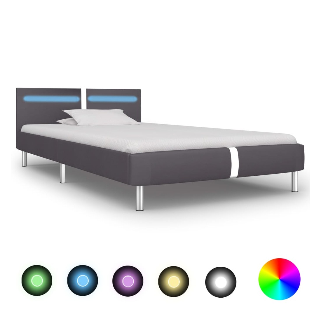 Ce cadre de lit classique avec une bande LED à changement de couleur deviendra l'attraction principale de votre chambre à coucher. Se distinguant par un design sobre mais élégant, ce cadre de lit ajoute une touche de charme élégant à la décoration de votre chambre à coucher. Fabriqué en bois et en acier, ce cadre de lit est extrêmement robuste et durable. Les pieds en bois solide ajoutent de la durabilité au lit. De plus, recouvert de similicuir durable, le lit dégage un look accueillant et se nettoie facilement. En outre, vous pouvez facilement régler la puissance, la luminosité et les différentes couleurs clignotantes de la bande lumineuse LED avec la télécommande à 24 touches entièrement fonctionnelle incluse pour créer un spectacle de lumière époustouflant. Ce cadre de lit convient à un matelas de 90 x 200 cm. Veuillez noter que la livraison inclut un cadre de lit seulement ; un matelas n'est pas inclus. Le lit est facile à assembler. Vous pouvez chercher le matelas correspondant dans notre boutique.