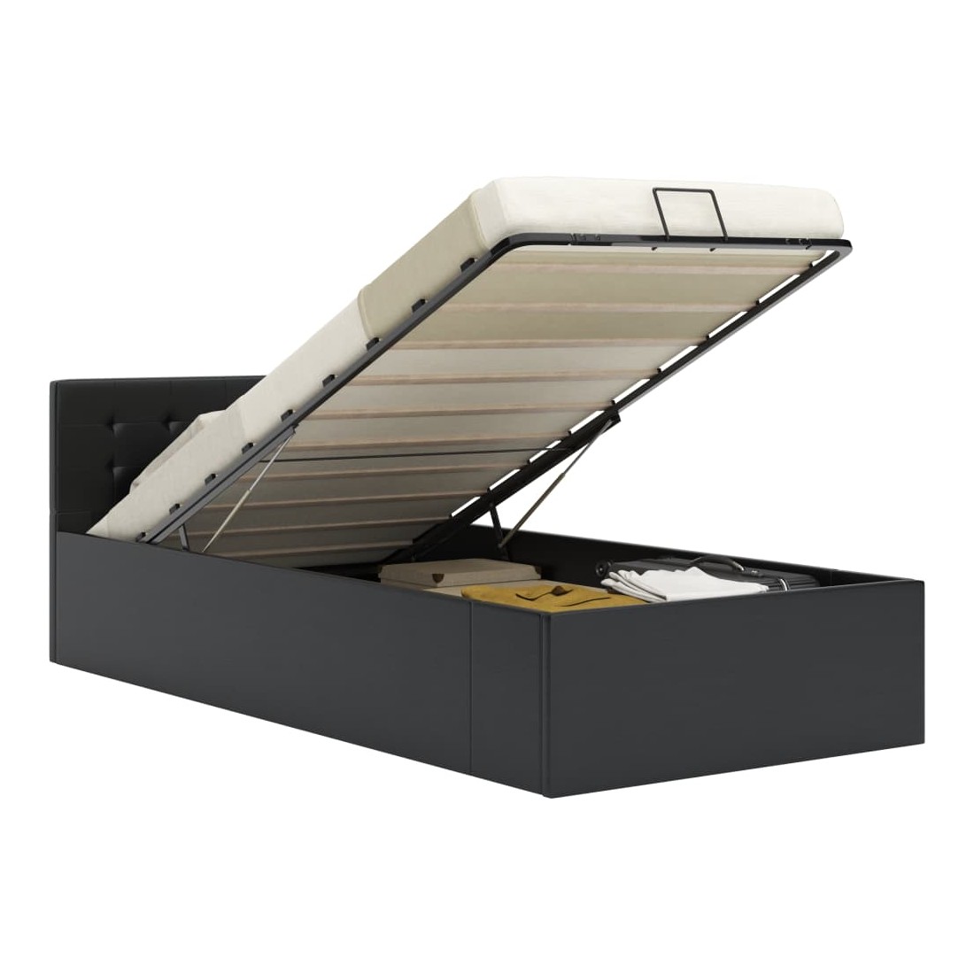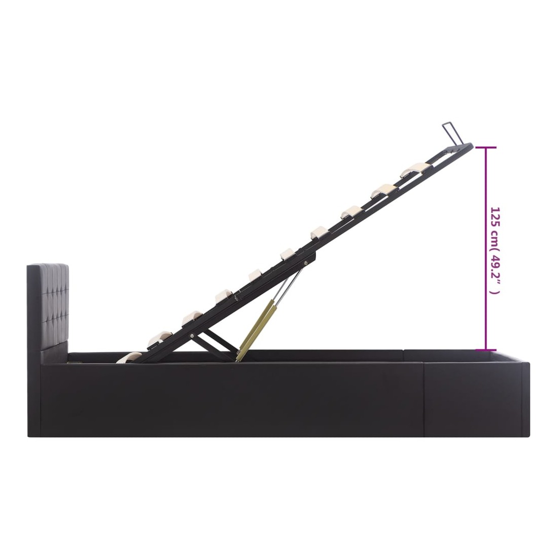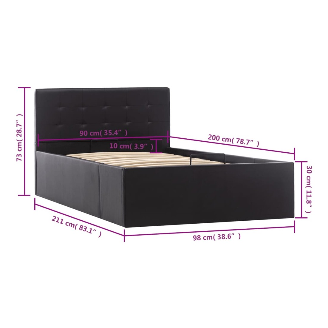 Ajoutez instantanément un goût moderne impressionnant à votre chambre à coucher grâce à notre cadre de lit en similicuir hydraulique ! Ce lit simple se caractérise par un design simple mais élégant, ainsi que par une construction solide, car il est fabriqué en MDF robuste et résistant. Ce lit rembourré transforme l'espace inutilisé sous le matelas en espace de rangement, avec suffisamment d'espace pour ranger les vêtements, les draps, les couvertures, etc. Le mécanisme de levage à gaz hydraulique facilite le soulèvement du matelas. Le sommier à lattes restera droit une fois soulevé pour vous laisser les deux mains libres d'enlever ou de stocker des articles en dessous. Le cadre en acier enduit de poudre et les lattes en contreplaqué ajoutent à la robustesse et à la durabilité du lit. Rembourré de similicuir brillant, ce lit à espace de rangement est accueillant et facile d'entretien. Ce produit est facile à assembler. Ce meuble de chambre à coucher convient à un matelas de 90 x 200 cm. Veuillez noter que la livraison inclut un cadre de lit seulement ; un matelas n'est pas inclus. Vous pouvez chercher le matelas correspondant dans notre boutique.