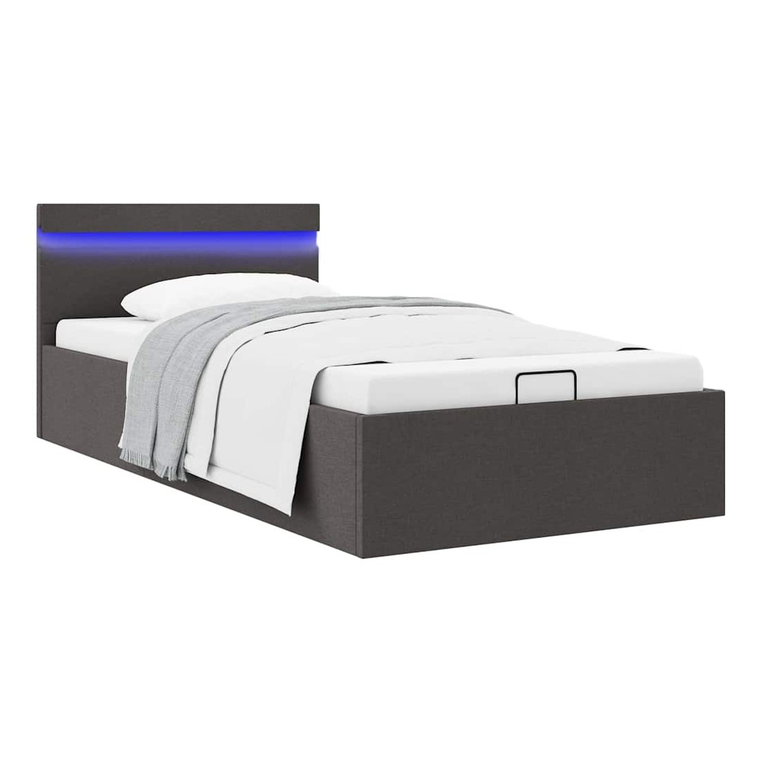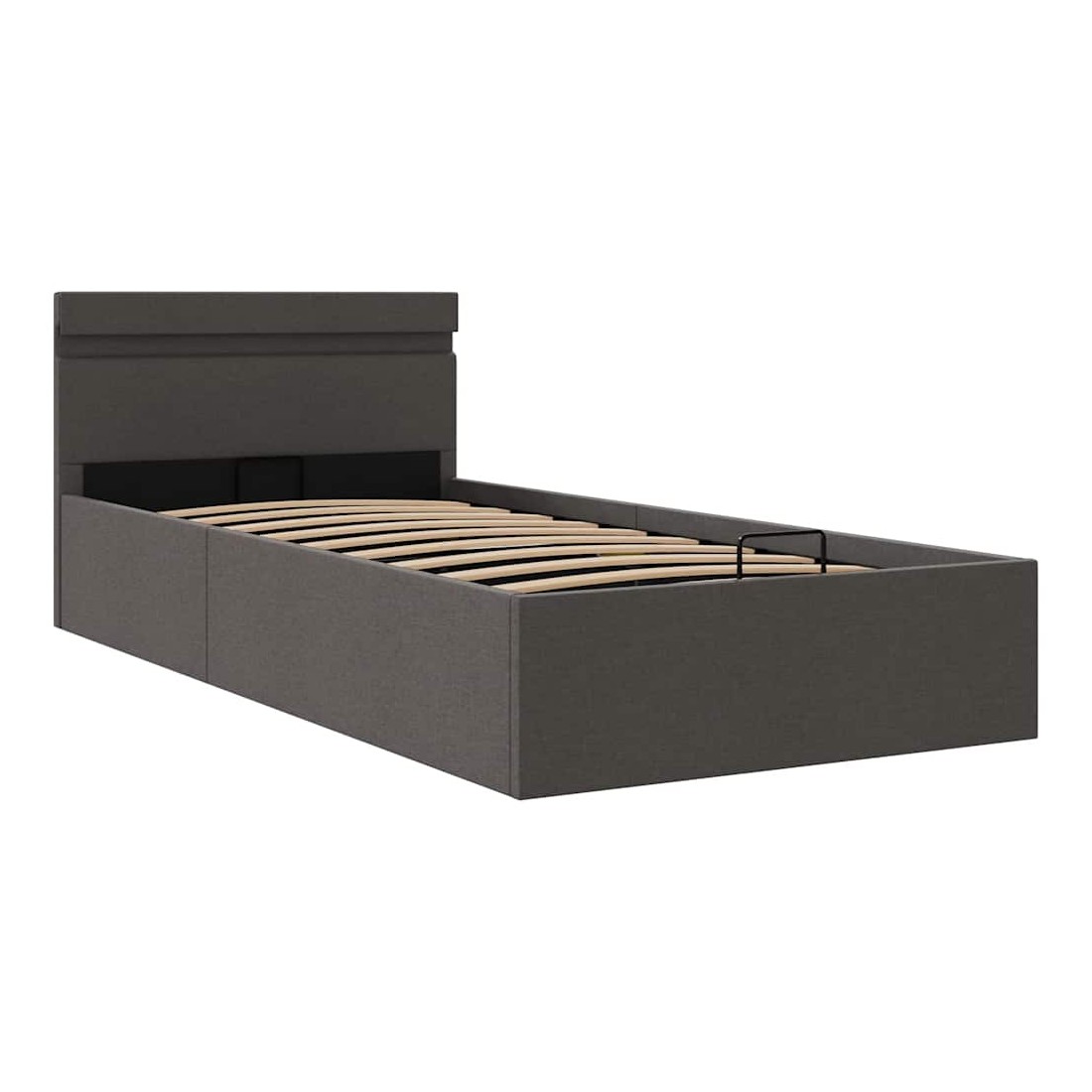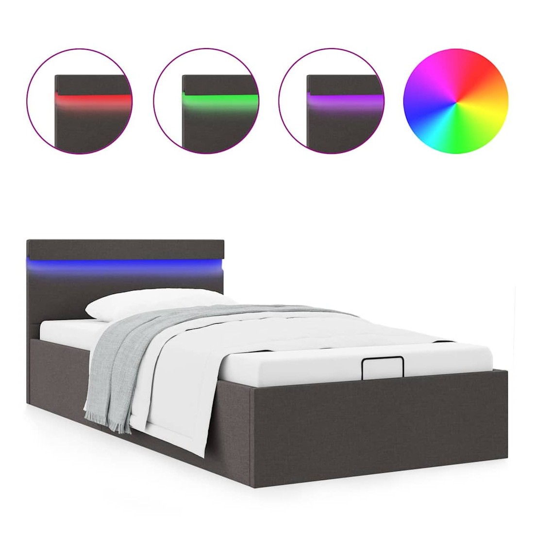 Ajoutez instantanément un goût moderne impressionnant à votre chambre à coucher grâce à notre cadre de lit en tissu hydraulique ! Ce lit simple se caractérise par un design simple mais élégant, ainsi que par une construction solide, car il est fabriqué en MDF robuste et résistant. Ce lit rembourré transforme l'espace inutilisé sous le matelas en espace de rangement, avec suffisamment d'espace pour ranger les vêtements, les draps, les couvertures, etc. Le mécanisme de levage à gaz hydraulique facilite le soulèvement du matelas. Le sommier à lattes restera droit une fois soulevé pour vous laisser les deux mains libres d'enlever ou de stocker des articles en dessous. Le cadre en acier enduit de poudre et les lattes en contreplaqué ajoutent à la robustesse et à la durabilité du lit. Recouvert de tissu durable, ce lit à espace de rangement semble accueillant et est facile à entretenir. Ce produit est facile à assembler. Ce meuble de chambre à coucher convient à un matelas de 90 x 200 cm. En outre, vous pouvez facilement régler la puissance, la luminosité et les différentes couleurs clignotantes de la bande lumineuse LED avec la télécommande pour créer un spectacle de lumière époustouflant. Veuillez noter que la livraison inclut un cadre de lit seulement ; un matelas n'est pas inclus. Vous pouvez chercher le matelas correspondant dans notre boutique. Remarque : ce produit est doté d'un connecteur USB, mais la source d'alimentation certifiée de USB 5V n'est pas incluse.
