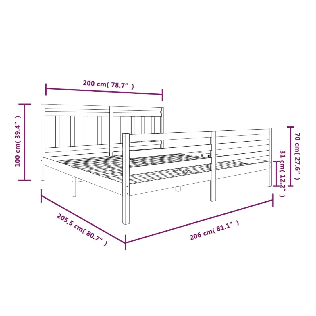 • Dimensions totales du cadre de lit : 205,5 x 206 x 100 cm (L x l x H)