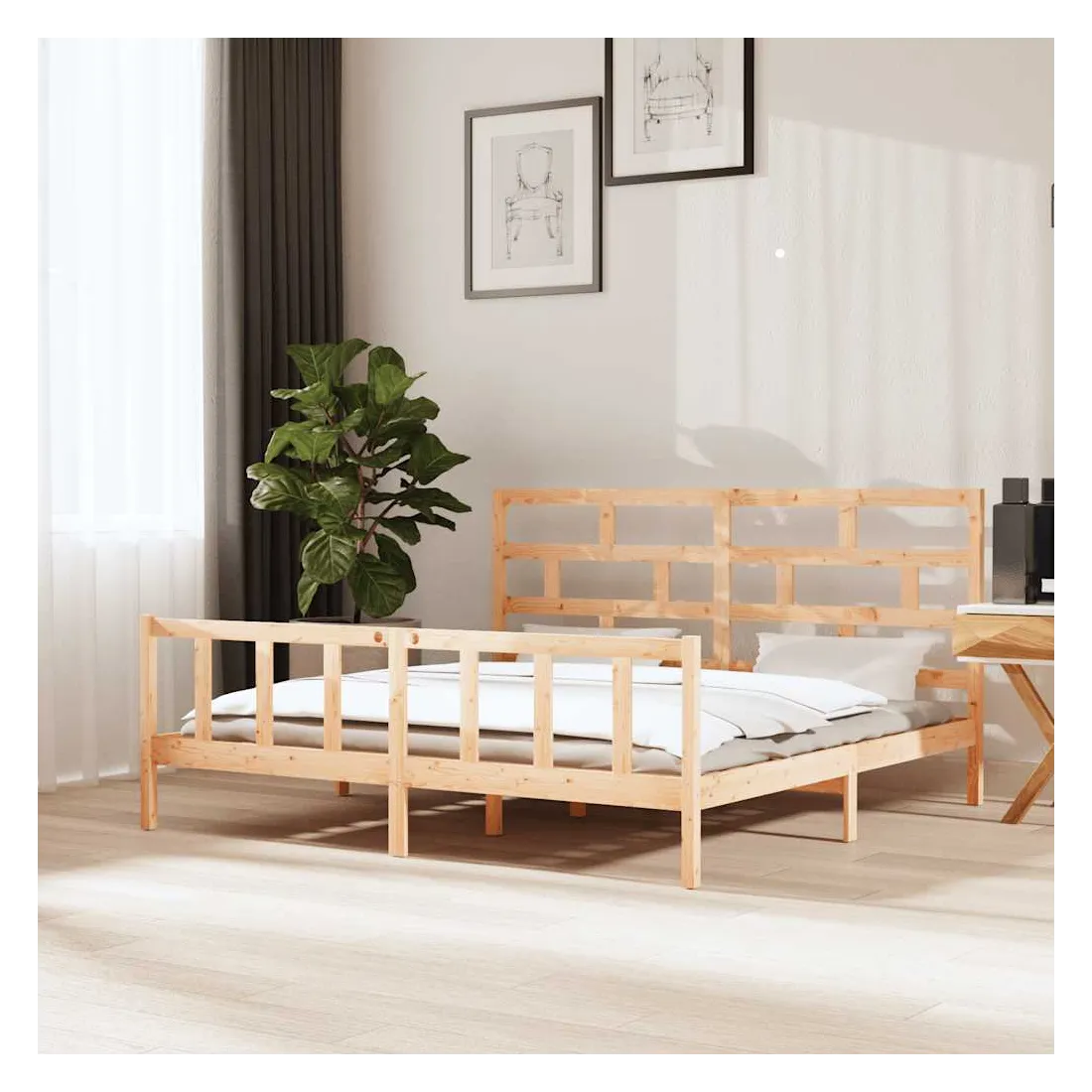 Prenez le chemin moderne vers votre chambre à coucher cool avec ce cadre de lit en bois ! Il constitue un supplément pratique et décoratif à votre intérieur. Matériau de première qualité : le bois de pin massif est un matériau naturel magnifique. Le bois de pin a un grain droit et les nœuds donnent au matériau son aspect caractéristique et rustique.Cadre robuste et stable : le cadre en bois assure robustesse et stabilité.Tête de lit confortable : la tête de lit classique vous permet de vous reposer confortablement lorsque vous lisez ou regardez un film.Design accrocheur : la conception de la tête et du pied de lit est à la fois décorative et pratique. Il ajoute un style et un confort uniques. Bon à savoir :La livraison comprend uniquement un cadre de lit. Le matelas n'est pas inclus. Vous pouvez consulter notre boutique pour trouver les matelas assortis.Certaines pièces de tête de lit sont emballées dans les cartons du cadre de lit en raison du manque d’espace.Ce cadre de lit convient à un matelas mesurant 180 x 200 cm (Super King).