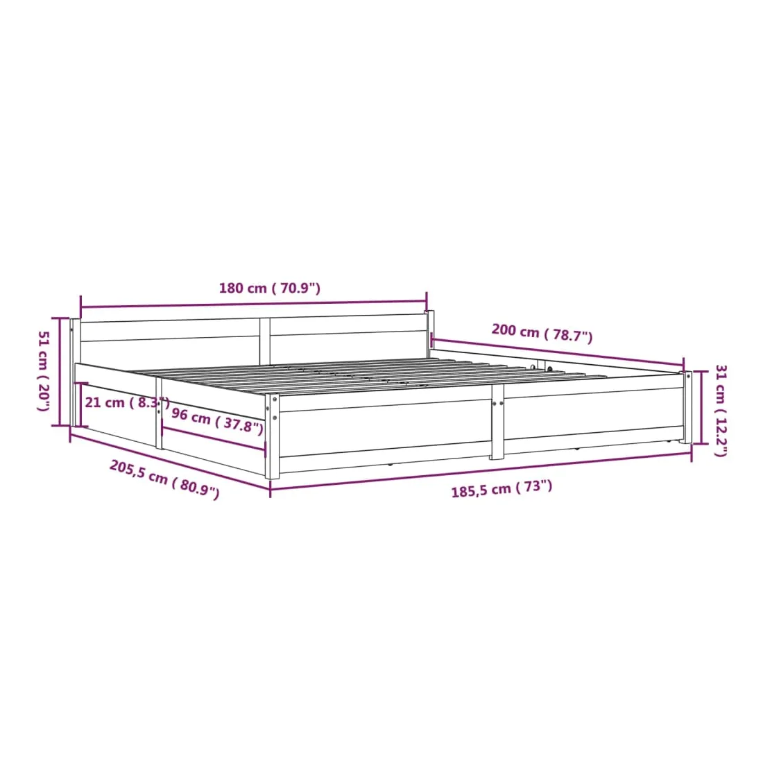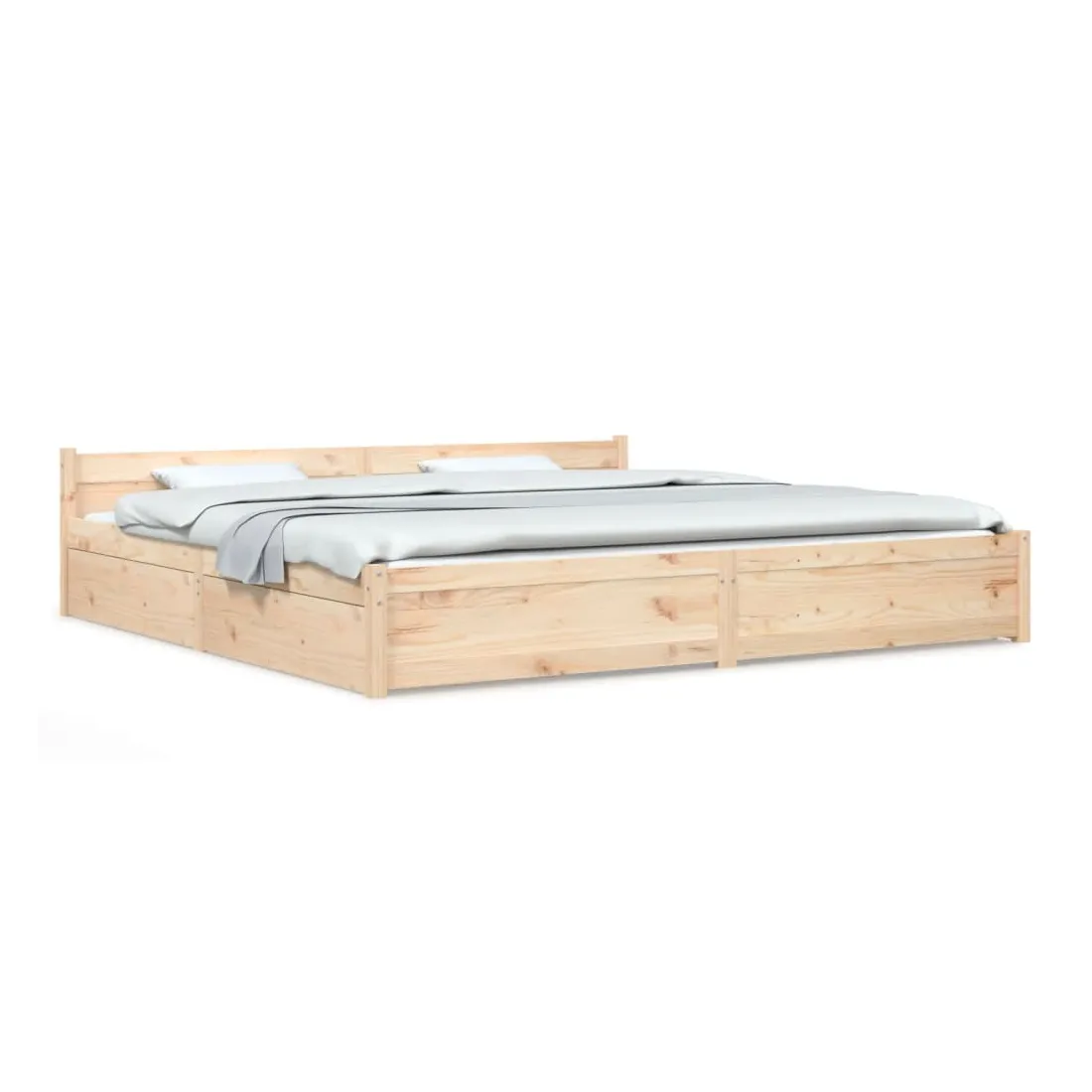 Ajoutez une touche moderne à votre chambre à coucher avec notre cadre de lit en bois classique ! Il apportera une touche pratique et décorative à votre intérieur. Bois de pin massif : le bois de pin massif est un matériau naturel magnifique. Le bois de pin a un grain droit et les nœuds donnent au matériau son aspect caractéristique et rustique.Lattes robustes : les lattes de contreplaqué assurent une bonne répartition du poids, garantissant que le matelas reste en place à chaque torsion de votre corps pendant le sommeil.Fonction de rangement : les tiroirs de lit inclus offrent suffisamment d'espace de rangement pour ranger vos articles essentiels, gardant votre pièce propre et bien rangée.Tête de lit confortable : la tête de lit classique vous permet de vous reposer confortablement lorsque vous lisez ou regardez un film. Remarque :La livraison comprend uniquement un cadre de lit. Le matelas n'est pas inclus. Vous pouvez consulter notre boutique pour trouver les matelas assortis.Ce cadre de lit convient à un matelas mesurant 180 x 200 cm (Super King).